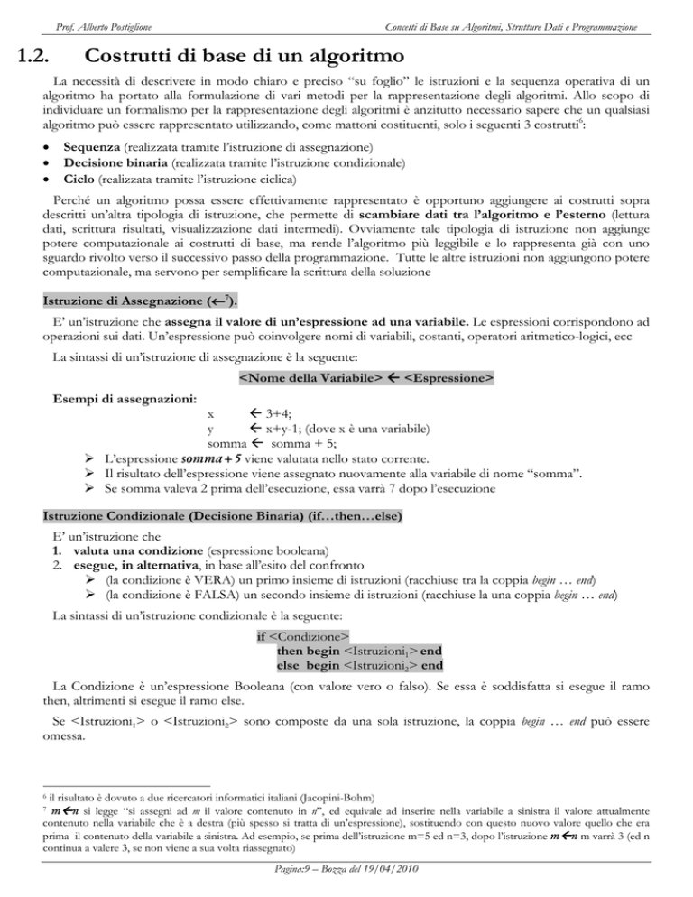 Prof. Alberto Postiglione 1.2. Concetti di Base su Algoritmi, Strutture Dati e Programmazione Costrutti di base di un algoritmo La necessità di descrivere in modo chiaro e preciso “su foglio” le istruzioni e la sequenza operativa di un algoritmo ha portato alla formulazione di vari metodi per la rappresentazione degli algoritmi. Allo scopo di individuare un formalismo per la rappresentazione degli algoritmi è anzitutto necessario sapere che un qualsiasi algoritmo può essere rappresentato utilizzando, come mattoni costituenti, solo i seguenti 3 costrutti6: Sequenza (realizzata tramite l’istruzione di assegnazione) Decisione binaria (realizzata tramite l’istruzione condizionale) Ciclo (realizzata tramite l’istruzione ciclica) Perché un algoritmo possa essere effettivamente rappresentato è opportuno aggiungere ai costrutti sopra descritti un’altra tipologia di istruzione, che permette di scambiare dati tra l’algoritmo e l’esterno (lettura dati, scrittura risultati, visualizzazione dati intermedi). Ovviamente tale tipologia di istruzione non aggiunge potere computazionale ai costrutti di base, ma rende l’algoritmo più leggibile e lo rappresenta già con uno sguardo rivolto verso il successivo passo della programmazione. Tutte le altre istruzioni non aggiungono potere computazionale, ma servono per semplificare la scrittura della soluzione Istruzione di Assegnazione (7). E’ un’istruzione che assegna il valore di un’espressione ad una variabile. Le espressioni corrispondono ad operazioni sui dati. Un’espressione può coinvolgere nomi di variabili, costanti, operatori aritmetico-logici, ecc La sintassi di un’istruzione di assegnazione è la seguente: <Nome della Variabile> <Espressione> Esempi di assegnazioni: x 3+4; y x+y-1; (dove x è una variabile) somma somma + 5; L’espressione somma+5 viene valutata nello stato corrente. Il risultato dell’espressione viene assegnato nuovamente alla variabile di nome “somma”. Se somma valeva 2 prima dell’esecuzione, essa varrà 7 dopo l’esecuzione Istruzione Condizionale (Decisione Binaria) (if…then…else) E’ un’istruzione che 1. valuta una condizione (espressione booleana) 2. esegue, in alternativa, in base all’esito del confronto (la condizione è VERA) un primo insieme di istruzioni (racchiuse tra la coppia begin … end) (la condizione è FALSA) un secondo insieme di istruzioni (racchiuse la una coppia begin … end) La sintassi di un’istruzione condizionale è la seguente: if <Condizione> then begin <Istruzioni1> end else begin <Istruzioni2> end La Condizione è un’espressione Booleana (con valore vero o falso). Se essa è soddisfatta si esegue il ramo then, altrimenti si esegue il ramo else. Se <Istruzioni1> o <Istruzioni2> sono composte da una sola istruzione, la coppia begin … end può essere omessa. il risultato è dovuto a due ricercatori informatici italiani (Jacopini-Bohm) mn si legge “si assegni ad m il valore contenuto in n”, ed equivale ad inserire nella variabile a sinistra il valore attualmente contenuto nella variabile che è a destra (più spesso si tratta di un’espressione), sostituendo con questo nuovo valore quello che era prima il contenuto della variabile a sinistra. Ad esempio, se prima dell’istruzione m=5 ed n=3, dopo l’istruzione mn m varrà 3 (ed n continua a valere 3, se non viene a sua volta riassegnato) 6 7 Pagina:9 – Bozza del 19/04/2010 Prof. Alberto Postiglione Concetti di Base su Algoritmi, Strutture Dati e Programmazione Istruzione Ciclica (while … do) E’ un’istruzione che 1. valuta una condizione (espressione booleana) 2. finchè la condizione si mantiene VERA: esegue un insieme di istruzioni (racchiuse tra la coppia begin … end) e torna al passo 1 3. Quando la condizione diventa FALSA: esce dal ciclo, cioè si passa all’istruzione immediatamente successiva l’end del ciclo La sintassi di un’istruzione ciclica è la seguente: while <Condizione> do begin <Lista Istruzioni> end; La condizione può risultare falsa alla prima esecuzione: in questo caso l'algoritmo esce dal ciclo senza aver mai eseguito le istruzioni interne. Se <Lista istruzioni> è composta da una sola istruzione, la coppia begin … end può essere omessa Pagina:10 – Bozza del 19/04/2010