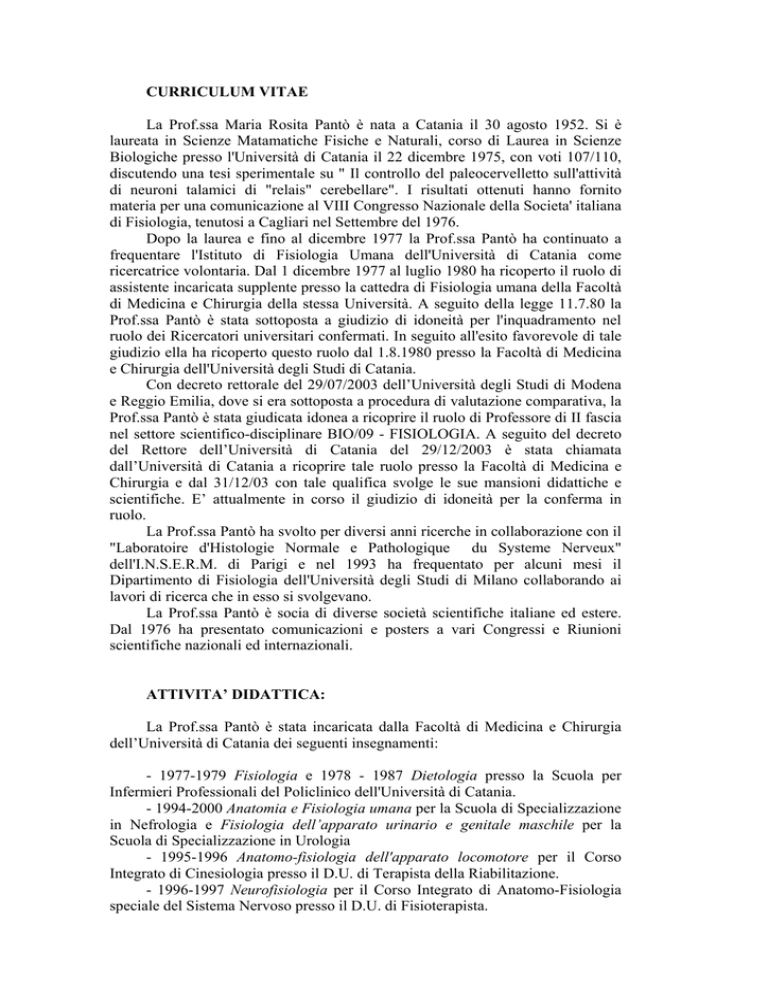 CURRICULUM VITAE La Prof.ssa Maria Rosita Pantò è nata a Catania il 30 agosto 1952. Si è laureata in Scienze Matamatiche Fisiche e Naturali, corso di Laurea in Scienze Biologiche presso l'Università di Catania il 22 dicembre 1975, con voti 107/110, discutendo una tesi sperimentale su " Il controllo del paleocervelletto sull'attività di neuroni talamici di "relais" cerebellare". I risultati ottenuti hanno fornito materia per una comunicazione al VIII Congresso Nazionale della Societa' italiana di Fisiologia, tenutosi a Cagliari nel Settembre del 1976. Dopo la laurea e fino al dicembre 1977 la Prof.ssa Pantò ha continuato a frequentare l'Istituto di Fisiologia Umana dell'Università di Catania come ricercatrice volontaria. Dal 1 dicembre 1977 al luglio 1980 ha ricoperto il ruolo di assistente incaricata supplente presso la cattedra di Fisiologia umana della Facoltà di Medicina e Chirurgia della stessa Università. A seguito della legge 11.7.80 la Prof.ssa Pantò è stata sottoposta a giudizio di idoneità per l'inquadramento nel ruolo dei Ricercatori universitari confermati. In seguito all'esito favorevole di tale giudizio ella ha ricoperto questo ruolo dal 1.8.1980 presso la Facoltà di Medicina e Chirurgia dell'Università degli Studi di Catania. Con decreto rettorale del 29/07/2003 dell’Università degli Studi di Modena e Reggio Emilia, dove si era sottoposta a procedura di valutazione comparativa, la Prof.ssa Pantò è stata giudicata idonea a ricoprire il ruolo di Professore di II fascia nel settore scientifico-disciplinare BIO/09 - FISIOLOGIA. A seguito del decreto del Rettore dell’Università di Catania del 29/12/2003 è stata chiamata dall’Università di Catania a ricoprire tale ruolo presso la Facoltà di Medicina e Chirurgia e dal 31/12/03 con tale qualifica svolge le sue mansioni didattiche e scientifiche. E’ attualmente in corso il giudizio di idoneità per la conferma in ruolo. La Prof.ssa Pantò ha svolto per diversi anni ricerche in collaborazione con il "Laboratoire d'Histologie Normale e Pathologique du Systeme Nerveux" dell'I.N.S.E.R.M. di Parigi e nel 1993 ha frequentato per alcuni mesi il Dipartimento di Fisiologia dell'Università degli Studi di Milano collaborando ai lavori di ricerca che in esso si svolgevano. La Prof.ssa Pantò è socia di diverse società scientifiche italiane ed estere. Dal 1976 ha presentato comunicazioni e posters a vari Congressi e Riunioni scientifiche nazionali ed internazionali. ATTIVITA’ DIDATTICA: La Prof.ssa Pantò è stata incaricata dalla Facoltà di Medicina e Chirurgia dell’Università di Catania dei seguenti insegnamenti: - 1977-1979 Fisiologia e 1978 - 1987 Dietologia presso la Scuola per Infermieri Professionali del Policlinico dell'Università di Catania. - 1994-2000 Anatomia e Fisiologia umana per la Scuola di Specializzazione in Nefrologia e Fisiologia dell’apparato urinario e genitale maschile per la Scuola di Specializzazione in Urologia - 1995-1996 Anatomo-fisiologia dell'apparato locomotore per il Corso Integrato di Cinesiologia presso il D.U. di Terapista della Riabilitazione. - 1996-1997 Neurofisiologia per il Corso Integrato di Anatomo-Fisiologia speciale del Sistema Nervoso presso il D.U. di Fisioterapista. - Dal 1998 a tutt’oggi Fisiologia umana per il Corso Integrato di Fisiologia della Nutrizione e dal 1999 Fisiologia umana per il Corso Integrato di Fisiopatologia della nutrizione presso il D.U., oggi CdL, di Dietista. - Dal 2000 a tutt’oggi Fisiologia umana per il Corso Integrato di AnatomoFisiologia ed Istologia presso il D.U., oggi CdL, di Igienista dentale. - Dal 2002 a tutt’oggi Fisiologia umana per il Corso Integrato di Scienze Morfofunzionali per i 7 CCdL facenti capo alla Classe III (Dietistica, Igienista dentale, Tecnico di Radiologia Medica per Immagini e Radioterapia, Tecnico Sanitario di Laboratorio Biomedico, Tecniche Audiometriche, Tecnico Audioprotesista, Tecnico di Neurofisiopatologia). - Dal 1994 Fisiologia della Nutrizione per il Corso Integrato di Fisiologia I (Polo C) e dal 2003 Fisiologia del Sistema Endocrino per il Corso Integrato di Fisiologia II (Polo C) della Facoltà di Medicina e Chirurgia. - Dal 2004 a tutt’oggi Didattica della Fisiologia e Nutrizione umana presso la Scuola Interuniversitaria Siciliana di Specializzazione per l’Insegnamento nella Scuola Secondaria (SISSIS). La Prof.ssa Pantò svolge regolarmente le lezioni concernenti gli insegnamenti sopra elencati e lezioni integrative su vari argomenti della fisiologia del sistema nervoso, del tessuto muscolare liscio e striato e degli apparati digerente, endocrino e circolatorio. Inoltre, la Dott.ssa Pantò tiene esercitazioni teorico-pratiche per gli studenti dei corsi di Fisiologia generale e umana che comportano anche l'utilizzo da parte degli studenti di apparecchiature di laboratorio, guida gli studenti in ricerche bibliografiche al fine di approfondire argomenti specifici ed istruisce gli allievi interni sulle moderne tecniche elettrofisiologiche (macro- e micro-stimolazione, derivazione extra- ed intracellulare), neuroanatomiche (comprendenti l'uso di traccianti quali l'HRPWGA, Fluorogold, Rodamina, BDA, ecc.), immunoistochimiche (che prevedono l'uso di diversi anticorpi e relative tecniche di sviluppo), microscopiche, di elaborazione computerizzata e sulle analisi statistiche necessarie per la valutazione dei risultati sperimentali. La Prof.ssa Pantò ha svolto attività di tutorato per studenti a lei assegnati dalla Facoltà di Medicina e Chirurgia, assistendoli nello svolgimento del piano di studi, nella definizione dei propri interessi, nell'analisi delle difficoltà e nell'adozione di efficaci modalità di organizzazione degli studi e collaborando a definire il completamento dell'iter formativo, con riferimento al contenuto allargato delle opportunità offerte dall'intero contesto universitario e dalle strutture ad esso collegate (stages formativi, collaborazione di ricerche in atto, borse di 