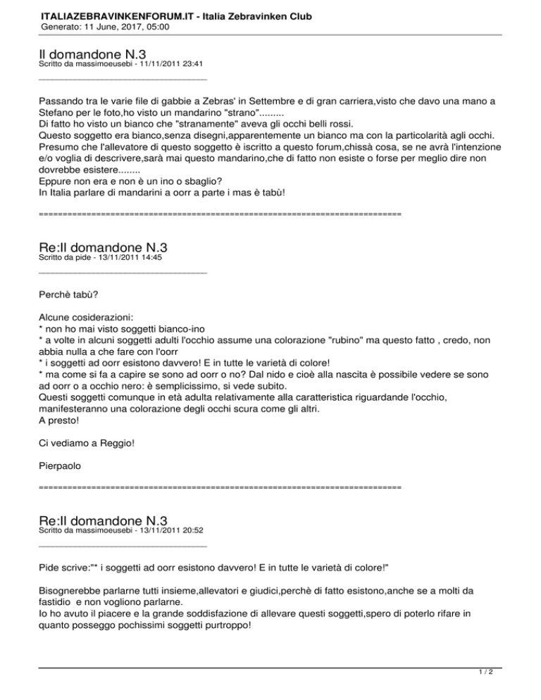 ITALIAZEBRAVINKENFORUM.IT - Italia Zebravinken Club Generato: 11 June, 2017, 05:00 Il domandone N.3 Scritto da massimoeusebi - 11/11/2011 23:41 _____________________________________ Passando tra le varie file di gabbie a Zebras' in Settembre e di gran carriera,visto che davo una mano a Stefano per le foto,ho visto un mandarino "strano"......... Di fatto ho visto un bianco che "stranamente" aveva gli occhi belli rossi. Questo soggetto era bianco,senza disegni,apparentemente un bianco ma con la particolarità agli occhi. Presumo che l'allevatore di questo soggetto è iscritto a questo forum,chissà cosa, se ne avrà l'intenzione e/o voglia di descrivere,sarà mai questo mandarino,che di fatto non esiste o forse per meglio dire non dovrebbe esistere........ Eppure non era e non è un ino o sbaglio? In Italia parlare di mandarini a oorr a parte i mas è tabù! ============================================================================ Re:Il domandone N.3 Scritto da pide - 13/11/2011 14:45 _____________________________________ Perchè tabù? Alcune cosiderazioni: * non ho mai visto soggetti bianco-ino * a volte in alcuni soggetti adulti l'occhio assume una colorazione "rubino" ma questo fatto , credo, non abbia nulla a che fare con l'oorr * i soggetti ad oorr esistono davvero! E in tutte le varietà di colore! * ma come si fa a capire se sono ad oorr o no? Dal nido e cioè alla nascita è possibile vedere se sono ad oorr o a occhio nero: è semplicissimo, si vede subito. Questi soggetti comunque in età adulta relativamente alla caratteristica riguardande l'occhio, manifesteranno una colorazione degli occhi scura come gli altri. A presto! Ci vediamo a Reggio! Pierpaolo ============================================================================ Re:Il domandone N.3 Scritto da massimoeusebi - 13/11/2011 20:52 _____________________________________ Pide scrive:"* i soggetti ad oorr esistono davvero! E in tutte le varietà di colore!" Bisognerebbe parlarne tutti insieme,allevatori e giudici,perchè di fatto esistono,anche se a molti da fastidio e non vogliono parlarne. Io ho avuto il piacere e la grande soddisfazione di allevare questi soggetti,spero di poterlo rifare in quanto posseggo pochissimi soggetti purtroppo! 1/2 ITALIAZEBRAVINKENFORUM.IT - Italia Zebravinken Club Generato: 11 June, 2017, 05:00 I soggetti a oorr si riconoscono anche dalla colorazione del mantello,dai disegni distintivi ecc. Qual'è dunque la domanda? Perchè in alcuni paesi europei vengono riconosciuti (eccezzion fatta per i mas) e in altri no? Esistono forse giudici e allevatori che riconoscono i mandarini a oorr e altri no? Se non erro esiste un mandarino soltanto! ============================================================================ Re:Il domandone N.3 Scritto da pide - 13/11/2011 23:01 _____________________________________ I soggetti a oorr si riconoscono anche dalla colorazione del mantello,dai disegni distintivi ecc. ......Ovvio, ma attento Max, questa è roba per intenditori! Al neofita certe "sfumature" sfuggono ...... non se ne parla perchè a volte questi soggetti sono la "chiave" intermedia per arrivare a certi risultati ..... A presto Buona notte! ============================================================================ Re:Il domandone N.3 Scritto da massimoeusebi - 15/11/2011 21:51 _____________________________________ pide ha scritto: I soggetti a oorr si riconoscono anche dalla colorazione del mantello,dai disegni distintivi ecc. ......Ovvio, ma attento Max, questa è roba per intenditori! Al neofita certe "sfumature" sfuggono ...... non se ne parla perchè a volte questi soggetti sono la "chiave" intermedia per arrivare a certi risultati ..... A presto Buona notte! Secondo me è proprio così !!!!! ;) E' bello parlare la stessa lingua! ============================================================================ 2/2