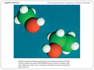 Numeri quantici n, l, m Regole Auf-Bau Principio di eclusione Pauli Regola di Hund E Periodicità Chimica Chimica generale ed Inorganica: Chimica Generale Volume atomico (Meyer) FIGURA 10-1 Una illustrazione della legge periodica - la variazione del volume atomico con il numero atomico Quando gli elementi sono disposti in ordine crescente di massa atomica, alcune proprietà ricorrono con periodicità Oltre il volume altre proprietà ricorrono periodicamente, durezza comprimibilità punti di ebollizione Periodicità Chimica Chimica generale ed Inorganica: Chimica Generale La tavola periodica è costituita da 18 gruppi Periodicità Chimica periodicità nei raggi atomici FIGURA 10-4 Raggi atomici In un atomo maggiore è il numero di livelli elettronici e maggiore è la sua dimensione. Nel gruppo il raggio atomico aumenta dall’alto al basso pm=10-12m Chimica generale ed Inorganica: Chimica Generale Periodicità Chimica Chimica generale ed Inorganica: Chimica Generale metalli non metalli e metalloidi Raggi atomici, covalenti e ionici Periodicità Chimica Chimica generale ed Inorganica: Chimica Generale andamenti periodici dei raggi FIGURA 10-8 Un confronto tra alcuni raggi atomici e ionici Periodicità Chimica Chimica generale ed Inorganica: Chimica Generale Energia di ionizzazione Periodicità Chimica Chimica generale ed Inorganica: Chimica Generale Energie di ionizzazione nel primo periodo Periodicità Chimica Chimica generale ed Inorganica: Chimica Generale Affinità elettronica FIGURA 10-9 Energie di prima ionizazione in funzione del numero atomico EA è una misura della variazione di energia che si verfica quando un atomo gassoso acquista elettroni: F(g) + e- F-(g) EA= -328kJ/mol si ha emissione di energia e il processo si dice esotermico Trasformandosi in F- l’atomo di fluoro passa da 1s22s22p5 + e- a 1s22s22p6 ossia la configurazione elettronica del Neon. ELETTRONEGATIVITÀ (EN) L’elettronegatività descrive la capacità di un atomo di competere per gli elettroni di legame Con gli altri atomi al quale è legato . La differenza di elettronegatività tra due atomi permette di quantizzare il carattere polare di un legame covalente tra i due atomi. Periodicità Chimica Chimica generale ed Inorganica: Chimica Generale andamenti periodici FIGURA 10-11 Proprietà atomiche e tabella periodica – Un riassunto LEGAME CHIMICO - TEORIA DI LEWIS La configurazione elettronica dei gas nobili è responsabile della loro inerzia chimica. Gli atomi degli altri elementi si combinano tra loro per raggiungere le configurazioni elettroniche dei gas nobili Gli elettroni esterni (di valenza), giocano un ruolo fondamentale nel legame chimico In alcuni casi gli elettroni vengono trasferiti da un atomo ad un altro (Legami ionici) In altri casi due o più coppie di elettroni vengono condivise tra gli atomi (Legami Covalenti) Ottetto (doppietto per l’idrogeno) Elettroni di valenza Li BBe Carbonio HHe Legame Chimico I Chimica generale ed Inorganica: Chimica Generale elettroni di core e di valenza legame ionico Na+ Cllegame covalente Cl—Cl legame covalente polare Li—Cl ottetto Legame Chimico I Chimica generale ed Inorganica: Chimica Generale Elettronegatività descrive la capacità di FIGURA 11-4 Legami non polari e covalenti polari un atomo a competere per gli elettroni di legame dell’atomo a cui è legato sbilanciamento della carica elettronica Legame covalente polare Legame Chimico I Chimica generale ed Inorganica: Chimica Generale legame covalente polare legame covalente coordinativo - acidi e basi di Lewis Legame Chimico I molecole polari FIGURA 11-14 Molecole polari in un campo elettrico Chimica generale ed Inorganica: Chimica Generale Legame Chimico I Chimica generale ed Inorganica: Chimica Generale (δ+)⎯⎯(δ-) dipoli r molecolari Μ = rδ Legame Chimico I lunghezze di legame Chimica generale ed Inorganica: Chimica Generale Legame Chimico I Chimica generale ed Inorganica: Chimica Generale energie di legame Legame Chimico I Chimica generale ed Inorganica: Chimica Generale simboli e formule di Lewis Elettroni di valenza Legame Chimico I Chimica generale ed Inorganica: Chimica Generale simboli e formule di Lewis Esempio Struttura di Lewis del cianogeno C2N2 Il numero totale degli elettroni di valenza è 4+4+5+5=18 Identificare gli atomi centrali, (criterio minore elettronegatività) Elettronegatività del carbonio < elettronegatività dell’azoto N-C-C-N Sottrarre due elettroni per ogni legame della struttura di scheletro 18 – 6 = 12 elettroni Completare gli ottetti degli atomi terminali (N) •• •• •• •• N-C-C-N •• •• Utilizziamo Coppie di elettroni solitarie per completare L’ottetto dei C •• NC-CN •• •• •• •• •• N-C-C-N •• •• Esempi Classici H2, Cl2, O2, N2, H2O, NH3, NH4+, CS2, PCl3, HCN, C2H2, CH3COOH Risonanza O3, H2CO3, CO32-, C6H6 Carica Formale NO2+, COCl2, NOCl Ottetto Espanso e Ridotto BF3, PCl5, SF4, SF6 Carica Formale • • • • La somma delle cariche formali è zero per una molecola neutra, o pari alla carica per uno ione Le cariche formali devono essere le più piccole possibili in valore assoluto Atomi elettronegativi cariche formali negative Cariche dello stesso segno su atomi adiacenti sono improbabili Legame Chimico I Chimica generale ed Inorganica: Chimica Generale espansione FIGURA 11-8 Schema sommario per la scrittura di strutture di Lewis dell ottetto Legame Chimico I Chimica generale ed Inorganica: Chimica Generale insufficienze del modello di Lewis O2, NO, BH3 reattività dei gas nobili