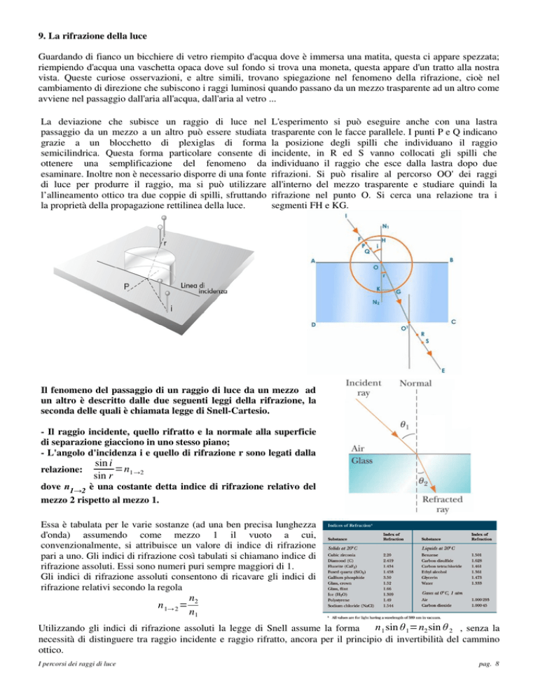 9. La rifrazione della luce Guardando di fianco un bicchiere di vetro riempito d'acqua dove è immersa una matita, questa ci appare spezzata; riempiendo d'acqua una vaschetta opaca dove sul fondo si trova una moneta, questa appare d'un tratto alla nostra vista. Queste curiose osservazioni, e altre simili, trovano spiegazione nel fenomeno della rifrazione, cioè nel cambiamento di direzione che subiscono i raggi luminosi quando passano da un mezzo trasparente ad un altro come avviene nel passaggio dall'aria all'acqua, dall'aria al vetro ... La deviazione che subisce un raggio di luce nel passaggio da un mezzo a un altro può essere studiata grazie a un blocchetto di plexiglas di forma semicilindrica. Questa forma particolare consente di ottenere una semplificazione del fenomeno da esaminare. Inoltre non è necessario disporre di una fonte di luce per produrre il raggio, ma si può utilizzare l’allineamento ottico tra due coppie di spilli, sfruttando la proprietà della propagazione rettilinea della luce. L'esperimento si può eseguire anche con una lastra trasparente con le facce parallele. I punti P e Q indicano la posizione degli spilli che individuano il raggio incidente, in R ed S vanno collocati gli spilli che individuano il raggio che esce dalla lastra dopo due rifrazioni. Si può risalire al percorso OO' dei raggi all'interno del mezzo trasparente e studiare quindi la rifrazione nel punto O. Si cerca una relazione tra i segmenti FH e KG. Il fenomeno del passaggio di un raggio di luce da un mezzo ad un altro è descritto dalle due seguenti leggi della rifrazione, la seconda delle quali è chiamata legge di Snell-Cartesio. - Il raggio incidente, quello rifratto e la normale alla superficie di separazione giacciono in uno stesso piano; - L'angolo d'incidenza i e quello di rifrazione r sono legati dalla relazione: sin i =n1 →2 sin r dove n1→2 è una costante detta indice di rifrazione relativo del mezzo 2 rispetto al mezzo 1. Essa è tabulata per le varie sostanze (ad una ben precisa lunghezza d'onda) assumendo come mezzo 1 il vuoto a cui, convenzionalmente, si attribuisce un valore di indice di rifrazione pari a uno. Gli indici di rifrazione così tabulati si chiamano indice di rifrazione assoluti. Essi sono numeri puri sempre maggiori di 1. Gli indici di rifrazione assoluti consentono di ricavare gli indici di rifrazione relativi secondo la regola n 1→ 2 = n2 n1 n 1 sin θ 1=n2 sin θ 2 , senza la Utilizzando gli indici di rifrazione assoluti la legge di Snell assume la forma necessità di distinguere tra raggio incidente e raggio rifratto, ancora per il principio di invertibilità del cammino ottico. I percorsi dei raggi di luce pag. 8 10. Le lastre e i prismi Un raggio di luce che attraversa una lastra di vetro, o di qualsiasi altro materiale trasparente, viene rifratto due volte: prima dall'aria al vetro e poi dal vetro all'aria. Comunque il raggio incida sulla lastra, il raggio che ne esce ha esattamente la stessa direzione del raggio incidente. Infatti le due facce della lastra sono parallele e quindi nella seconda rifrazione l'angolo d'incidenza coincide con l'angolo di rifrazione della prima e quindi l'angolo di rifrazione finale coincide con l'angolo d'incidenza iniziale. Ciò non avviene, invece, quando le due superfici sono piane ma non parallele, come nei prismi, oppure sono curve, come avviene nelle lenti: in entrambi i casi i raggi vengono deviati. In un prisma retto a sezione triangolare questa deviazione, rappresentata dall'angolo δ in figura, aumenta al crescere sia dell'angolo fra le due facce del prisma sia del rapporto fra il suo indice di rifrazione e quello dell'aria. Entrando e uscendo da un prisma, un raggio di luce subisce due volte la rifrazione. Siano γ l'angolo di apertura del prisma, n l'indice di rifrazione del prisma e 1 l'indice di rifrazione dell'aria. Un raggio di luce che giunge sulla prima faccia con angolo di incidenza αi, entra nel prisma formando un angolo αR, che si calcola con la legge della rifrazione. Con considerazioni geometriche si determina l'angolo di incidenza sulla seconda faccia βi = γ − αR e ancora per la legge di Snell si calcola finalmente βR, l'angolo di rifrazione sulla seconda faccia. Si dimostra che l'angolo di deviazione è dato da δ= αi + βR - γ . Se l'indice di rifrazione n del prisma fosse costante per tutti i colori non accadrebbe nulla di particolare. In realtà l'indice di rifrazione cambia (sia pure di poco) da colore a colore. Normalmente questa piccola differenza non produce effetti visibili salvo quando, in particolari situazioni, le piccole differenze di indice di rifrazione accentuano in maniera apprezzabile la deviazione dei colori. Questo fenomeno è conosciuto come dispersione della luce. Come osservò già Newton, con un prisma è quindi possibile separare i diversi colori che compongono la luce bianca. Come si vede dall'immagine la luce bianca viene separata nei vari colori: dal violetto (massima deviazione da parte del prisma ), passando per l'indaco, l'azzurro, il verde, il giallo, l'arancione, si arriva al rosso (deviazione minima). La dispersione della luce spiega anche il fenomeno dell'arcobaleno. I percorsi dei raggi di luce pag. 9 11. Le lenti Una lente è un pezzo di materiale trasparente, vetro o plastica, racchiuso fra due superfici curve, oppure una curva e una piana. Anche il comportamento delle lenti (convergenti quelle più spesse al centro e divergenti quelle più spesse ai bordi) si può intuire in prima approssimazione immaginando due prismi posti a contatto appoggiandoli per la base o per i vertici, nel modo suggerito in figura. Le lenti più comuni sono le lenti sferiche, delimitate appunto da superfici sferiche. La retta che congiunge i centri di queste superfici è l'asse ottico della lente. Attraversando una lente, un raggio di luce viene rifratto due volte, dall'aria al vetro e dal vetro all'aria: il raggio emergente risulta quindi deviato rispetto a quello incident