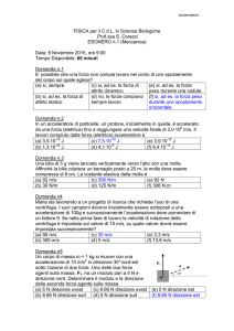 852239754498375 FISICA per il C.d.L. in Scienze Biologiche Prof.ssa S. Corezzi ESONERO n.1 (Meccanica) Data: 9 Novembre 2015, ore 9:00 Tempo Disponibile: 60 minuti Domanda n.1 La sensazione di peso percepita sulla Stazione Spaziale Internazionale (SSI) e' prossima allo zero perché: (a) La SSI è lontana (c) La SSI si muove (e) Nello spazio non c'è dalla Terra rapidamente verso il centro ossigeno della Terra (b) La SSI ruota (d) La SSI è attratta dalla Luna (f) Nello spazio non c'è rapidamente intorno alla forza gravitazionale Terra Domanda n.2 Un bimbo fa ruotare un sasso legato ad una corda lunga R=1 m descrivendo un cerchio nel piano verticale il cui centro si trova a 2 m dal suolo. La corda si spezza nel punto più alto del moto. La velocità del sasso nel momento del distacco è: (a) dipendente dalla tensione (c) 3,9 m s-1 (e) forma un angolo di 45° della corda rispetto al suolo (b) 2 m s-1 (d) parallela al (f) 7,1 m s-1 suolo Domanda n.3 Un blocco di massa m=1 Kg è appoggiato, fermo, contro una parete verticale mobile che avanza verso destra con un'accelerazione di 9,8 m/s2. Se il coefficiente di attrito statico tra blocco e parete è µs=0,94 che cosa succede? (a) Il blocco scivola giù (c) Il blocco si mette in (e) Il blocco resta fermo dalla parete moto verso l'alto (b) Il blocco si distacca (d) Non si può dire (f) Il blocco rompe la dalla parete parete Domanda n.4 Una bilia di 5 g viene lanciata verticalmente verso l'alto con una molla. Affinché la bilia colpisca un bersaglio posto a 20 m, la molla deve essere compressa di 8 cm. La costante elastica della molla è (a) 92 m/s (c) 30 N/m (e) 92 N (b) 306 N/m (d) 125 N/m (f) 306 N.m Domanda n.5 L'accelerazione di gravità sulla Luna è 1,6 m/s2 e su Marte è 3,7 m/s2. Un corpo sulla Luna rispetto a quando si trova su Marte: (a) pesa circa 2,3 volte (c) pesa circa 2,3 volte (e) dipende dalla fase di meno di più lunare (b) dipende dalla massa (d) ha lo stesso peso (f) non si può dire 852239754498375 Domanda n.6 La forza totale agente su un corpo che si sta muovendo diventa improvvisamente nulla e tale rimane. Il corpo: (a) si ferma (c) riduce gradualmente il (e) riduce bruscamente bruscamente modulo della velocità il modulo della velocità (b) prosegue a velocità (d) aumenta gradualmente (f) aumenta costante il modulo della velocità bruscamente il modulo della velocità Domanda n.7 Un esercizio di step consiste nel salire e scendere 10 volte un gradino alto 30 cm. Qual è il lavoro fatto dalla forza peso su di un uomo di 80 kg durante l’intero l’esercizio? (a) 235,2 J (c) 2352 J (e) Nullo (b) -235,2 J (d) Dipende dall’inclinazione (f) -2352 J dello scalino Domanda n.8 Una cassa di massa m=2 kg viene fatta scivolare lungo un piano inclinato liscio, trattenendola dall’alto del piano inclinato con una fune. Se il piano è inclinato di un angolo α=30° rispetto all’orizzontale, si determini il modu lo della tensione T che deve esercitare la fune affinché la cassa si muova lungo il piano con velocità costante, verso il basso, di modulo 2 m/s: (c) 19,6 N (e) 4,1 N (a) 5⋅10-2 N -3 (d) 9,8 N (f) 4,9 N (b) 1,1⋅10 N Domanda n.9 Un oggetto di massa m=3 kg scivola liberamente su un piano orizzontale con coefficiente di attrito dinamico uguale a 0,4 e coefficiente di attrito statico uguale a 1,3. Il modulo dell'accelerazione durante il moto di scivolamento dell'oggetto è: (a) 4,83 m s-2 (c) 2,11 m s-1 (e) 7,15 m s-1 -2 (b) 0 N (d) 3,92 m s (f) 7,15 m s-2 Domanda n.10 Un ventilatore ruota compiendo 1200 giri al minuto. Consideriamo un punto sul bordo esterno di una pala di raggio 0.15 m. Quali sono la sua velocità e la sua accelerazione? (a) v=18,8 m/s; (c) v=18,8 m/s; (e) v=8,1 m/s; a=0 a=2,4⋅102 m/s2 a=1,2⋅103 m/s2 (b) v=1,8 m/s; (d) v=18,8 m/s; (f) v=24,2 m/s; a=0 a=2,4⋅103 m/s2 a=2,4⋅103 m/s2 Domanda n.11 In un acceleratore di particelle, un protone, inizialmente in quiete, è accelerato da una forza (elettrica) fino a raggiungere una velocità finale di 3,0⋅106 m/s. Il lavoro compiuto dalla forza (elettrica) acceleratrice è (c) 3,9⋅10-12 J (e) 7,5⋅10-15 J (a) 3,5⋅10-12 J 852239754498375 (b) 1,3⋅10-22 J (d) 4,1⋅10-9 J (f) 6,4⋅10-10 J Domanda n.12 E’ possibile che una forza non compia lavoro nel corso di uno spostamento del corpo sul quale agisce? (a) si, sempre (c) si, ad es. la forza (e) si, ad es. la forza peso durante uno peso durante una caduta spostamento orizzontale (b) si, ad es. la forza di (d) no, le forze compiono (f) si, ad es. la forza di attrito statico sempre lavoro attrito dinamico Domanda n13 Un corpo di massa m = 1 kg si muove con una accelerazione di 10 m/s2 in direzione 30° nord-est sotto l’azione di due forze. Una delle due forze agenti sulla massa, F1, ha un modulo pari a 5 N e direzione nord. Determinare il modulo e la direzione della seconda forza agente sulla massa (a) 8.66 N direzione est (c) 8.66 N direzione ovest (b) 8.66 N direzione sud (d) 5 N direzione sud (e) 5 N direzione est (f) 5 N direzione ovest Domanda n14 Maria sta lavorando a un progetto di ricerca che richiede l’uso di una centrifuga. I suoi campioni devono inizialmente essere sottoposti a una accelerazione di 100g e successivamente l’accelerazione deve aumentare di un fattore 9. Se nella prima fase di lavoro la velocità di rotazione della centrifuga è impostata sul valore di 10 m/s, su quale valore dovrà essere impostata successivamente? (a) 90 m/s (c) 300 m/s (e) 3,3 m/s (b) 5 m/s (d) 30 m/s (f) 13,6 m/s Domanda n.15 Una particella in movimento si trova soggetta solo a forze conservative. Quale delle seguenti affermazioni è falsa? (a) La sua energia (c) La sua energia (e) La sua energia cinetica può aumentare cinetica può diminuire potenziale rimane costante (b) La sua energia (d) La sua energia (f) La sua energia meccanica non può meccanica non può potenziale può cambiare diminuire aumentare Domanda n.16 Un pendolo di massa m=2 kg e lunghezza L=80 cm, inizialmente trattenuto a un