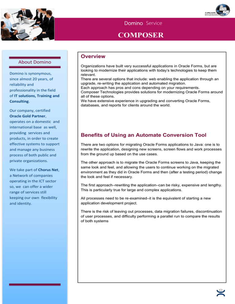 Domino Service COMPOSER Overview About Domino Domino is synonymous, since almost 20 years, of reliability and professionality in the field of IT solutions, Training and Consulting. Organizations have built very successful applications in Oracle Forms, but are looking to modernize their applications with today’s technologies to keep them relevant. There are several options that include: web enabling the application through an upgrade, re-writing the application and automated migration. Each approach has pros and cons depending on your requirements. Composer Technologies provides solutions for modernizing Oracle Forms around all of these options. We have extensive experience in upgrading and converting Oracle Forms, databases, and reports for clients around the world. Our company, certified Oracle Gold Partner, operates on a domestic and international base as well, providing services and products, in order to create effective systems to support and manage any business process of both public and private organizations. Benefits of Using an Automate Conversion Tool We take part of Chorus Net, a Network of companies operating in the ICT sector so, we can offer a wider range of services still keeping our own flexibility and identity. The first approach–rewriting the application–can be risky, expensive and lengthy. This is particularly true for large and complex applications. There are two options for migrating Oracle Forms applications to Java: one is to rewrite the application, designing new screens, screen flows and work processes from the ground up based on the use cases. The other approach is to migrate the Oracle Forms screens to Java, keeping the same look and feel, and allowing the users to continue working on the migrated environment as they did in Oracle Forms and then (after a testing period) change the look and feel if necessary. All processes need to be re-examined–it is the equivalent of starting a new application development project. There is the risk of leaving out processes, data migration failures, discontinuation of user processes, and difficulty performing a parallel run to compare the results of both systems Benefits for the user: Benefits of Migration Reduce costs Save 90% of the time and 80% of the costs with and automated conversion. Retain original business logic and code Post conversion the application retains the same business logic and code structure as the original application. Automated approach The automated process of our software tool greatly lowers conversion time and risks compared to outsourced application rewrite projects. Composer is a software solution that delivers automated migration of Oracle Forms and PL/SLQ applications to standard technologies such as Java and XML. Composer produces pure Java code that is easily maintainable and portable and doesn’t require any third party tools or plug‐ins. Our approach gives you options. You can license Composer, obtain training from our team and perform the conversion work yourself, or you can have our team perform the project conversion. Key Features of Composer • Automatically converts Oracle Forms menus, triggers, stored procedures and libraries (including all PL/SQL code within libraries). • All PL/SQL code can be presented as true, complete Java classes. • Produces native Java that is 100% maintainable and portable. • Maintains semantic content and coding standards. • Does not create wrapper classes. Our converted applications are fully maintainable and flexible, making it simply to modify when necessary. Why Composer Contacts • Shorter learning curve for Oracle Forms developers to maintain and extend the Java code as conversion maintains structure and hierarchy of Oracle Forms in Java. • Three GUI options: Java plug‐in, Oracle ADF option, Java desktop client. MILANO Viale Brianza,20 20092 Cinisello Balsamo(MI),Italy Tel. +39 02.36527222 Cell. 3487216948 ROMA Via Appia Nuova 154 (RM) 00183 Roma (RM), Italy Tel. +39 06.97842605 Cell. 3488909367 [email protected] www.domino-consulting.it • Provides Java and XML code that is portable, maintainable, and reusable. • Enables the use of all Java specific development tools available today and in the future preserves component names (Forms, menus, libraries); visual item names (canvas, items, buttons); and Triggers. About Composer Composer Technologies is a global provider of automated migration solutions for Oracle Forms and Lotus Notes applications, with customer of North and South America, Europe and Australia.