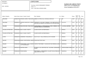 CSPS07801N LICEO SCIENTIFICO STATALE VIA DELLE GINESTRE ELENCO DEI LIBRI DI TESTO ADOTTATI O CONSIGLIATI Anno Scolastico 2016-2017 Tipo Scuola: NUOVO ORDINAMENTO TRIENNIO 87055 SAN GIOVANNI IN FIORE Classe: 3 H Corso: LICEO DELLE SCIENZE UMANE Materia / Disciplina Codice Volume Autore1 / Autore2 / Autore3 Titolo / Sottotitolo Vol. Editore Prezzo Nuova Da Cons. Adoz. Acq. RELIGIONE 9788805070985 SOLINAS LUIGI TUTTI I COLORI DELLA VITA + DVD - ED. MISTA / CON NULLA OSTA U CEI SEI 16,90 No No No ITALIANO 9788823434110 AA VV DIVINA COMMEDIA (LA) - EDIZIONE INTEGRALE / IN COLLABORAZIONE U CON MUSEO CASA DI DANTE BULGARINI 28,80 No No Ap ITALIANO LETTERATURA 9788839526526 BALDI / GIUSSO / RAZETTI LETTERATURA IERI, OGGI, DOMANI 1 CON DIVINA COMMEDIA 1 PARAVIA 41,40 Si Si No LATINO 9788849415674 ALOSI RITA / BOVE STEFANO / PAGLIANI LINGUA DELLE RADICI (LA) - EDIZIONE BLU / TEORIA PIERA U PETRINI 10,60 No No No LATINO 9788849415698 ALOSI RITA / BOVE STEFANO / PAGLIANI LINGUA DELLE RADICI (LA) - EDIZIONE BLU / ESERCIZI 2 PIERA 2 PETRINI 17,85 No No No LATINO 9788822172952 BETTINI MAURIZIO LA NUOVA ITALIA EDITRICE 24,80 No Si No INGLESE 9788808113191 LAYTON MARGARET / SPIAZZI MARINA SLIDES FROM THE WORLD +DVD / TAVELLA MARINA U ZANICHELLI 18,50 No Si No INGLESE 9788853012814 THOMSON GRAEME / MAGLIONI SILVIA LITERARY HYPERLINKS - DIGITAL EDITION PLUS - CONCISE U CIDEB 26,10 No Si No STORIA 9788822173270 BRANCATI ANTONIO / PAGLIARANI DIALOGO CON LA STORIA E L'ATTUALITA' 1 - EDIZIONE MISTA / 1 TREBI DAL MILLE ALLA META' DEL SEICENTO + ESPANSIONE WEB 1 LA NUOVA ITALIA EDITRICE 25,60 No Si No FILOSOFIA 9788839530950 ABBAGNANO / FORNERO PARAVIA No Si No TOGATA GENS 1 SET - EDIZIONE MISTA / DALLE ORIGINI ALL'ETA' 1 AUGUSTEA - VOLUME + ONLINE PERCORSI DI FILOSOFIA 1 / VOLUME 1 A E VOLUME 1 B 1 32,85 Pag. 1 di 2 CSPS07801N LICEO SCIENTIFICO STATALE VIA DELLE GINESTRE ELENCO DEI LIBRI DI TESTO ADOTTATI O CONSIGLIATI Anno Scolastico 2016-2017 Tipo Scuola: NUOVO ORDINAMENTO TRIENNIO 87055 SAN GIOVANNI IN FIORE Classe: 3 H Corso: LICEO DELLE SCIENZE UMANE Materia / Disciplina Codice Volume Autore1 / Autore2 / Autore3 Titolo / Sottotitolo Vol. Editore Prezzo Nuova Da Cons. Adoz. Acq. SCIENZE UMANE 9788808157980 AVALLE UGO / MARANZANA MICHELE PERCORSI DI SCIENZE UMANE (LM LIBRO MISTO) / ANTROPOLOGIA, 1 / SACCHI P. - SERAFINO E. SOCIOLOGIA PSICOLOGIA ZANICHELLI 33,50 No Si No PEDAGOGIA 9788839532725 AVALLE / MARANZANA CULTURA PEDAGOGICA - I PROBLEMI U PARAVIA 19,85 No No No PEDAGOGIA 9788839533883 AVALLE / MARANZANA PEDAGOGIA. STORIA E TEMI DALLA SCOLASTICA AL POSITIVISMO 1 / SECONDO BIENNIO LSU PARAVIA 23,90 No Si No MATEMATICA 9788808836298 BERGAMINI MASSIMO / TRIFONE ANNA MATEMATICA.AZZURRO 2ED. - VOLUME 3 CON TUTOR (LDM) / SECONDA 1 / BAROZZI GRAZIELLA EDIZIONE ZANICHELLI 25,70 Si Si No INFORMATICA 9788835014591 LUCCHESE RITA GUIDA ALLA PATENTE EUROPEA DEL COMPUTER / SYLLABUS ECDL U 4.0 - VOLUME + CD-ROM LA SCUOLA EDITRICE 21,50 No No No FISICA 9788808140838 AMALDI UGO TRAIETTORIE DELLA FISICA.AZZURRO (LE) 1 (LDM) / DA GALILEO 1 A HEISENBERG. MECCANICA, TERMODINAMICA, ONDE ZANICHELLI 34,70 No Si No CHIMICA 9788808171863 VALITUTTI GIOVANNI / TIFI ALFREDO LINEAMENTI DI CHIMICA 3ED. DALLA MOLE ALLA CHIMICA VIVENTI U / GENTILE ANTONINO MULTIMEDIALE (LDM) / CON CHEMISTRY IN ENGLISH ZANICHELLI 30,40 No Si No BIOLOGIA 9788808188830 CURTIS HELENA / BARNES SUE N. INVITO ALLA BIOLOGIA.BLU (LDM) / BIOLOGIA MOLECOLARE, GENETICA, U / SCHNEK A. - FLORES G. EVOLUZIONE ZANICHELLI 17,80 No Si No STORIA DELL'ARTE 9788842112044 NIFOSI' GIUSEPPE LATERZA SCOLASTICA 28,50 No Si No D'ANNA 21,30 No No No ARTE SVELATA (L') VOL. I / MONDO ANTICO E MEDIOEVO 1 SCIENZE MOTORIE E SPORTIVE 9788881048472 DEL NISTA PIER LUIGI / PARKER JUNE IN PERFETTO EQUILIBRIO / PENSIERO E AZIONE PER UN CORPO U / TASSELLI ANDREA INTELLIGENTE Pag. 2 di 2