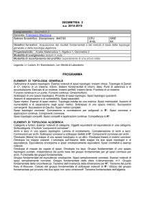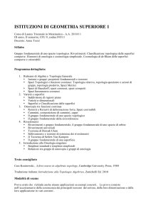 Università di Pisa Dipartimento di Matematica Corsi di Laurea e di Laurea Magistrale in Matematica Anno accademico 2016/2017 Scheda di un insegnamento attivato Nome dell'insegnamento: Geometria 2 Docente titolare (e suo indirizzo e-mail): Fabrizio Broglia ([email protected])} Co-docente (e loro indirizzo e-mail):Marco Abate ([email protected])} Codice dell'insegnamento: 127AA Valore in CFU: 12 Settore scientifico-disciplinare: MAT/03 Numero di ore di didattica frontale: 120 Semestre di svolgimento: I e II Università di Pisa Dipartimento di Matematica Corsi di Laurea e di Laurea Magistrale in Matematica Anno accademico 2016/2017 Informazioni su un insegnamento attivato Nome dell'insegnamento: Geometria 2 Docente titolare: Fabrizio Broglia Co-docente:Marco Abate Programma: 1.Geometria proiettiva. 2.Topologia generale 3.Prime nozioni di topologia algebrica. 4.Funzioni di una variabile complessa. 1.Geometria proiettiva. Definizione di spazio proiettivo, sottospazi, trasformazioni proiettive. Operazioni con i sottospazi, formula di Grassmann. Riferimenti proiettivi, coordinate omogenee, il teorema fondamentale delle proiettività. Fasci di rette e di iperpiani. Confronto tra geometria affine e proiettiva: carte affini, chiusura proiettiva e punti all'infinito di sottospazi affini. Birapporto. Il gruppo delle affinita` come sottogruppo del gruppo delle proiettività. Quadriche proiettive: classificazione proiettiva e relazione con la classificazione affine. Topologia generale. Spazi metrici, spazi topologici. Intorni. Chiusura e parte interna. Insiemi densi. Topologia indotta su un sottospazio. Confronto tra topologie. Continuita` e omeomorfismi. Mappe aperte e chiuse. Incollamento di funzioni continue. Basi, definizione di topologia prodotto. Spazi di Haussdorff. Topologia quoziente. Il proiettivo come spazio topologico quoziente. Definizione di varietà topologica. Spazi connessi. I connessi della retta reale R. Connessione per archi. Componenti connesse, componenti connesse per archi. Prodotto di connessi. Spazi compatti. Altri assiomi di separazione. Compattezza dell'intervallo [0,1]. Prodotto di spazi topologici compatti. Caratterizzazione dei compatti di R^n. Compattificazione di Alexandroff. Assiomi di numerabilita`. Compattezza per successioni. Mappe proprie. Azioni di gruppi di omeomorfismi. Proprietà del quoziente. Prime nozioni di topologia algebrica. Omotopia. Omotopia di cammini. Gruppo fondamentale: definizione e proprietà funtoriali. Dipendenza dal punto base. Retratti e retratti di deformazione. Spazi contrattili. Spazi connessi per archi con lo stesso tipo di omotopia hanno gruppi fondamentali isomorfi. Gruppo fondamentale del prodotto. Gruppo fondamentale della circonferenza e applicazioni: teorema fondamentale dell'algebra e teorema del punto fisso. Rivestimenti, sollevamenti di cammini e di omotopie, relazioni tra il gruppo fondamentale della base e la cardinalita` della fibra. Il teorema di Van Kampen. Funzioni di una variabile complessa. Definizioni equivalenti di funzione olomorfa, condizioni di Cauchy-Riemann. Regole di derivazione per le funzioni di una variabile complessa. Serie di potenze: serie formali e serie convergenti. Operazioni con le serie. Raggio di convergenza e convergenza sui dischi. Funzioni analitiche (le funzioni analitiche sono olomorfe). Le serie di potenze definiscono funzioni analitiche. Principio di continuazione analitica, zeri di una funzione analitica sono isolati. Funzioni meromorfe. Ordine in un punto di una funzione meromorfa. Forme differenziali su un dominio del piano complesso e integrazione su cammini differenziabili a tratti. Forme chiuse e forme esatte, primitive. Integrale di una forma chiusa su un cammino continuo. Invarianza per omotopia dell'integrale di una forma chiusa. Formula di Green per i rettangoli. Se f e` una funzione olomorfa, la forma f(z)dz è una forma chiusa. In dice di un cammino chiuso rispetto a un punto. Formula di Cauchy. Sviluppo in serie delle funzioni olomorfe. Disuguaglianze di Cauchy; una funzione intera limitata è costante. Teorema di Morera. In opportune coordinate locali una funzione olomorfa si scrive come z –--> z^m . Le funzioni olomorfe sono aperte. Principio del massimo modulo. Lemma di Schwarz. Sviluppo in serie di Laurent di una funzione olomorfa su una corona circolare. Stime di Cauchy. Singolarita` rimuovibili, poli e singolarita` essenziali di una funzione olomorfa. Residui. Formula dei residui. La somma dei residui di una funzione olomorfa sulla sfera di Riemann meno un numero finito di punti è nulla. Derivata logaritmica. Numero di zeri e poli di una funzione meromorfa. Teorema di Rouchè. Calcolo di integrali reali per mezzo dei residui. Testi consigliati: Henri Cartan.Théorie élémentaire des fonctions analytiques d'une ou plusieurs variables complexes. Hermann Paris. Marco Manetti. Topologia. Springer. Raghavan Narasimhan. Complex analysis in one variable. Birkhäuser Boston. Eventuali appunti dei docenti. Modalità d'esame: Prova scritta e prova orale.