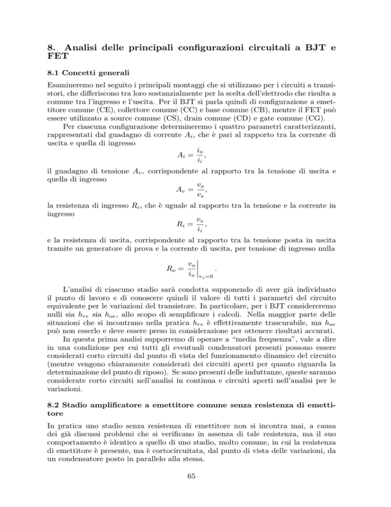8. Analisi delle principali configurazioni circuitali a BJT e FET 8.1 Concetti generali Esamineremo nel seguito i principali montaggi che si utilizzano per i circuiti a transistori, che differiscono tra loro sostanzialmente per la scelta dell’elettrodo che risulta a comune tra l’ingresso e l’uscita. Per il BJT si parla quindi di configurazione a emettitore comune (CE), collettore comune (CC) e base comune (CB), mentre il FET può essere utilizzato a source comune (CS), drain comune (CD) e gate comune (CG). Per ciascuna configurazione determineremo i quattro parametri caratterizzanti, rappresentati dal guadagno di corrente Ai , che è pari al rapporto tra la corrente di uscita e quella di ingresso io Ai = , ii il guadagno di tensione Av , corrispondente al rapporto tra la tensione di uscita e quella di ingresso vo Av = , vs la resistenza di ingresso Ri , che è uguale al rapporto tra la tensione e la corrente in ingresso vs Ri = , ii e la resistenza di uscita, corrispondente al rapporto tra la tensione posta in uscita tramite un generatore di prova e la corrente di uscita, per tensione di ingresso nulla vo Ro = . io vs =0 L’analisi di ciascuno stadio sarà condotta supponendo di aver già individuato il punto di lavoro e di conoscere quindi il valore di tutti i parametri del circuito equivalente per le variazioni del transistore. In particolare, per i BJT considereremo nulli sia hre sia hoe , allo scopo di semplificare i calcoli. Nella maggior parte delle situazioni che si incontrano nella pratica hre è effettivamente trascurabile, ma hoe può non esserlo e deve essere preso in considerazione per ottenere risultati accurati. In questa prima analisi supporremo di operare a “media frequenza”, vale a dire in una condizione per cui tutti gli eventuali condensatori presenti possono essere considerati corto circuiti dal punto di vista del funzionamento dinamico del circuito (mentre vengono chiaramente considerati dei circuiti aperti per quanto riguarda la determinazione del punto di riposo). Se sono presenti delle induttanze, queste saranno considerate corto circuiti nell’analisi in continua e circuiti aperti nell’analisi per le variazioni. 8.2 Stadio amplificatore a emettitore comune senza resistenza di emettitore In pratica uno stadio senza resistenza di emettitore non si incontra mai, a causa dei già discussi problemi che si verificano in assenza di tale resistenza, ma il suo comportamento è identico a quello di uno stadio, molto comune, in cui la resistenza di emettitore è presente, ma è cortocircuitata, dal punto di vista delle variazioni, da un condensatore posto in parallelo alla stessa. 65 Di seguito viene riportato uno schema “tipico” di un amplificatore CE con resistenza di emettitore cortocircuitata per le variazioni. Notiamo che anche all’uscita è stato posto un condensatore, allo scopo di disaccoppiare, dal punto di vista della componente di polarizzazione continua, l’eventuale carico connesso in uscita. RC C3 R1 C1 + R2 RE vS vo C2 V CC − Possiamo ora tracciare il circuito dinamico, nel quale i condensatori sono stati sostituiti da corto circuiti, cosı̀ come il generatore di tensione continua VCC . In tale situazione le resistenze che formano il partitore di ingresso vengono a trovarsi tra loro in parallelo. i’i ii i’o io R1 // R2 vS h ie R’i ib RC h fe i b Ri Ro vo R’o A seconda della convenzione scelta per definire le correnti di ingresso e di uscita, possiamo considerare come tali ii e io oppure i′i e i′o , e conseguentemente definire come resistenze di ingresso e di uscita Ri e Ro oppure Ri′ e Ro′ , rispettivamente. Per quanto riguarda il guadagno di corrente di solito ci si riferisce al rapporto io /ii : Ai = hf e ib io = = hf e . ii ib Anche il guadagno di tensione può essere calcolato facilmente, osservando che vo = −hf e ib RC : −hf e ib RC hf e RC vo = =− . Av = vi hie ib hie Per quanto riguarda la resistenza di ingresso otteniamo Ri = vs = hie , ii oppure Ri′ = R1 //R2 //Ri = R1 //R2 //hie , 66 nel caso in cui si voglia considerare la resistenza vista a monte del partitore di base. La resistenza di uscita è data da vo = ∞, Ro = io vs =0 dato che dall’uscita si vede soltanto un generatore di corrente controllato, la cui grandezza di controllo non dipende dalla tensione applicata sull’uscita stessa e risulta nulla per vs = 0. Se vogliamo prendere in considerazione la resistenza vista a valle della RC , otteniamo Ro′ = Ro //RC = RC . 8.3 Stadio amplificatore a emettitore comune con resistenza di emettitore Esaminiamo ora come variano i risultati precedentemente ottenuti nel caso in cui venga aggiunta una resistenza in serie all’emettitore del BJT. I calcoli sono leggermente più complessi perché la resistenza di emettitore introduce un accoppiamento tra la maglia di ingresso e quella di uscita. RC C2 R1 C1 + R2 vo RE vS V CC − Rappresentiamo il circuito dinamico e cerchiamo di individuare un approccio che consenta di trovare i guadagni di tensione e di corrente, oltre alle resistenze di ingresso e di uscita, senza bisogno di ricorrere alla trattazione per nodi o per maglie e alla risoluzione di un sistema lineare. i’i ii vs io h ie h fe i b ib i’o RC R1 // R2 RE R’i Ro Ri 67 R’o vo La tensione vs può essere espressa in funzione della ib osservando che essa risulta pari alla somma della caduta di tensione sulla resistenza hie , attraversata da ib , più quella sulla RE , attraversata da una corrente (hf e + 1)ib : vs = hie ib + (hf e + 1)ib RE . Da questa espressione, dividendo per ib , si ricava subito il valore di Ri : Ri = hie + (hf e + 1)RE . Questo è un risultato molto importante: la resistenza vista sulla base di un transistore BJT è pari alla somma di hie e della resistenza totale che si trova in serie all’emettitore, moltiplicata per hf e + 1. Tale risultato sarà di comune utilizzo nella analisi dei circuiti a transistori. La resistenza Ri′ che si vede a monte del partitore di ba