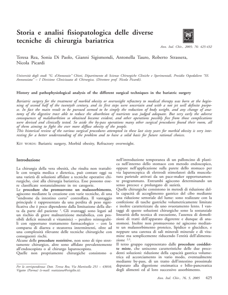Storia e analisi fisiopatologica delle diverse tecniche di chirurgia bariatrica Ann. Ital. Chir., 2005; 76: 425-432 Teresa Rea, Sonia Di Paolo, Gianni Sigismondi, Antonella Tauro, Roberto Strassera, Nicola Picardi Università degli studi “G. d’Annunzio” Chieti, Dipartimento di Scienze Chirurgiche Cliniche e Sperimentali, Presidio Ospedaliero “SS. Annunziata” – I Divisione Clinicizzata di Chirurgica, (Direttore prof. Nicola Picardi). History and pathophysiological analysis of the different surgical techniques in the bariatric surgery Bariatric surgery for the treatment of morbid obesity or overweight refractory to medical therapy was born at the beginning of second half of the twentyth century, and its first steps were uncertain and with a not jet well definite purpose. In fact the main result to be pursued seemed to be simply the reduction of body weight, and any change of anatomy of the digestive tract able to reduce the absorbtion of nutrients was judged adequate. But very early the adverse consequences of malabsorbtion so obtained became evident, and other operations possibly free from those complications were devised and clinically tested. So aside the by-pass operations many other surgical procedures found their room, all of them aiming to fight the ever more diffuse obesity of the people. This historical review of the various surgical procedures attempted in these last sixty years for morbid obesity is very interesting for a better understanding of the problem and to have a solid basis for future rational choices. KEY WORDS: Bariatric surgery, Morbid obesity, Refractory overweight. Introduzione La chirurgia della vera obesità, che risulta non trattabile con terapia medica e dietetica, può contare oggi su una varietà di soluzioni affidate a tecniche operative chirurgiche, cioè alla chirurgia bariatrica. Esse possono essere classificate sostanzialmente in tre categorie. Le procedure che promuovono un malassorbimento, agiscono mediante la creazione con varie tecniche, di una “sindrome da intestino corto” controllata. Il vantaggio principale è rappresentato da una perdita di peso significativa che è poco dipendente dalla limitazione della dieta da parte del paziente 1. Gli svantaggi sono legati ad un rischio di grave malnutrizione metabolica, con possibili deficit minerali e vitaminici – peraltro reintegrabili con opportuno trattamento farmacologico – con la comparsa di diarrea e steatorrea intermittenti, oltre ad una complessità rilevante delle tecniche chirurgiche con conseguenti rischi. Alcune delle procedure restrittive, non sono di tipo strettamente chirurgico, altre sono affidate prevalentemente all’endoscopista o al chirurgo laparoscopista. Quelle non propriamente chirurgiche consistono o Per la corrispondenza: Dott. Teresa Rea, Via Martinella 251 – 43010, Vigatto (Parma) (e-mail: [email protected]). nell’introduzione temporanea di un palloncino di plastica nell’interno dello stomaco con metodo endoscopico, oppure nell’applicazione sulla parete dello stomaco per via laparoscopica di elettrodi stimolatori della muscolatura parietale attivati da un pace-maker opportunamente programmato. Entrambi agiscono determinando un senso precoce e prolungato di sazietà. Quelle chirurgiche consistono in metodi di riduzione della capacità di accoglimento gastrico del cibo mediante una riduzione settoriale del lume: sono realizzate con la confezione di tasche gastriche volumetricamente limitate e inoltre caratterizzate da uno svuotamento lento. I vantaggi di queste soluzioni chirurgiche sono la sostanziale linearità della tecnica di esecuzione, l’assenza di demolizioni di tratti dell’apparato digerente e dunque di anastomosi. Inoltre non promuovono né agiscono mediante un malassorbimento proteico, lipidico o glucidico, e neppure una carenza di sali minerali minerale e di vitamine ma semplicemente riducendo l’entità dell’alimentazione 2,3. Il terzo gruppo rappresentato dalle procedure cosiddette miste, che uniscono caratteristiche delle due precedenti soluzioni: riduzione della capacità gastrica volumetrica ed accorciamento in vario modo, eventualmente mediante by-pass, di un tratto dell’intestino prossimale deputato alla digestione enzimatica e bilio-pancreatica degli alimenti ed al loro successivo assorbimento. Ann. Ital. Chir., 76, 5, 2005 425 T. Rea et al TABELLA I – Interventi chirurgici per obesità patologica. Malassorbitivi Restrittivi Misti Diversione bilio-pancreatica By pass digiuno-ileale Gastroplastica verticale Bendaggio Gastrico Anello gastrico+by-pass By pass gastrico con ansa alla Roux Questo secondo aspetto viene considerato da più parti secondario rispetto al significato restrittivo della procedura, ma comunque significativo con anse alla Roux di 100 cm ed oltre 4. Cronologia della chirurgia bariatrica Il 1954 è considerato l’anno di nascita della chirurgia per il trattamento cruento dell’obesità, successivamente denominata come chirurgia bariatrica, la cui diffusione è andata progressivamente crescendo, specialmente in questi ultimi trenta anni. I primi ad essere eseguiti furono gli interventi di by pass ileo-colico, che agivano interferendo con il normale assorbimento degli alimenti, ma provocando gravi sindromi da malassorbimento. Furono infatti successivamente abbandonati poiché seguiti da diarrea grave, squilibri elettrolitici ed insufficienza epatica, con riscontro di gravi complicanze tardive e in alcuni casi di mortalità 5. Il by pass digiuno ileale proposto nel 1963 in America da Payne-De Wind fu il primo intervento chirurgico impiegato su vasta scala in ambito clinico per il trattamento della grande obesità, dopo il precoce abbandono dei by pass digiuno colici, a causa delle gravi complicanze descritte (Fig. 1) 6. L’intervento poteva presentare numerose varianti tecniche (termino-laterale di Payne, termino-terminale di Scott e latero-laterale di Doldi-Montorsi) 7-10. Il by pass bilio-intestinale (Fig 