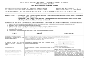 ISTITUTO TECNICO TECNOLOGICO “ GALILEO FERRARIS” - VERONA ANNO SCOLASTICO 2016/2017 PROGRAMMAZIONE PER DISCIPLINA COORDINAMENTO DISCIPLINA FISICA E LABORATORIO PRIMO BIENNIO/ Classi Seconde LIBRO DI TESTO - Libro misto in 2 tomi: Libro 2 “Termodinamica, Onde e elettromagnetismo”, autore Giuseppe Ruffo, ed. Zanichelli. COMPETENZA CHIAVE EUROPEA: Competenza matematica e competenze di base in scienza e tecnologia; Imparare ad imparare. ASSE CULTURALE SCIENTIFICO TECNOLOGICO COMPETENZE DELL’ASSE CULTURALE SCIENTIFICO TECNOLOGICO PER IL PRIMO BIENNIO: Osservare, descrivere ed analizzare fenomeni, appartenenti alla realtà naturale e artificiale e riconoscere nelle sue varie forme i concetti di sistema e di complessità; Analizzare qualitativamente e quantitativamente fenomeni legati alle trasformazioni di energia a partire dall’esperienza; Essere consapevole delle potenzialità delle tecnologie rispetto al contesto culturale e sociale in cui vengono applicate; Risolvere semplici problemi riguardanti le applicazioni delle macchine semplici nella vita quotidiana, avendo assimilato il concetto d’interazione tra i corpi e utilizzando un linguaggio algebrico e grafico appropriato. UNITA’ ABILITÀ VALUTAZIONE EVENTUALE SVOLGIMENTO, RIPASSO O Conoscenza certa di tutte quelle nozioni necessarie per affrontare gli argomenti del 2° STRUMENTI DI VALUTAZIONE APPROFONDIMENTO DI ALCUNI ARGOMENTI CHE anno Sapere risolvere alcuni esercizi. Conoscere le leggi e le grandezze Prove previste: NON SONO STATI SVOLTI O SVOLTI PARZIALMENTE Interrogazioni orali e scritte. NELL’ANNO PRECEDENTE Test “vero/falso" e/o a scelte multiple. (CINEMATICA E DIUNAMICA) Verifiche in classe con la risoluzione di esercizi Relazioni su esperienze effettuate in laboratorio. Ricerche e svolgimento di lavori a casa LAVORO ED ENERGIA; ENERGIA POTENZIALE E Avere la consapevolezza dell’importanza dei concetti di lavoro ed energia non solo in Sono previste almeno 2 valutazioni di teoria e 2 valutazioni di laboratorio a CINETICA, CONSERVAZIONE DELL’ENERGIA; fisica ma anche nella vita quotidiana. Saper utilizzare il concetto di energia e la sua conservazione, anche nella risoluzione quadrimestre. di esercizi. CRITERI DI VALUTAZIONE Per le prove previste si applica una scala di voti da 1 a 10 . ELETTROSTATICA – CARICHE ELETTRICHE E CAMPI Acquisizione dei concetti di campo elettrico e di potenziale. ELETTRICI – FORZE ELETTRICHE Conoscenza di differenze e analogie fra campo elettrico e campo gravitazionale. Conoscenza del significato della costante dielettrica. Conoscere il significato ed i casi principali di linee di campo elettrico. CRITERI DI VALUTAZIONE FORMATIVA (prove singole): La valutazione degli alunni sarà effettuata tramite interrogazioni e verifiche scritte (compiti in classe, test, relazioni di laboratorio e lavori svolti a casa) distribuite nell’arco dell’anno. Per le interrogazioni la scelta degli allievi sarà effettuata in maniera casuale, in modo che tutti siano stimolati a studiare con continuità e possano seguire pari passo l’evoluzione della materia senza lacune; l’applicazione di tale metodo permette allo studente di essere in grado di comprendere i nuovi argomenti e LA CORRENTE ELETTRICA ED I CIRCUITI IN Conoscenza di leggi fondamentali dei circuiti elettrici e dei fenomeni legati al di partecipare attivamente alla lezione. Pertanto l’interrogazione diventa non solo CORRENTE CONTINUA. CONDUZIONE NEI passaggio di correnti elettriche continue. verifica, ma anche momento formativo, di chiarimento, di riepilogo e di CORPI approfondimento, nel quale si apprende anche la corretta enunciazione ed esposizione nei termini scientifici propri della materia. Le altre verifiche (compiti e verifiche in MAGNETISMO, I FENOMENI MAGNETICI FONDAMENTALI. IL CAMPO MAGNETICO. INDUZIONE ELETTROMAGNETICA. Conoscenza dei fenomeni magnetici e delle relazioni tra campo magnetico e correnti elettriche. Comprensione della induzione elettromagnetica; conoscere le principali leggi ed applicazioni relative al fenomeno dell’induzione elettromagnetica. Conoscere le caratteristiche della corrente alternata. ONDE; SUONO OTTICA GEOMETRICA (EVENTUALE) Capacità di interpretare vari fenomeni tramite la propagazione delle onde. Comprensione del suono e dei suoi fenomeni principali. Conoscenza delle differenze fondamentali fra la propagazione per onde e per corpuscoli. Capacità di interpretare vari fenomeni e il funzionamento di alcuni apparecchi tramite la propagazione per raggi. classe, test, relazioni di laboratorio e lavori svolti a casa) verranno comunicate agli alunni con un congruo anticipo, in modo che essi possano adeguatamente prepararsi sui temi oggetto della stessa; in questo modo si esalta il momento formativo della verifica perché obbliga lo studente a focalizzare la sua attenzione sugli argomenti della prova ed a confrontarsi con essi; prima delle verifiche scritte in classe saranno comunicati i criteri di valutazione ed i punteggi che vengono assegnati ad ogni domanda che costituisce la prova. Inoltre la correzione individuale svolta in classe di tali verifiche permette di chiarire e di indicare allo studente gli errori, le lacune e le carenze presenti nei vari argomenti affrontati, oltre ad eventuali difficoltà nel metodo di studio. Queste verifiche con il loro aspetto formativo sono anche momento critico per il docente, che così può valutare la possibilità di proseguire con il programma o di ritornare sugli argomenti già svolti, per chiarire o per approfondire con metodi e strumenti diversi. Come riportato sopra la verifica formativa comprende anche le prove di laboratorio con le relative relazioni. I compiti, i tests e le verifiche in classe saranno di differenti tipologie: esercizi e problemi da risolvere e da svolgere, domande teoriche con risposta aperta, domande a risposta multipla con l’indicazione della risposta esatta. ELEMENTI COMUNI A TUTTI GLI ARGOMENTI Conoscenza di definizioni, di
