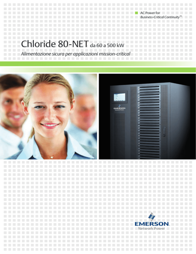 AC Power for Business-Critical Continuity™ Chloride 80-NET da 60 a 500 kW Alimentazione sicura per applicazioni mission-critical Emerson Network Power, divisione di Emerson, è un’azienda che combina tecnologia e design per fornire soluzioni innovative a vantaggio dei propri clienti. I prodotti e i servizi offerti fanno di Emerson Network Power un’azienda leader nel campo della “business-critical continuity”. La tecnologia e la conoscenza di Emerson Network Power coprono un’ampia gamma di settori industriali, riuscendo a soddisfare tutte le esigenze delle aziende. Indipendentemente dalle dimensioni dell’azienda, l’interruzione delle operazioni critiche e la perdita di tempo per il loro ripristino sono eventi inaccettabili per i nostri clienti. Affidatevi a noi! Affidatevi ai leader mondiali della Business Critical ContinuityTM: dal grid al chip, dai data center più grandi alle computer room più ridotte, siamo pronti a supportare le vostre esigenze con le nostre soluzioni. 2 Come? Grazie a prodotti più standardizzati e flessibili, capaci di adattarsi a ogni ambiente senza richiedere ulteriori investimenti; grazie a una maggiore semplicità d’uso, che non richiede di essere specialisti del settore per ottenere il massimo dal sistema. Un continuo supporto che vi farà sentire sempre protetti nello svolgimento delle vostre attività. 3 Chloride 80-NET da 60 a 500 kW Massima potenza attiva, efficienza elevata e compatibilità completa per i moderni carichi IT mission-critical. Caratteristiche e prestazioni •Architettura “Transformer Free” •Tecnologia a doppia conversione IGBT totale •Perfetta correzione del fattore di potenza di ingresso (PFC) e prestazioni di ingresso eccellenti: - PF > 0,99 - THDi < 3% •Adattamento automatico alla potenza di uscita fino a +10% •Elevata efficienza di conversione (certificata fino al 98%) •Interfaccia utente hi-tech per il monitoraggio dello stato e delle prestazioni del sistema •Totale isolamento galvanico come opzione standard incorporata. 4 Chloride 80-NET - prestazioni da 60 a 500 kW Chloride 80-NET vanta una architettura “transformerfree” con tecnologia a doppia conversione IGBT che consente risparmi straordinari sui costi di installazione e di esercizio, offrendo al contempo una protezione eccellente del carico. Chloride 80-NET è inoltre dotato di un raddrizzatore IGBT che rende possibile ridurre le dimensioni dei gruppi generatori, della protezione dei circuiti, del cablaggio e dei trasformatori. Flessibilità e compatibilità Chloride 80-NET può essere adattato pienamente alle esigenze più diverse in termini di durata dell’alimentazione ausiliaria, potenza, ridondanza e controllo delle armoniche. Inoltre garantisce la massima flessibilità grazie a: •Fattore di potenza in uscita 1 •Diagramma del fattore di potenza in uscita simmetrico rispetto allo zero •100% kVA sempre, senza declassamento in presenza di qualsiasi carico (induttivo o capacitivo) •Rapporto spazio/potenza ottimizzato •Compatibilità totale con commutatori statici di trasferimento •Ampia gamma di opzioni standard, tra cui: Trasformatore di isolamento (integrato nell’armadio UPS), Interruttore di by-pass di sistema e Modulo di sincronizzazione (MBSM). Interfaccia utente 1 9 2 3 8 4 1. Ingresso di by-pass Misurazioni di tensione e frequenza. 2. Ingresso di rete Valori di corrente, tensione e frequenza delle tre fasi di ingresso. 3. Avvertenza/guasto Avvisi di anomalie su bypass, raddrizzatore, inverter, booster/caricabatteria, batteria e carico. 5 6 4. Registro eventi Data e ora di eventi importanti nell’UPS, allarmi e altri avvertimenti. 5. Misurazioni Valori di tensione, corrente e frequenza di ogni blocco funzionale interno. 6. Batteria Stato/valori, tra cui temperatura, tensione celle, capacità, tempo di funzionamento e test. 7 7. LIFE Stato delle connessioni e delle chiamate di LIFE®.net. 8. Strumenti Selezione delle impostazioni LCD e della lingua. 9. Uscita Misurazioni di tensione, corrente, frequenza, e batteria. 5 Sostenibilità e ambiente Tecnologia digitale avanzata e massimi risparmi energetici per prestazioni più elevate e TCO ottimizzato. La piattaforma di controllo di Chloride 80-NET incorpora un doppio DSP e un microcontrollore che garantiscono il massimo controllo attualmente disponibile nel settore degli UPS. In combinazione con la tecnologia a controllo vettoriale (Vector Control) brevettata, permette di incrementare le prestazioni dei convertitori e di migliorare il controllo in tempo reale della qualità della potenza in uscita. Questo abbinamento tecnologico offre i seguenti vantaggi: •Impatto zero sull’apparecchiatura a monte •Totale compatibilità con qualsiasi generatore •Prestazioni migliorate per condizioni specifiche di carico sbilanciato •Perfetta condivisione del carico per configurazioni parallele •Capacità migliorata di correzione delle anomalie (fino al 300% della corrente nominale dell’inverter) • Tecnologia a doppia conversione intelligente per garantire la massima affidabilità e la riduzione al minimo dei costi energetici. 6 Massimo risparmio energetico Grazie alla sua architettura “Transformer free” e alla tecnologia della doppia conversione intelligente, Chloride 80-NET è in grado di raggiungere ottimi valori di efficienza in qualsiasi condizione operativa, consentendo una riduzione dei costi di esercizio anche con carico parziale. Grazie a questa architettura, si ha inoltre una minore dissipazione dell’energia (kW), con un significativo abbattimento dei consumi del sistema di raffreddamento. Totale isolamento galvanico Potendo alloggiare il trasformatore di isolamento all’interno dell’armadio UPS, Chloride 80-NET è l’unico UPS fra quelli della sua gamma di potenza a offrire un totale isolamento galvanico integrato. Ciò riduce fortemente l’ingombro, offrendo così vantaggi anche dal punto di vista dello spazio. Inoltre, il trasformatore può essere co