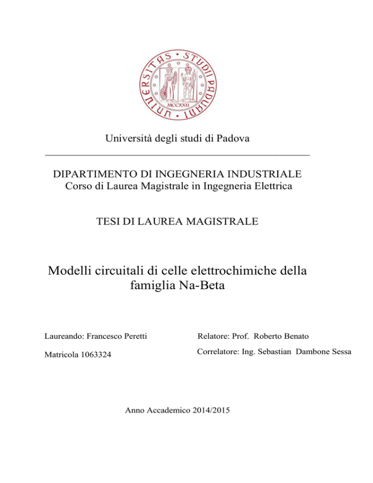 Università degli studi di Padova _______________________________________________ DIPARTIMENTO DI INGEGNERIA INDUSTRIALE Corso di Laurea Magistrale in Ingegneria Elettrica TESI DI LAUREA MAGISTRALE Modelli circuitali di celle elettrochimiche della famiglia Na-Beta Laureando: Francesco Peretti Relatore: Prof. Roberto Benato Matricola 1063324 Correlatore: Ing. Sebastian Dambone Sessa Anno Accademico 2014/2015 Sommario INDICE DELLE FIGURE ............................................................................................................... 4 INTRODUZIONE: ACCUMULATORI ELETTROCHIMICI .............................................. 11 BIBLIOGRAFIA INTRODUZIONE ............................................................................................. 17 CAPITOLO 1: LE BATTERIE PIOMBO ACIDO .............................................................. 19 1.1. Generalità sulle batterie piombo acido ........................................................................... 19 1.2. Batterie a soluzione elettrolitica liquida (VLA ) ........................................................ 20 1.3. Celle a ricombinazione (VRLA) ................................................................................ 21 1.4. Materiali usati nei diversi tipi di griglia ..................................................................... 23 1.5. Chimica della batteria ................................................................................................ 23 1.6. Tensione a vuoto della batteria.................................................................................. 25 1.7. Tensione durante la scarica e durante la carica .......................................................... 27 1.8. Tensione durante la scarica e il "Colpo di frusta" ...................................................... 32 1.9. Il fenomeno della solfatazione ................................................................................... 34 1.10. Autoscarica della batteria .......................................................................................... 35 1.11. Temperatura ................................................................................................................ 36 1.12. Efficienza della batteria.............................................................................................. 37 1.13. Degradazione della batteria ........................................................................................ 38 1.14. Introduzione alla modellistica della batteria .............................................................. 39 1.15. Il modello elettrico delle batterie piombo-acido ........................................................ 41 1.16. Modello statico della batteria piombo acido .............................................................. 42 1.17. Modello dinamico della batteria al piombo acido ...................................................... 44 1.17.1. Ramo principale [9]................................................................................................... 46 1.17.2. Ramo parassita [9]...................................................................................................... 48 1.17.3. Capacità, stato di carica e temperatura dell'elettrolita [9] .......................................... 49 1.17.4. Modello del terzo ordine e definizione dei parametri [9] ......................................... 52 1.18. Determinazione dei componenti del circuito ............................................................. 56 1.18.1. Parametri riferiti alla capacità [10]............................................................................. 57 1.18.2. Parametri riferiti al ramo principale [10] ................................................................... 58 1.18.3. Parametri riferiti al ramo parassita [10] ..................................................................... 61 1.19. Risultati del modello proposto [10]............................................................................ 61 1 1.20. Scelta del tipo di modello ........................................................................................... 63 1.21. Correlazione tra circuito elettrico e batteria vera ....................................................... 65 BIBLIOGRAFIA CAPITOLO 1 .................................................................................................... 69 CAPITOLO 2: LE BATTERIE AL LITIO ............................................................................... 71 2.1. Informazioni generali sulle batterie al litio ................................................................ 71 2.2. Batterie litio-ione ........................................................................................................ 74 2.2.1. Elettrodo negativo [1] ................................................................................................. 77 2.2.2. Elettrolita liquido [1] .................................................................................................. 78 2.2.3. Separatore [1] ............................................................................................................. 79 2.2.4. Elettrodo positivo [1].................................................................................................. 80 2.3. Batterie litio ione polimerico ...................................................................................... 81 2.4. Batterie al litio metallico ............................................................................................ 82 2.5. Tipologie di batterie al Litio [3] ................................................................................. 84 2.6. Sicurezza [3] .............................................................................................................. 84 2.7. Chimica della batteria [3] ........................................................................................... 86 2.8. Tensione durante la scarica ............................