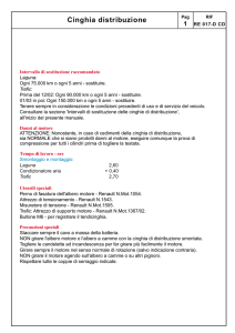 Cinghia distribuzione CASA COSTRUTTRICE: RENAULT CODICE MOTORE: F3P B670 / S724 / 682 / 700 / 704 705 / 706 / 707 / 708 / 710 / 712 / 714 / 720 / 755 760 / 765. F3R 722 / 728 / 729 /768 / 769. Pag RIF 1 RE 003 CD MODELLO: Clio 1.8 IE R19 1.8 IE Laguna 1.8 Espace 2.0 CAT CAT / 2.0 IE CAT IE CAT ANNO: 1991 - 01 Intervallo di sostituzione raccomandato Ogni 120.000 km o ogni 5 anni - sostituire. Danni al motore ATTENZIONE: Nonostante, in caso di cedimenti della cinghia di distribuzione, sia NORMALE che si siano prodotti danni al motore, eseguire comunque la prova di compressione per tutti i cilindri prima di togliere la testata. Tempo di lavoro - ore CINGHIA AUSILIARIA ( Solo per Laguna 1.8 ) ( per veicoli senza il sistema di A / C ) GEN Tempo di lavoro - ore Smontaggio e montaggio: Clio/R19 3,60 Laguna 3,00 Espace 2.00 TC AM Utensili speciali Perno di fasatura dell'albero motore - Renault N.Mot.1054. Misuratore di tensione - Renault N.Mot.1273 (SEEM C.Tronic). Bullone M6 x 45 mm - per registrare il tendicinghia. Precauzioni speciali Staccare sempre il cavo a massa della batteria. NON girare l'albero motore o l'albero a camme con la cinghia di distribuzione smontata. Togliere le candele di accensione per far girare più facilmente il motore. Girare sempre il motore nel senso normale di rotazione (salvo indicazione contraria). NON girare il motore agendo sull'albero a camme o su altri pignoni. Rispettare tutte le coppie di serraggio indicate. PS PW ( per veicoli dotati di sistema di A / C ) GEN PS TC AM PW AC Cinghia distribuzione SMONTAGGIO 1. Alzare e tenere sollevata la parte anteriore del veicolo. 2. Togliere: Ruota anteriore destra. Pannello parafango interno destro. Lastra di protezione sotto il motore. 3. Ruotare l'albero motore fino al PMS del cilindro N.1. Controllare che le tacche di fasatura siano allineate [A] . 4. Inserire il perno di fasatura nell'albero motore [B] . Utensile N.Mot.1054. 5. Sostenere il motore. 6. Togliere: Supporto destro motore (2 sezioni). Cinghia organi ausiliari. Puleggia albero motore. Carter della distribuzione [C] . 7. Controllare che le tacche sulla cinghia siano allineate con le tacche sui pignoni [D] e [E] . NOTA: Se non sono visibili contrassegni sulla piastra di appoggio, tracciare un contrassegno di riferimento in linea con quello del pignone albero a camme [D] . 8. Allentare il dado del tendicinghia [F] . Allontanare il tendicinghia dalla cinghia. Stringere leggermente il dado. 9. Scalzare la cinghia di distribuzione. Pag RIF 2 RE 003 CD MONTAGGIO 1. Assicurarsi che il perno di fasatura sia ben posizionato [B] . 2. Montare la cinghia di distribuzione procedendo col seguente ordine: Pignone dell'albero motore Pignone dell'albero ausiliario. Puleggia di guida. Pignone dell'albero a camme. Puleggia del tendicinghia. 3. Controllare che le tacche sulla cinghia siano allineate con le tacche sui pignoni [D] e [E] . 4. Allentare il dado del tendicinghia [F] . 5. Avvitare un bullone M6x45 mm nel coperchio superiore del lato posteriore cinghia di distribuzione sino a che la puleggia del tendicinghia non entri a contatto con la cinghia stessa [G] . 6. Comprimere la cinghia con forza con il pollice nel punto a. 7. Montare il misuratore di tensione sulla cinghia nel punto a. Utensile N.Mot.1273 [H]. 8. Avvitare il bullone M6 fino a quando il misuratore di tensione indica quanto segue [G] : F3P: 25 unità SEEM. F3R: 36 unità SEEM. 9. Serrare il dado del tendicinghia a 50 Nm [F] . 10. Togliere: Perno di fasatura [B] . Misuratore di tensione [H] . Bullone M6 [G] . 11. Ruotare l'albero motore in senso orario di tre giri fino al PMS del cilindro N.1. Inserire il perno di fasatura [B] . 12. Togliere il perno di fasatura. 13. Comprimere la cinghia con forza con il pollice nel punto a. 14. Montare il misuratore di tensione sulla cinghia nel punto a. Utensile N.Mot.1273 [H]. 15. Il misuratore di tensione deve indicare quanto segue: F3P: 23-27 unità SEEM. F3R: 33-39 unità SEEM. 16. Altrimenti: Ripetere la procedura di tensionamento della cinghia. 17. Rimontare gli altri componenti in ordine inverso a quello di smontaggio. 18. Serrare il bullone della puleggia albero motore a 90-100 Nm. Cinghia distribuzione Pag RIF 3 RE 003 CD C A B D G CAM TC F ( 50 Nm ) a PG AUX E AM H Misurazione tensione cinghia I costruttori prevedono l'uso di diversi tipi di misuratori ma, premesso che non è possibile misurare direttamente la tensione di una cinghia installata, essi in generale sono di 3 tipi e tendono a misurare uno dei seguenti valori indiretti, espressi in unità o Newtons: a) deflessione che si verifica applicando un carico prefissato; b) carico corrispondente ad una deflessione prefissata; c) attrezzi specifici ( praticamente un braccio di leva ) per caricare il tendicinghia con un certa copia. Seguirà una tabella di conversione che permetterà di utilizzare un unico tipo di misuratore. Tabella comparativa Burroughs Sykes - SEEM ( BT33 -73F / Pickavant BT33 - 86J ) 316690 N ( Newtons ) Kg SEEM Löwener C. Tronic C. Tronic ( Ford 21-113 G2 105.5 87 ( Pin S ) Unità Unità 50 13 100 22,5 150 33 31.5 200 40 38.5 250 47 46 300 53 350 Peiseler BMW ( 11.2.080 ) e ( VAG 210, Volvo e Opel 510-2 ) Volvo 5297 e Seat U.10.028) ( 9988500* ) Unità Unità Unità Burroughs/ Rover (Km 4088 AR) Unità 28 11.7 35 1.7 4 12.5 41.5 2.7 52 7.4 13.1 46.5 4 61 58 9.6 13.4 51 5 400 67 63 11 13.6 53 6 450 72 68.5 12 500 78 73.5 7 7.5 550 8 600 8.5 650 9 670 Si sono prese tutte le precauzioni ragionevoli per garantire l'esattezza delle informazioni contenute nelle schede tecniche. Tuttavia la società produttrice di questo materiale informativo, non può essere tenuta responsabile delle informazioni incorrette o inesatte o di errori che si possono verificare inavvertitamente nel corso della preparazione delle suddette schede tecniche Precauzioni _ Nell'eventualità in cui si verifichi una rottura della cinghia di distribuzione che può provocare gravi danni al motore, prima di rimuovere la testa,