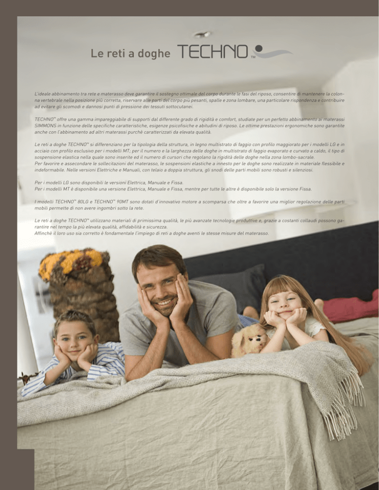 Le reti a doghe TECHNO TM L’ideale abbinamento tra rete e materasso deve garantire il sostegno ottimale del corpo durante le fasi del riposo, consentire di mantenere la colonna vertebrale nella posizione più corretta, riservare alle parti del corpo più pesanti, spalle e zona lombare, una particolare rispondenza e contribuire ad evitare gli scomodi e dannosi punti di pressione dei tessuti sottocutanei. TECHNO™ offre una gamma impareggiabile di supporti dal differente grado di rigidità e comfort, studiate per un perfetto abbinamento ai materassi SIMMONS in funzione delle specifiche caratteristiche, esigenze psicofisiche e abitudini di riposo. Le ottime prestazioni ergonomiche sono garantite anche con l’abbinamento ad altri materassi purchè caratterizzati da elevata qualità. Le reti a doghe TECHNO™ si differenziano per la tipologia della struttura, in legno multistrato di faggio con profilo maggiorato per i modelli LG e in acciaio con profilo esclusivo per i modelli MT; per il numero e la larghezza delle doghe in multistrato di faggio evaporato e curvato a caldo, il tipo di sospensione elastica nella quale sono inserite ed il numero di cursori che regolano la rigidità delle doghe nella zona lombo-sacrale. Per favorire e assecondare le sollecitazioni del materasso, le sospensioni elastiche a innesto per le doghe sono realizzate in materiale flessibile e indeformabile. Nelle versioni Elettriche e Manuali, con telaio a doppia struttura, gli snodi delle parti mobili sono robusti e silenziosi. Per i modelli LG sono disponibili le versioni Elettrica, Manuale e Fissa. Per i modelli MT è disponibile una versione Elettrica, Manuale e Fissa, mentre per tutte le altre è disponibile solo la versione Fissa. I modelli TECHNO™ 80LG e TECHNO™ 90MT sono dotati d’innovativo motore a scomparsa che oltre a favorire una miglior regolazione delle parti mobili permette di non avere ingombri sotto la rete. Le reti a doghe TECHNO™ utilizzano materiali di primissima qualità, le più avanzate tecnologie produttive e, grazie a costanti collaudi possono garantire nel tempo la più elevata qualità, affidabilità e sicurezza. Affinchè il loro uso sia corretto è fondamentale l’impiego di reti a doghe aventi le stesse misure del materasso. • Il modello TECHNO™ 80LG è un supporto anatomico eccellente. Ha il telaio a doppia struttura in multistrato di legno e materiale plastico stampato; le doghe, a larghezza ridotta (mm 38), sono montate su speciali sospensioni basculanti in TPE-E. • i modelli TECHNO™ 60LG sono un ottimo sostegno anatomico. Hanno la struttura in multistrato di legno e le doghe, a larghezza ridotta (mm 38), sono montate su speciali sospensioni basculanti in TPE-E. • I modelli TECHNO™ 40LG sono un ottimo sostegno anatomico. Hanno la struttura in multistrato di legno e le doghe, a larghezza ridotta (mm 38), sono montate su speciali sospensioni basculanti in SBS. COMFORT E RIGIDITÀ La rete a doghe può modificare il livello di rigidità e il grado di comfort di ogni materasso. TECHNO™ indica le variazioni di comodità e rigidità dei materassi in funzione dell’abbinamento con lo specifico modello. • I modelli TECHNO™ 20LG sono un ottimo sostegno anatomico. Hanno la struttura in multistrato di legno e le doghe, a larghezza ridotta (mm 38), sono montate su speciali sospensioni basculanti in SBS. diminuisce invariata aumenta Rigidità regolabile: Nella zona lombo-sacrale la rigidità delle doghe è regolabile mediante cursori che sono posizionabili in rapporto al peso corporeo, al tipo di materasso ed in funzione della posizione di riposo usuale. +RIGIDO • I modelli TECHNO™ 90MT sono un supporto anatomico eccellente. Hanno il telaio in acciaio (nella versione Elettrica telaio con doppia struttura in acciaio e materiale plastico stampato) e le doghe, a larghezza ridotta (mm 38), sono montate su speciali sospensioni basculanti in SBS. +MORBIDO • Il modello TECHNO™ 70MT è un sostegno ortopedico. Ha il telaio in acciaio e le doghe, a larghezza maggiorata (mm 200), sono inserite in speciali guaine gommose anticigolio. • Il modello TECHNO™ 30MT è un buon sostegno ergonomico. Ha la struttura in acciaio e le doghe, di larghezza mm 68, sono inserite in speciali guaine gommose anticigolio. INDICAZIONI GENERALI • Reti a doghe strette basculanti (mm 38): aumentano il comfort del materasso se il materasso non è eccessivamente rigido. I cursori regolatori permettono di variare il grado di rigidità nella zona centrale. • Reti a doghe fisse (mm 68): garantiscono un ottimo sostegno alla schiena senza alterare nè la rigidità nè il comfort del materasso. I regolatori permettono di variare il grado di rigidità nella zona centrale. • Reti a doghe larghe (mm 200): aumentano la rigidità del materasso lasciando inalterato il comfort. • Reti con movimento: da utilizzare esclusivamente con materassi appositamente progettati per l’uso con questo tipo di base: i modelli Activ™ a struttura snodabile, i modelli in lattice Simmons e alcuni modelli della linea Trycel™ Memored™. Evitare l’uso con materassi di lana e a molle non specificamente progettati per questo utilizzo. • Rete metallica: evitare l’utilizzo con qualsiasi tipo di materasso a causa dell’effetto “amaca”. • Il modello TECHNO™ 10MT è un sostegno ergonomico. Ha la struttura in acciaio e le doghe, di larghezza mm 68, sono inserite in speciali guaine gommose anticigolio. • Il modello TECHNO™ 50MT è un ottimo sostegno ergonomico. Ha la struttura in acciaio e le doghe, di larghezza mm 68, sono inserite in speciali guaine gommose anticigolio. • Il modello TECHNO™ 0MT è un sostegno elastico. Ha la struttura in acciaio e le doghe, di larghezza mm 68, sono inserite in speciali guaine gommose anticigolio. AVVERTENZA Le reti a doghe TECHNO™ con movimento elettrico o manuale, sono indicate per soddisfare esigenze di persone non affette da patologie invalidanti a carico dell’a