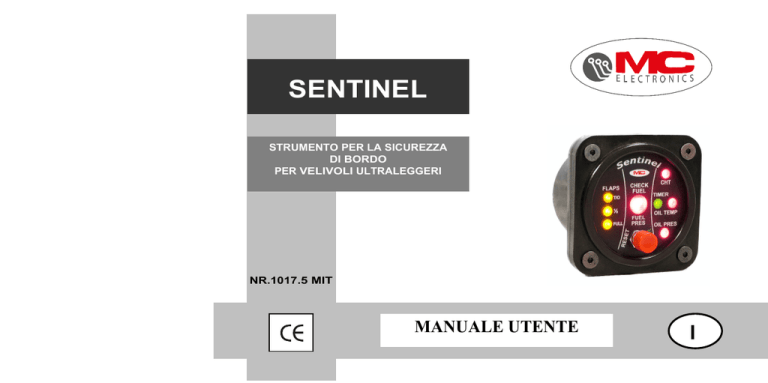 SENTINEL STRUMENTO PER LA SICUREZZA DI BORDO PER VELIVOLI ULTRALEGGERI NR.1017.5 MIT MANUALE UTENTE I Prefazione Costruttore Indirizzo : MC elettronica S.r.l. Documento n° Edizione : 101700.5 : Giugno 2013 : Via E. fermi, 450/486 Fiesso Umbertiano (ROVIGO) - ITALIA Tel. +39 0425 754713 Fax +39 0425 741130 E-mail: info@mcelettronica Internet: www.mcelettronica.it - MC elettronica S.r.l. non assume l'obbligo di notificare eventuali successive modifiche al prodotto. - Le descrizioni riportate nel presente manuale non autorizzano in alcun modo manomissioni da parte di personale non autorizzato. - La garanzia sulle apparecchiature decade nel momento in cui tali manomissioni siano riscontrate. © Copyright MC elettronica 2013 2 1. NORME ED AVVERTENZE GENERALI 1.1 Premessa - - Questo manuale d istruzioni fornisce tutte le informazioni specifiche necessarie alla conoscenza ed al corretto utilizzo dell apparecchiatura in vostro possesso. Esso deve essere letto attentamente all atto dell acquisto e consultato ogni qualvolta insorgano dubbi circa l utilizzo o per eventuali interventi di manutenzione. Si suggerisce di tenere il presente manuale a bordo del velivolo o conservato in un luogo noto ed accessibile per un agevole consultazione. TUTTI I DIRITTI SONO RISERVATI. QUESTO MANUALE E DESTINATO ESCUSIVAMENTE ALL USO DA PARTE DEL CLIENTE. OGNI ALTRO USO E PROIBITO. 3 1.2 Condizioni di garanzia SENTINEL è garantito per un periodo di 2 anni dalla data di acquisto, su presentazione di scontrino fiscale o fattura di acquisto. La garanzia non è applicabile in caso di: danno provocato casualmente; uso non corretto, modifiche non concordate, installazione (o messa a punto) non corretta; danno provocato da rottura o malfunzionamento di apparecchiature meccaniche o elettriche collegate ai nostri apparecchi; cause di forza maggiore (fulmini, inondazioni, incendi o altre cause indipendenti da MC elettronica). Le riparazioni in garanzia (entro 2 anni dalla data di acquisto), che devono essere effettuate presso i laboratori dei nostri centri autorizzati, sono completamente gratuite purché lo strumento venga spedito porto franco. Le spese di trasporto ed i rischi da esso derivanti sono a totale carico del Cliente. 4 La garanzia sopra descritta è valida a meno di accordi diversi fra MC elettronica e Cliente. NOTA ! MC elettronica declina ogni responsabilità per danni o spese dirette o indirette, causate dall uso improprio o dall incapacità del Cliente di usare l attrezzatura separatamente e/o in combinazione con altre apparecchiature. 1.3 Servizio di assistenza E possibile ottenere l assistenza in tutti i paesi dove l apparecchio è ufficialmente distribuito (durante e dopo il periodo di garanzia), oppure direttamente presso la casa costruttrice MC elettronica. 5 2. Descrizione generale A B C G D E F Fig. 1 Pannello principale - Sentinel. 6 REF DESCRIZIONE PANNELLO SENTINEL A Spia FUEL per Check rubinetti e allarme pressione circuito carburante. B Spia allarme alta temperatura testate (CHT). Spia a doppia funzione; accesa fissa indica che la temperatura dell olio motore è corretta, accesa intermittente, indica che il timer è inserito, attivando il buzzer ad ogni 2 minuti, da usare per riporti di posizione o usi vari, come ad esempio pro-memoria rubinetti chiusi in volo. C D E F G Spia allarme alta temperatura olio motore Spia allarme pressione olio motore; massima in modo intermittente, minima modo continuo. Pulsante per diverse funzioni; tacita buzzer, attivazione timer, programmare soglie allarmi. Indicatore flap a 3 livelli, T/O - ½ - FULL con buzzer timer a 1 minuto, inoltre per la programmazione percentuale soglie allarme fuel. 7 3. Montaggio dello strumento SENTINEL. Posizionare SENTINEL dove trova maggiore praticità del pilota. Nella foto è posizionato in plancia strumenti motore, ma se possibile si suggerisce in posizione frontale del pilota, vicino agli strumenti di navigazione. Sentinel Fig. 2 Sentinel montato su plancia strumenti motore 8 3.1 Montaggio trasduttore di pressione del circuito carburante Nel caso in cui il velivolo sia sprovvisto del trasduttore di pressione carburante, si possono utilizzare vari trasduttori di pressione di tipo RESISTIVO con un campo di resistenza da 0 a 1000 ohm. Per i motori Rotax serie 912 e 914, viene comunque consigliato l utilizzo di un trasduttore di pressione della MITCHEL AIRCRAFT - Part Number - PS-211-9000 campo di pressione da 0 -30 PSI ( da 0 2.0 Bar). Per acquisti in Italia ci si può rivolgere alla Bottega dell aquilone Speedy Com Codice. 00129B. L istallazione deve essere eseguita da personale specializzato. Per il collegamento elettrico utilizzare unicamente cavi aereonautici. La foto successiva indica un chiaro esempio di installazione del trasduttore di pressione carburante. In questo specifico caso il trasduttore è stato inserito nella tubazione principale di alimentazione dei carburatori motore tramite l ausilio di un raccordo a T . 9 Fig. 3 Trasduttore di pressione carburante montato con raccordo a T . 10 3.2 Montaggio del Buzzer. Installare il buzzer in dotazione in una zona frontale al pilota per assicurarsi che l acustica emessa sia ben percepibile dallo stesso. Fig. 4 Buzzer montato in plancia strumenti motore . 11 4. PROGRAMMAZIONE La programmazione del SENTINEL viene effettuata in due momenti separati e con due diverse modalità; a) modalità programmazione allarmi motore e flaps, cap. 4.2 b) modalità programmazione allarme pressione carburante, cap. 4.3 4.1 PROGRAMMAZIONE ALLARMI MOTORE E FLAPS. La programmazione deve essere fatta a motore freddo, con indicatori temperatura olio motore e testata inferiori di 50° C. Per prima cosa staccare momentaneamente il filo del trasduttore di pressione olio motore come mostra la figura 5. 12 filo staccato provvisoriamente Fig. 5 Filo del trasduttore pressione olio motore staccato provvisoriamente. 13 4.2 PROGRAMMAZIONE ALLARMI MOTORE E FLAPS. Per iniziare la programmazione, lo strumento SEN