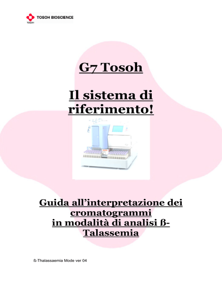 G7 Tosoh Il sistema di riferimento! Guida all’interpretazione dei cromatogrammi in modalità di analisi ßTalassemia ß-Thalassaemia Mode ver 04 Introduzione La presente “Guida all’interpretazione dei cromatogrammi” fornisce una breve descrizione emoglobine varianti ed emoglobinopatie. L’interpretazione dei Cromatogrammi Tosoh G7 costituisce la parte principale della guida, che comprende i tempi critici di ritenzione e i criteri di base dei cromatogrammi. Per un’ulteriore assistenza nell’interpretazione di cromatogrammi insoliti, contattare il rappresentante Tosoh Bioscience. TOSOH CORPORATION 3-8-2, Shiba, Minato-ku TOKYO 105-8623 (GIAPPONE) Tel.: +81-(0)3-5427 5181 Fax: +81-(0)3-5427 5220 TOSOH BIOSCIENCE N.V. Transportstraat 4 B-3980 TESSENDERLO (BELGIO) Tel.: +32-(0)13-66 88 30 Fax: +32-(0)13-66 47 49 EC Les Sables de Sary, 69, Rue des Sables de Sary F-45770 SARAN (FRANCIA) Tel.: +33-(0)2-38 72 44 44 Fax: +33-(0)2-38 72 44 40 Zettachring 6 D-70567 STUTTGART (GERMANIA) Tel.: +49-(0)711 13 25 760 Fax: +49-(0)711 13 25 762 TOSOH BIOSCIENCE SRL Corso Susa 299/A I-10098 RIVOLI-TORINO (ITALIA) Tel.: +39-011-95 19 333 Fax: +39-011-95 19 329 TOSOH BIOSCIENCE AG Zentrum Fanghöfli 8 CH-6014 LITTAU-LUZERN (SVIZZERA) Tel.: +41-(0)41-250 44 80 Fax: +41-(0)41-250 50 64 TOSOH BIOSCIENCE Ltd. The Business Centre, Edward Street, Redditch B97 6HA WORCESTERSHIRE (REGNO UNITO) Tel.: +44-(0)1527-59 29 01 Fax: +44-(0)1527-59 29 02 ß-Thalassaemia Mode ver 04 2 REP Guida all’interpretazione dei cromatogrammi in modalità di analisi β-Talassemia Indice INTRODUZIONE…………………………………………………………………………… … 2 1. CHE COS’E’ L’EMOGLOBINA ………………………………………… …… ……… … 5 2. CHE COSA SONO LE EMOGLOBINOPATIE ? …………………………………. 2.1 2.2 2.3 2.4 2.5 2.6 2.7 … TALASSEMIE …………………………………………………………………………….……………… ANEMIA FALCIFORME ………………………………………………………………………………….. EMOGLOBINA C ……………………………………………………………………………….………… MALATTIA DA EMOGLOBINA SC ………………………………………………………….…………… EMOGLOBINA D …………………………………………………………………………….……………. EMOGLOBINA E …………………………………………………………………………….…………….. EMOGLOBINA O-ARAB ………………………………………………………………………………….. 3. PRINCIPIO DI SEPARAZIONE TOSOH G7 …………………………………………… 3.1 PRINCIPIO DI SEPARAZIONE 6 8 15 17 17 17 18 18 19 ………………………………………… ………………… 20 4. COME PROGRAMMARE INDICATORI E ALLARMI NEL SISTEMA………………… 21 GUIDA ALL’INTERPRETAZIONE E LIBRARY CROMATOGRAMMI ………………… 24 QUALI INFORMAZIONI DA IL CROMATOGRAMMA ? ………………………………… 25 QUALI SONO I VALORI NORMALI ?……………………………………………………… 26 CAMPIONE NORMALE ……………………………………………………………………………………… … CAMPIONE TRATTO β-TALASSEMICO…………………………………………………………………… … CAMPIONE DI β-TALASSEMIA OMOZIGOTE DOPO TRASFUSIONE ………………………………...… CAMPIONE HbA/D ETEROZIGOTE …………………………………………………………… …………… CAMPIONE HbA/D LOS ANGELES ETEROZIGOTE …………………… ………………………………… CAMPIONE HbD/β + ………………………………………………………………………………………… …. CAMPIONE HbA/S ETEROZIGOTE …………………………………………………………………………… CAMPIONE HbS/S OMOZIGOTE ………………………………………………………………………………. CAMPIONE HbS/β+ …………………………………………………………………………………………… … CAMPIONE HbS/β °…………………………………………………………………………………………… …. CAMPIONE HbA/C ETEROZIGOTE ……………………………………………………………………………. CAMPIONE HbC/C OMOZIGOTE (1) …………………………………………………………………………. CAMPIONE HbC/C OMOZIGOTE (2) ………………………………………………………………………….. CAMPIONE HbS/C ETEROZIGOTE COMPOSITO ………………………………………………………… CAMPIONE HbC/O-ARAB ETEROZIGOTE COMPOSITO …………………………………………………… CAMPIONE HbA/E ETEROZIGOTE ………………………………………………………………………… CAMPIONE Hb E/E OMOZIGOTE ……………………………………………………………………………. CAMPIONE Hb E/β + …………………………………………………………………………………………… CAMPIONE HbS/E ETEROZIGOTE COMPOSITO …………………………………………………………… CAMPIONE α-TALASSEMIA CON HbH (1) …………………………………………………………………. CAMPIONE α-TALASSEMIA CON HbH (2) …………………………………………………………………. CAMPIONE α-TALASSEMIA CON Hb DI BART ……………………………………………………………. CAMPIONE HbA/O-ARAB ETEROZIGOTE …………………………………………………………………. CAMPIONE HbA/J ETEROZIGOTE …………………………………………………………………………….. CAMPIONE