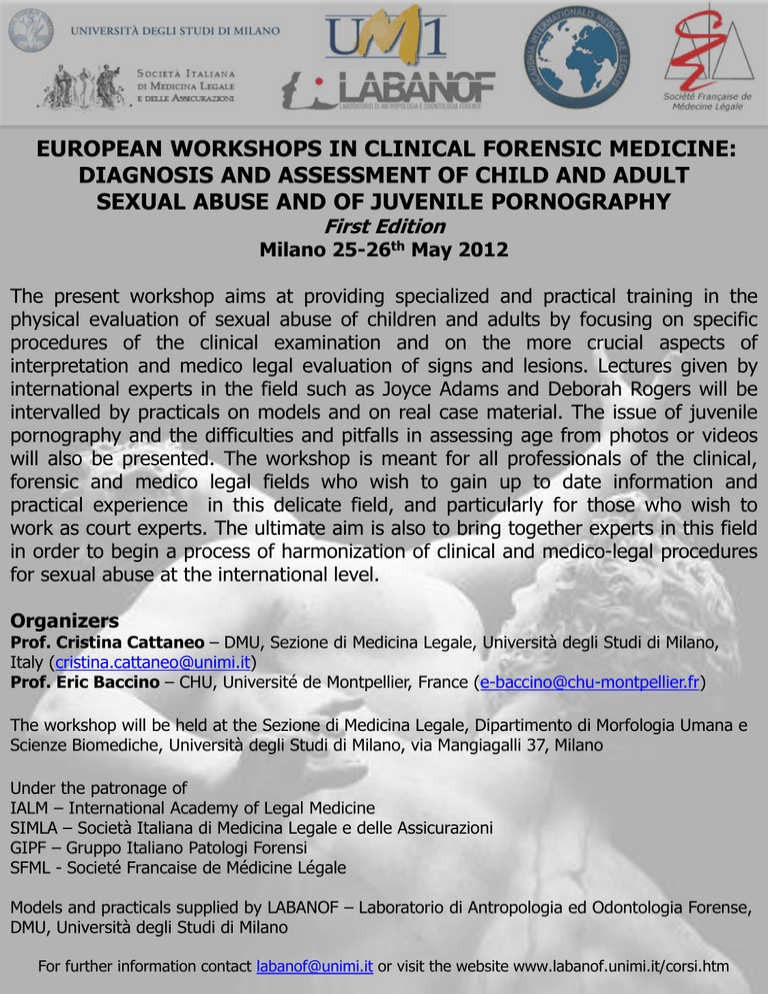 EUROPEAN WORKSHOPS IN CLINICAL FORENSIC MEDICINE: DIAGNOSIS AND ASSESSMENT OF CHILD AND ADULT SEXUAL ABUSE AND OF JUVENILE PORNOGRAPHY First Edition Milano 25-26th May 2012 The present workshop aims at providing specialized and practical training in the physical evaluation of sexual abuse of children and adults by focusing on specific procedures of the clinical examination and on the more crucial aspects of interpretation and medico legal evaluation of signs and lesions. Lectures given by international experts in the field such as Joyce Adams and Deborah Rogers will be intervalled by practicals on models and on real case material. The issue of juvenile pornography and the difficulties and pitfalls in assessing age from photos or videos will also be presented. The workshop is meant for all professionals of the clinical, forensic and medico legal fields who wish to gain up to date information and practical experience in this delicate field, and particularly for those who wish to work as court experts. The ultimate aim is also to bring together experts in this field in order to begin a process of harmonization of clinical and medico-legal procedures for sexual abuse at the international level. Organizers Prof. Cristina Cattaneo – DMU, Sezione di Medicina Legale, Università degli Studi di Milano, Italy ([email protected]) Prof. Eric Baccino – CHU, Université de Montpellier, France ([email protected]) The workshop will be held at the Sezione di Medicina Legale, Dipartimento di Morfologia Umana e Scienze Biomediche, Università degli Studi di Milano, via Mangiagalli 37, Milano Under the patronage of IALM – International Academy of Legal Medicine SIMLA – Società Italiana di Medicina Legale e delle Assicurazioni GIPF – Gruppo Italiano Patologi Forensi SFML - Societé Francaise de Médicine Légale Models and practicals supplied by LABANOF – Laboratorio di Antropologia ed Odontologia Forense, DMU, Università degli Studi di Milano For further information contact [email protected] or visit the website www.labanof.unimi.it/corsi.htm PRELIMINARY PROGRAM Friday May 25th Morning •Introduction to child sexual abuse •Physical examination and signs of child sexual abuse •Classifications and interpretation Afternoon •Practical session on models •Case studies: signs, interpretation and legal outcome Saturday May 26th Morning •Introduction to adult sexual abuse •Physical examination, signs, documentation •Practical session on how to photograph and document lesions •Interpretation and preparing reports Afternoon •Juvenile pornography •Pitfalls in the expertise •Case studies Lecturers Prof. Joyce A. Adams - University of California, San Diego School of Medicine, USA Dr. Deborah J. Rogers – St George’s Hospital Medical School, London, UK Dr. Maria Rosa Giolito – ASL TO2, Torino, Italy Dr. Alessandra Kustermann/Dr. Marina Ruspa – SVS, I.R.C.C.S. Cà Granda Clinica, Ospedale Maggiore Policlinico di Milano, Italy Prof. Eric Baccino – CHU, Université de Montpellier, France Prof. Cristina Cattaneo – DMU, Sezione di Medicina Legale, Università degli Studi di Milano, Italy