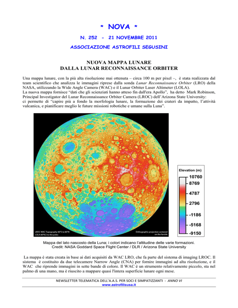* NOVA * N. 252 - 21 NOVEMBRE 2011 ASSOCIAZIONE ASTROFILI SEGUSINI NUOVA MAPPA LUNARE DALLA LUNAR RECONNAISSANCE ORBITER Una mappa lunare, con la più alta risoluzione mai ottenuta – circa 100 m per pixel –, è stata realizzata dal team scientifico che analizza le immagini riprese dalla sonda Lunar Reconnaissance Orbiter (LRO) della NASA, utilizzando la Wide Angle Camera (WAC) e il Lunar Orbiter Laser Altimeter (LOLA). La nuova mappa fornisce “dati che gli scienziati hanno atteso fin dall'era Apollo”, ha detto Mark Robinson, Principal Investigator del Lunar Reconnaissance Orbiter Camera (LROC) dell’Arizona State University: ci permette di “capire più a fondo la morfologia lunare, la formazione dei crateri da impatto, l’attività vulcanica, e pianificare meglio le future missioni robotiche e umane sulla Luna”. Mappa del lato nascosto della Luna; i colori indicano l’altitudine delle varie formazioni. Credit: NASA Goddard Space Flight Center / DLR / Arizona State University La mappa è stata creata in base ai dati acquisiti da WAC LRO, che fa parte del sistema di imaging LROC. Il sistema è costituito da due telecamere Narrow Angle (CNA) per fornire immagini ad alta risoluzione, e il WAC che riprende immagini in sette bande di colore. Il WAC è un strumento relativamente piccolo, sta nel palmo di una mano, ma è riuscito a mappare quasi l'intera superficie lunare ogni mese. NEWSLETTER TELEMATICA DELL’A.A.S. PER SOCI E SIMPATIZZANTI - ANNO VI www.astrofilisusa.it “Raccogliere i dati per creare la nuova mappa ha comportato un enorme sforzo di collaborazione tra il progetto LRO, la squadra LOLA, la squadra LROC in ASU e in Germania presso il DLR”, dice Robinson. “La ricchezza di dettaglio ottenuta dovrebbe fornire materiale di studio per i geologi lunari per molti anni”. Il cratere Buys Ballot ha diametri di circa 47 km e 62 km. La WAC (v. il grafico, non in scala) mostra che il fondo del cratere è circa 3100 metri sotto il bordo occidentale e 4600 m sotto il bordo orientale. Il picco centrale si innalza per circa 800 m. Il centro dell'immagine ha coordinate 19,1° N e 175,3° E . Le immagini in alto mostrano l’altitudine: in una scala di grigi, a sinistra, e in una scala di colori, a destra. (NASA / GSFC / DLR / Arizona State University). Per approfondimenti: http://www.nasa.gov/mission_pages/LRO/news/lro-topo.html http://lroc.sese.asu.edu/news/?archives/484-Lunar-Topography--As-Never-Seen-Before!.html 2 AAS – NOVA N. 252 – 21 NOVEMBRE 2011
