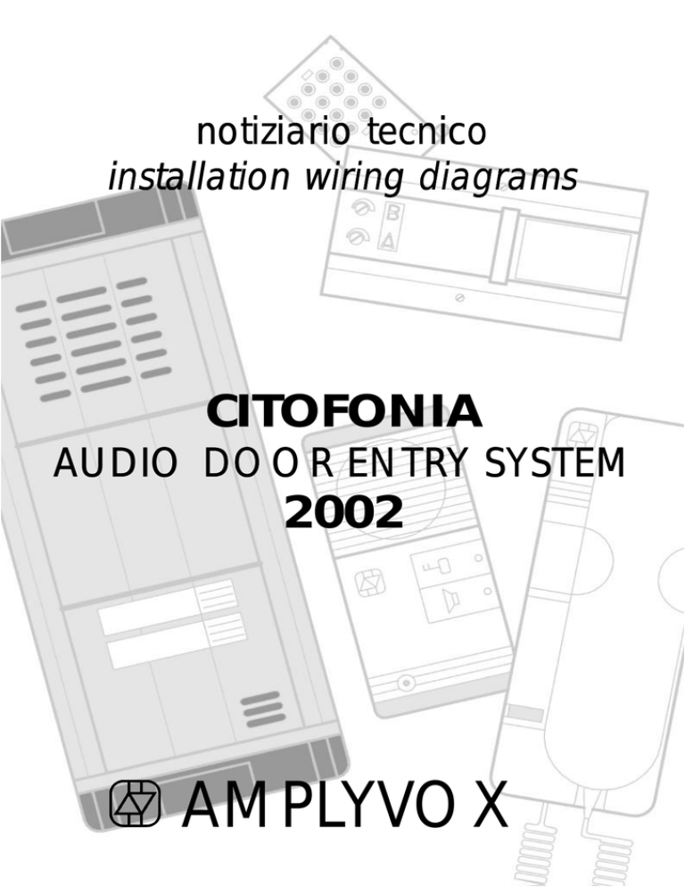 notiziario tecnico installation wiring diagrams CITOFONIA AUDIO DOOR ENTRY SYSTEM 2002 AMPLYVOX 2002 notiziario tecnico installation wiring diagrams CITOFONIA AUDIO DOOR ENTRY SYSTEM Indice Descrizione Sezione conduttori Suggerimenti per la corretta installazione Ricerca guasti e anomalie Posto esterno cod. 2052 Citofoni SYMBOL Citofoni VIVAVOCE Alimentatore-amplificatore cod. 428 Trasformatore cod. 236 - Alimentatori cod. 202 - 202/E cod. 203 Commutatori cod. 264 cod. 266 Relè cod. 859/20 - Commutatore cod. 258 Citofono SYMBOL intercomunicante Posto esterno cod. 2054 “sistema 1+n” Citofoni SYMBOL “sistema 1+n” Alimentatore cod. 8605 “sistema 1+n” Commutatore cod. 8845 “sistema 1+n” Circuito diodi cod. 2610/4 “sistema 1+n” Impianti citofonici a cablaggio tradizionale “sistema 4+n” Kit unifamiliare Kit bifamiliare Impianto plurifamiliare Impianto plurifamiliare bicanale Impianto plurifamiliare con chiamata elettronica Impianto plurifamiliare con chiamata di piano Impianto con centralino di portineria Impianto commutato con centralino di portineria a sezioni Impianto plurifamiliare commutato: due pulsantiere principali Impianto bicanale commutato: due pulsantiere principali Impianto commutato con pulsantiera generale e pulsantiere di scala Impianto bicanale commutato: pulsantiera generale e pulsantiere di scala Kit unifamiliare intercomunicante Impianto citofonico intercomunicante Kit unifamiliare intercomunicante con posto esterno Impianto unifamiliare intercomunicante con posto esterno Collegamento di piu’ citofoni in parallelo Collegamento relè interfaccia serratura Collegamento di un centralino telefonico Collegamento di una suoneria supplementare generica Collegamento di una suoneria supplementare cod. 853 Impianti citofonici a cablaggio semplificato “sistema 1+n” Kit unifamiliare Kit bifamiliare Impianto plurifamiliare Impianto plurifamiliare con chiamata di piano Impianto plurifamiliare commutato: due pulsantiere principali Impianto plurifamiliare commutato: tre o piu’ pulsantiere principali Collegamento di un citofono in parallelo Collegamento di una suoneria supplementare cod. 853/1 Schema Pag. 2/IT 3/IT 4/IT 5/IT 6/IT 7/IT 8/IT 9/IT 10/IT 11/IT 12/IT 13/IT 13/IT 14/IT 15/IT 16/IT 2301# 2302# 2320# 2321# 2311# 2310# 2350# 2351# 2410# 2411# 2451# 2452# 2703# 2703/1# 2701# 2702# 1 2 3 4 5 6 7 8 9 10 11 12 13 14 15 16 17 18 18 19 19 2211# 2212# 2221# 2223# 2240# 2241# 20 21 22 23 24 25 26 26 Avvertenze a) Si raccomanda di utilizzare componenti originali Amplyvox. b) Le apparecchiature presenti in questo schemario sono ampiamente descritte nel catalogo citofonia. c) La Amplyvox S.p.A. si riserva la facoltà di variare le caratteristiche tecniche, estetiche e dimensionali delle apparecchiature descritte in questo schemario senza alcun preavviso. Note PER FACILITARE LA LETTURA DELLO SCHEMA DI COLLEGAMENTO LA DISPOSIZIONE DEI MORSETTI PUO’ NON CORRISPONDERE ALLA REALE DISPOSIZIONE DEI MEDESIMI SUGLI APPARECCHI. SI RACCOMANDA DI NON SERRARE OLTRE MISURA LE VITI DEI MORSETTI DELLE APPARECCHIATURE PERCHE’, OLTRE CHE INUTILE, L’ECCESSIVA PRESSIONE ASSIALE SUL MORSETTO POTREBBE DANNEGGIARE IL CIRCUITO STAMPATO SOTTOSTANTE. 1/IT 2002 notiziario tecnico CITOFONIA installation wiring diagrams AUDIO DOOR ENTRY SYSTEM Componenti pulsantiera Pulsanti di chiamata Altoparlante (cod. 007/2 - 007/3) Microfono elettrete preamplificato (cod. 011/1 - 011/3) Posto esterno amplificato cod. 2052 LEGENDA: Posto esterno amplificato cod. 2054 Lampada portacartellini (24 V - 3 W) Y : pulsante apriporta J : chiamata di piano S.E. : serratura elettrica 12 Vca - 18 VA W : contatto esterno Sezione conduttori 100 mt. 1 200 mt. mm 2 mm 0,5 mm 1 mm Suggerimenti per posa in opera PULSANTIERA: Componibile Monoplacca Mosaico 2/IT VIVAVOCE CITOFONI notiziario tecnico 2002 installation wiring diagrams Suggerimenti per la corretta installazione CITOFONIA AUDIO DOOR ENTRY SYSTEM 1) Non effettuare collegamenti, sostituzioni ed altre operazioni ad impianto alimentato. 2) Non canalizzare i conduttori citofonici con i conduttori di rete. 3) Utilizzare relè di interfacciamento (cod. 859/20) per il comando di apertura della serratura elettrica in impianti con linee lunghe per eliminare possibili ronzii causati dall'induzione dell'alternata sul cavo. 4) Utilizzare relè di interfacciamento (cod. 859/20) per il controllo di comandi esterni quali suonerie supplementari, luce scale, etc. 5) In presenza di più morsetti "H" sulle apparecchiature, il collegamento dei conduttori interessati a tali terminali risulta indifferente. 6) Per l'accensione delle lampadine nella pulsantiera, prevedere un trasformatore a parte (di potenza adeguata al numero delle lampade) ed i relativi due conduttori di alimentazione. 7) Impianto bicanale:: quando e' possibile si consiglia di attorcigliare tra di loro i due conduttori "A "e "B" ed i due "U" e "UO". Tale operazione specialmente nel caso di linee molto lunghe, elimina le eventuali possibilita' di induzioni. 8) Impianto bicanale:: se si dovessero usare dei citofoni "Symbol" e' necessario provvedere a montare in serie al morsetto "T" una resistenza di 100 ohm ¼ W. Controlli preliminari Prima di collegare l'impianto è opportuno effettuare i seguenti controlli: 1) Accertare la corrispondenza dei collegamenti secondo gli schemi forniti con l'apparecchiatura. 2) Nel caso di alimentatori cod. 202 - 202/E - 203 controllare che non sia presente un corto circuito tra il morsetto "H" e "+". Prove di funzionamento 1) Alimentare il sistema. 2) Premere un pulsante di chiamata e verificare la ricezione della stessa sui derivati. 3) La prova fonica deve essere effettuata parlando alla distanza di 20 cm. dal posto esterno audio. L'alimentatore - amplificatore (cod. 428) e il posto esterno (cod. 2052 - 2054) sono normalmente tarati all'atto del collaudo. Nel caso si rendesse necessaria una regolazione differente, si dovrà agire sui rispettivi potenziometri. "A A" = volume in