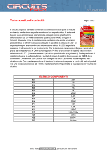 Designed by THOR Europe LOCALIZZATORE ! ! ! ! ! PROFESSIONALE DI CORTOCIRCUITI Localizza i cortocircuiti tra piste, filature o cablaggi precedentemente individuati manualmente o tramite ATE. Funzione per verificare la continuità in cablaggi e filature Bassa energia ai puntali per non danneggiare i componenti Principio di funzionamento basato sulla analisi della variazione della resistenza elettrica. Algoritmo di ricerca ottimizzato tramite microprocessore. T25 localizza rapidamente i cortocircuiti anche nei casi più difficili quali: - cortocircuiti tra piste di un bus lunghissimo, su schede o cartemadri cortocircuiti tra piste molto larghe cortocircuiti sotto i componenti cortocircuiti nei fori metallizzati di circuiti stampati multistrato cortocircuiti in quadri o pannelli con cablaggi molto densi I problemi risolti dal localizzatore di cortocircuiti T25 Quando, con un collaudo su apparecchi automatici (ATE) oppure manualmente, si diagnostica un cortocircuito tra due punti, non sempre è facile localizzarlo ed eliminarlo e tipicamente: - Si perdono ore sotto la lente di ingrandimento - Si cominciano a togliere componenti a caso sulle schede - Si cominciano a staccare i cablaggi in più punti - Si usa il trapanino per togliere la metallizzazione di fori passanti nelle schede multistrato - E, a volte, quando la ricerca del cortocircuito ha richiesto troppo tempo senza esito positivo, si arriva addirittura a gettare via la scheda Descrizione Il T 25 è un utilissimo strumento per la localizzazione di cortocircuiti qualora, manualmente o con un ATE, si riscontri il cortocircuito tra due punti siano essi piste, filature o cablaggi. Funziona sul principio della misurazione della resistenza elettrica delle piste, che ovviamente diminuisce avvicinandosi al cortocircuito ed aumenta quando ci si allontana. La Praticità: grazie al suo design ergonomico a forma di penna, di poco ingombro, leggero e facilmente trasportabile. La Facilità d’uso: il suo sofisticato sistema di apprendimento, grazie al microprocessore interno, permette all’operatore di avvicinarsi progressivamente e agevolmente al cortocircuito tramite l’indicazione a LED, posta direttamente sul puntale di misura, ed alla indicazione acustica multifrequenza che indicano all’operatore se si sta allontanando o avvicinando al cortocircuito. La Sicurezza: garantita dalla bassa tensione e dalla bassa corrente impulsiva presente sui puntali, ne consente l’uso anche su schede con componenti assemblati senza il pericolo di danneggiarli. Le parti in esame non devono essere alimentate. La Comodità: il sistema autorange permette di ottenere una grande risoluzione diagnostica mantenendo un ampio range di resistenza apprezzabile e associato ad un algoritmo di ricerca unico nel suo genere è in grado di individuare con estrema facilità i cortocircuiti, anche nelle condizioni meno ottimali quali bus di alimentazione con sezioni elevate o bus dati con net molto lunghe e diramate. L’Autodiagnosi dei circuiti interni viene effettua automaticamente ad ogni accensione. Le Modalità d’uso selezionabili sono due: la funzione Trovacorti per localizzare i cortocircuiti e la funzione Cicalino per verificare le continuità in cablaggi e filature. Funzione TROVACORTI Funzione CICALINO E’ la modalità d’uso per localizzare i cortocircuiti. Si parte toccando due punti qualsiasi delle due piste in corto con i puntali e memorizzando quella posizione. Spostandosi con un puntale per volta lo strumento indica se ci si avvicina o ci si allontana dal cortocircuito. In pochi secondi si memorizzano varie tappe di avvicinamento sino ad arrivare direttamente sopra al cortocircuito. L’indicazione di avvicinamento, punto memorizzato e allontanamento sono sia visive che acustiche. I circuiti in esame devono essere spenti. È la funzione per verificare le continuità in cablaggi e filature. Con i due puntali si toccano i punti in esame e se vi è una resistenza inferiore a 40 Ω si accende un LED e suona il buzzer. Il primo led si accende se la resistenza è <50Ω il secondo se <20 Ω ed il terzo se <2Ω. I circuiti in esame devono essere spenti. APPLICAZIONI TIPICHE Funzione TROVACORTI: - Produzione di circuiti stampati - Ricerca corti su schede con circuito stampato Ricerca corti su schede filate Cablaggio pannelli e quadri elettrici Montaggio e collaudo schede Laboratorio (singola/doppia faccia e multistrati) Schede Filature / C.S. Carte madri Cablaggi Funzione CICALINO - Assemblaggio e/o collaudo manuale cavi Collaudo punto a punto di carte madri cablate a wire wrap Cablaggio pannelli e quadri elettrici Verifica filature su schede Caratteristiche tecniche o o o o o o o o Range di resistenza Massima tensione a puntali aperti Massima corrente impulsiva (ton 10%) Lunghezza cavo puntale Alimentazione T25 Alimentatore esterno (in dotazione) Dimensioni penna T25 Peso (escluso alimentatore est.) THOR Europe TIMBRO RIVENDITORE 1 mΩ ÷ >40Ω <0.5V <100mA 100cm 12 Vcc 220Vac 12.5W 105x25x45 cm < 70g www.thor.to.it Rel: 2002/1 – All right reserved
