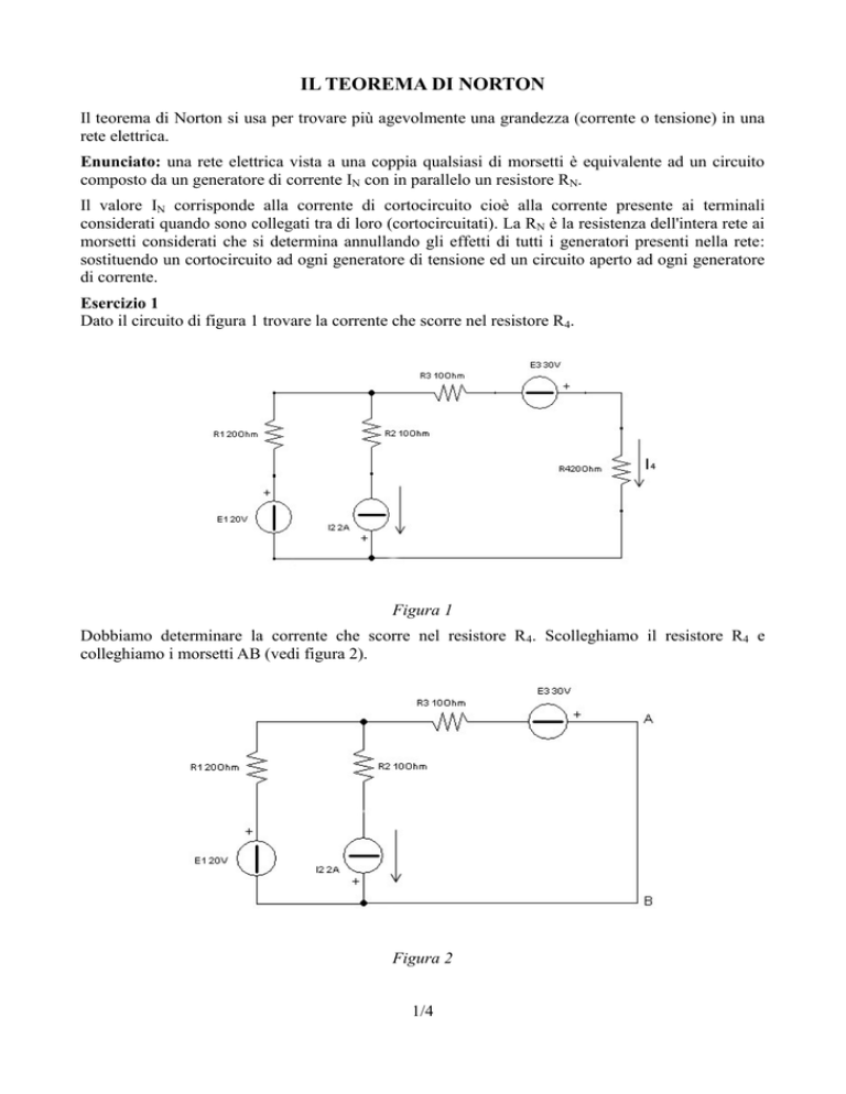 IL TEOREMA DI NORTON Il teorema di Norton si usa per trovare più agevolmente una grandezza (corrente o tensione) in una rete elettrica. Enunciato: una rete elettrica vista a una coppia qualsiasi di morsetti è equivalente ad un circuito composto da un generatore di corrente IN con in parallelo un resistore RN. Il valore IN corrisponde alla corrente di cortocircuito cioè alla corrente presente ai terminali considerati quando sono collegati tra di loro (cortocircuitati). La RN è la resistenza dell'intera rete ai morsetti considerati che si determina annullando gli effetti di tutti i generatori presenti nella rete: sostituendo un cortocircuito ad ogni generatore di tensione ed un circuito aperto ad ogni generatore di corrente. Esercizio 1 Dato il circuito di figura 1 trovare la corrente che scorre nel resistore R4. Figura 1 Dobbiamo determinare la corrente che scorre nel resistore R4. Scolleghiamo il resistore R4 e colleghiamo i morsetti AB (vedi figura 2). Figura 2 1/4 Determinazione della resistenza equivalente RN: Per determinare RN dobbiamo sostituire un cortocircuito ad ogni generatore di tensione ed un circuito aperto ad ogni generatore di corrente. Otteniamo il circuito di figura 3. Figura 3 Se collegassimo un ohmetro ai norsetti AB misureremmo una resistenza pari alla serie delle resistenze R1 ed R3, quindi: Determinazione del generatore equivalente IN: La corrente erogata dal generatore equivalente è la corrente di cortocircuito che scorre nel cavo che collega i morsetti AB. (Vedi figura 4). Figura 4 Nel ciscuito dato sono presenti 3 generatori. Troviamo la corrente di cortocircuito con la sovrapposizione degli effetti. Contributo di E1: Facendo agire solo il generatore di tensione E1 troviamo lo schema di figura 5: Figura 5 2/4 Si vede che abbiamo una sola maglia: il resistore R2 è scollegato e gli altri due sono in serie quindi il circuito si riduce a quello di figura 6. Figura 6 La corrente di corticircuito è data da: Notare che il verso è concorde con la corrente di cortocircuito. Contributo di I2: Facciamo agire solo il generatore di corrente. Figura 7 La corrente del generatore si distribuisce nei due rami del circuito secondo i versi indicati in figura 7 (imposti dal generatore). Lo schema rappresenta un partitore di tensione. Notare che il verso della corrente di cortocircuito è discorde rispetto a quello della corrente sul resistore R3. Contributo di E3: Troviamo, infine, il contributo del generatore E3. Figura 8 3/4 Anche in questo caso abbiamo una sola maglia. Il resistore R2 è scollegato e R1 e R3 sono in serie quindi: A questo punto possiamo trovare la corrente del circuito equivalente che è data da: Disegnamo il circuito equivalente: Figura 9 A questo punto possiamo calcolare la corente richiesta con il partitore di corrente. Facciamo attenzione ai segni: abbiamo sempre clcolato la corrente di cortocircuito verso il basso quindi il generatore equivalente di Norton va disegnato come in figura. La corrente che scorre nel resistore R4 è verso l’alto (rappresenta, infatti, una parte della corrente del generatore che si divide tra i due rami). Nell’esercizio ci viene richiesto di trovare la corrente I4 verso il basso pertanto le due correnti sono discordi. 4/4