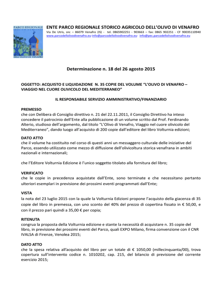ENTE PARCO REGIONALE STORICO AGRICOLO DELL’OLIVO DI VENAFRO Via De Utris, snc – 86079 Venafro (IS) - tel. 0865902251 - 903663 – fax: 0865 902251 - CF 90035110940 [email protected] [email protected] Determinazione n. 18 del 26 agosto 2015 OGGETTO: ACQUISTO E LIQUIDAZIONE N. 35 COPIE DEL VOLUME “L’OLIVO DI VENAFRO – VIAGGIO NEL CUORE OLIVICOLO DEL MEDITERRANEO” IL RESPONSABILE SERVIZIO AMMINISTRATIVO/FINANZIARIO PREMESSO che con Delibera di Consiglio direttivo n. 21 del 22.11.2011, il Consiglio Direttivo ha inteso concedere il patrocinio dell’Ente alla pubblicazione di un volume scritto dal Prof. Ferdinando Alterio, studioso dell’argomento, dal titolo “L’Olivo di Venafro, Viaggio nel cuore olivicolo del Mediterraneo”, dando luogo all’acquisto di 200 copie dall’editore del libro Volturnia edizioni; DATO ATTO che il volume ha costituito nel corso di questi anni un messaggero culturale delle iniziative del Parco, essendo utilizzato come mezzo di diffusione dell’olivicoltura storica venafrana in ambiti nazionali e internazionali; che l’Editore Volturnia Edizione è l’unico soggetto titolato alla fornitura del libro; VERIFICATO che le copie in precedenza acquistate dall’Ente, sono terminate e che necessitano pertanto ulteriori esemplari in previsione dei prossimi eventi programmati dall’Ente; VISTA la nota del 23 luglio 2015 con la quale la Volturnia Edizioni propone l’acquisto della giacenza di 35 copie del libro in premessa, con uno sconto del 40% del prezzo di copertina fissato in € 50,00, e con il prezzo pari quindi a 35,00 € per copia; RITENUTA congrua la proposta della Volturnia edizione e stante la necessità di acquistare n. 35 copie del libro, in previsione dei prossimi eventi del Parco, quali EXPO Milano, firma convenzione con il CNR IVALSA di Firenze, Venolea 2015; DATO ATTO che la spesa relativa all’acquisto del libro per un totale di € 1050,00 (millecinquanta/00), trova copertura sull’intervento codice n. 1010202, cap. 215, del bilancio di previsione del corrente esercizio 2015; DETERMINA - di impegnare, sull’Intervento codice n. 1010202 n. 215 del bilancio di previsione, corrente esercizio, la somma di €. 1050,00 (millecinquanta/00), per il finanziamento della spesa relativa all’acquisto del libro “L’Olivo di Venafro, Viaggio nel cuore olivicolo del Mediterraneo”; - di acquistare il “L’Olivo di Venafro, Viaggio nel cuore olivicolo del Mediterraneo” e di liquidare la somma di 1050,00 (millecinquanta/00) alla Ditta Volturnia Edizioni, con sede a Cerro a V.no (IS), Piazza Santa Maria, 5, P. IVA 00827520941, a presentazione della fattura, previa verifica della regolarità della fornitura e del documento di regolarità contributiva e previdenziale della ditta. Il Responsabile finanziario – amministrativo Rag. Benedetto Iannacone Documento informatico sottoscritto con firma digitale ai sensi dell’Art.24 del D.Lgs. 07/03/2005 n.82