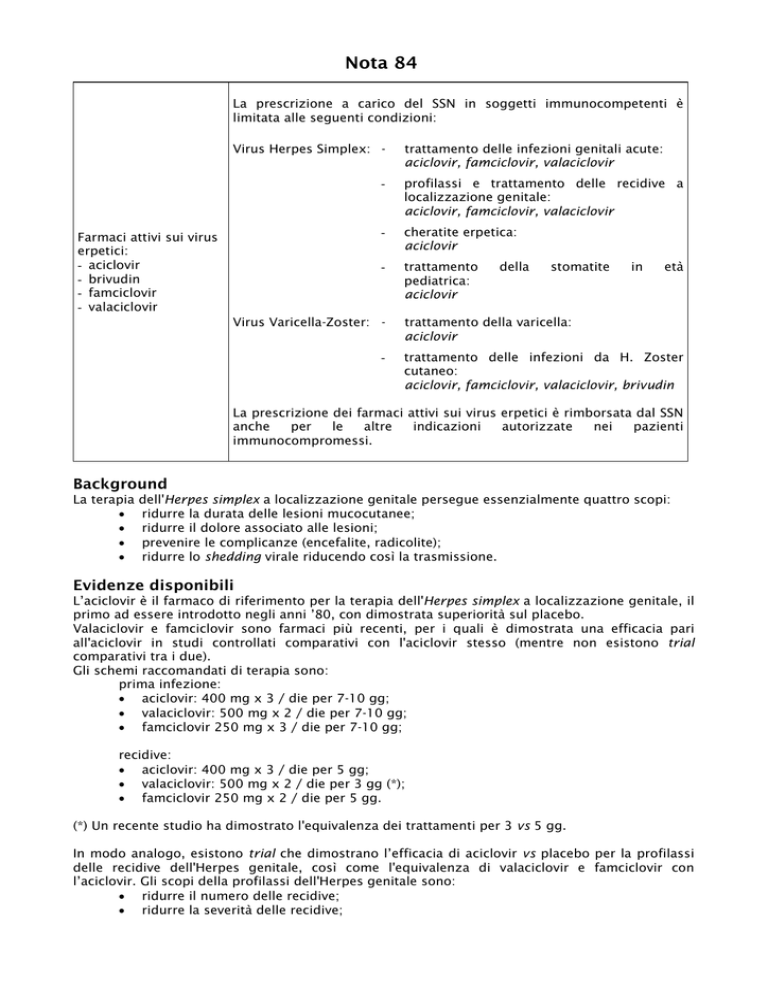 Nota 84 La prescrizione a carico del SSN in soggetti immunocompetenti è limitata alle seguenti condizioni: Virus Herpes Simplex: - Farmaci attivi sui virus erpetici: - aciclovir - brivudin - famciclovir - valaciclovir trattamento delle infezioni genitali acute: aciclovir, famciclovir, valaciclovir - profilassi e trattamento delle recidive a localizzazione genitale: aciclovir, famciclovir, valaciclovir - cheratite erpetica: aciclovir - trattamento pediatrica: aciclovir Virus Varicella-Zoster: - della stomatite in età trattamento della varicella: aciclovir trattamento delle infezioni da H. Zoster cutaneo: aciclovir, famciclovir, valaciclovir, brivudin La prescrizione dei farmaci attivi sui virus erpetici è rimborsata dal SSN anche per le altre indicazioni autorizzate nei pazienti immunocompromessi. Background La terapia dell'Herpes simplex a localizzazione genitale persegue essenzialmente quattro scopi: ridurre la durata delle lesioni mucocutanee; ridurre il dolore associato alle lesioni; prevenire le complicanze (encefalite, radicolite); ridurre lo shedding virale riducendo così la trasmissione. Evidenze disponibili L’aciclovir è il farmaco di riferimento per la terapia dell'Herpes simplex a localizzazione genitale, il primo ad essere introdotto negli anni ’80, con dimostrata superiorità sul placebo. Valaciclovir e famciclovir sono farmaci più recenti, per i quali è dimostrata una efficacia pari all'aciclovir in studi controllati comparativi con l'aciclovir stesso (mentre non esistono trial comparativi tra i due). Gli schemi raccomandati di terapia sono: prima infezione: aciclovir: 400 mg x 3 / die per 7-10 gg; valaciclovir: 500 mg x 2 / die per 7-10 gg; famciclovir 250 mg x 3 / die per 7-10 gg; recidive: aciclovir: 400 mg x 3 / die per 5 gg; valaciclovir: 500 mg x 2 / die per 3 gg (*); famciclovir 250 mg x 2 / die per 5 gg. (*) Un recente studio ha dimostrato l'equivalenza dei trattamenti per 3 vs 5 gg. In modo analogo, esistono trial che dimostrano l’efficacia di aciclovir vs placebo per la profilassi delle recidive dell'Herpes genitale, così come l'equivalenza di valaciclovir e famciclovir con l’aciclovir. Gli scopi della profilassi dell'Herpes genitale sono: ridurre il numero delle recidive; ridurre la severità delle recidive; migliorare la salute psico-sociale del soggetto affetto; ridurre lo shedding virale asintomatico riducendo così la trasmissione (fino all'80% delle nuove infezioni erpetiche sono acquisite da fonte asintomatica). Gli schemi raccomandati di profilassi sono (in genere per 9 mesi, ripetibile): aciclovir: 400 mg x 2 / die; valaciclovir: 500-1000 mg / die; famciclovir 250 mg x 2 / die. Il vantaggio di famciclovir e valaciclovir rispetto ad aciclovir è nella posologia, con un minor numero di assunzioni giornaliere e/o giorni di trattamento. Per quanto concerne la terapia della varicella, l’aciclovir è il farmaco di riferimento, il primo ad essere introdotto negli anni ’80. Non vi sono studi clinici controllati di confronto di valaciclovir e famciclovir con aciclovir. Valaciclovir e famciclovir non sono autorizzati per il trattamento della varicella. Per la terapia dell'Herpes zoster, invece, l'aciclovir non è più generalmente considerato il farmaco di riferimento, sebbene l'efficacia rispetto al placebo rimanga confermata. Valaciclovir risulta infatti più efficace di aciclovir nell’accorciamento della durata del dolore associato alle lesioni cutanee e nella riduzione della neurite post-erpetica. Famciclovir è equivalente ad aciclovir in termini di risoluzione delle lesioni cutanee e del dolore associato. Valaciclovir e famciclovir sono stati giudicati equivalenti per quanto riguarda tempo di risoluzione del dolore e nella prevenzione della neuropatia posterpetica. Brivudin è una analogo nucleosidico pirimidinico (a differenza di aciclovir che è un analogo nucleosidico purinico) registrato per la sola indicazione dell'infezione da Herpes Zoster. Gli studi registrativi di Brivudin dimostrano una riduzione statisticamente significativa (da 17 a 13 ore rispetto all’aciclovir) del tempo di eruzione di nuove lesioni vescicolose da VZV. Il tempo di crostizzazione delle lesioni e di scomparsa del dolore associato alla fase acuta sono simili per brivudin e aciclovir. È, inoltre, suggerita la possibile riduzione dell’incidenza (ma non della durata) delle lesioni vescicolose. Uno studio ha dimostrato una riduzione statisticamente significativa della neurite post-erpetica (PHN) in soggetti trattati con brivudin vs aciclovir. Gli schemi raccomandati di terapia sono: aciclovir: 800 mg x 5 / die; valaciclovir: 1000 mg x 3 / die; famciclovir 250 - 500 mg x 3 / die; brivudin 125 mg x 1 / die. Particolari avvertenze La gengivostomatite erpetica è la più comune manifestazione clinica dell'infezione primaria da HSV-1 in età pediatrica. Sebbene si tratti di una malattia autolimitantesi, essa ha un decorso di 1014 giorni e determina difficoltà alla alimentazione e alla reidratazione che spesso conducono all'ospedalizzazione. In uno studio controllato in bambini di età compresa fra 1 e 6 anni il trattamento con aciclovir ha dimostrato più precoce scomparsa delle lesioni e dei sintomi, riduzione del tempo di viral shedding, basso tasso di ricorrenze, assenza di eventi avversi rispetto al placebo. Bibliografia 1 2 3 4 5 6 Amir J, et al. Treatment of HSV gengivostomatitis with acyclovir in children: a randomised double trial blind placebo controlled study. BMJ 1997; 314:1800-3. Beutner KR, et al. Valaciclovir compared with acyclovir for improved therapy for herpes zoster in immunocompetent adults. Antimicrob Agents Chemother 1995;39:1546–53. Cohen JI, et al. Recent advances in varicella zoster virus infection: Ann Intern Med 1999; 130:922–32. Degreef H. Famciclovir, a new oral anti-herpes drug: results of the first controlled clinical study demonstrating its efficacy and safety in the treatment of uncomplicated herpes zoster in immunocompetent pa