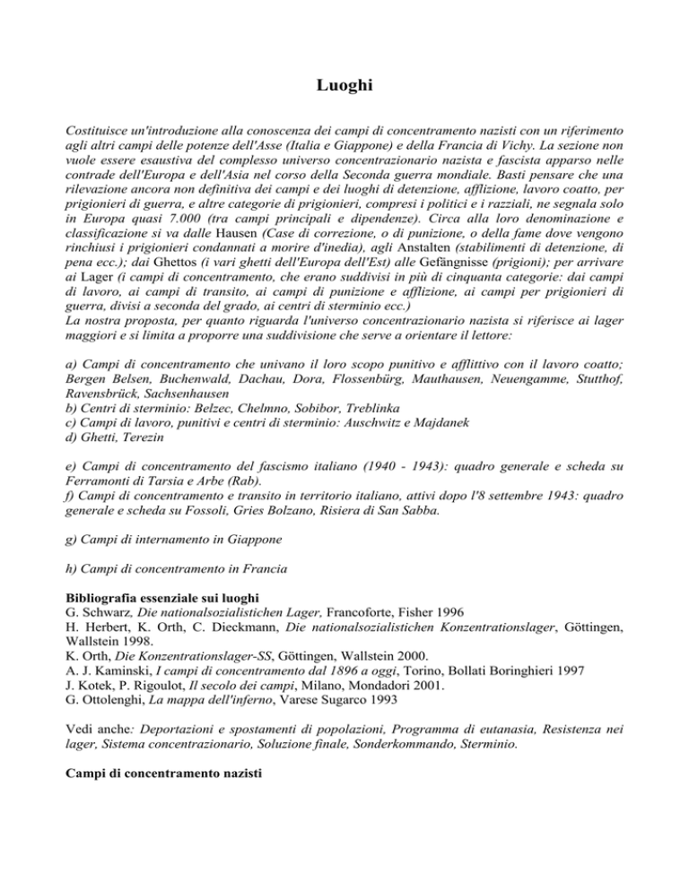 Luoghi Costituisce un'introduzione alla conoscenza dei campi di concentramento nazisti con un riferimento agli altri campi delle potenze dell'Asse (Italia e Giappone) e della Francia di Vichy. La sezione non vuole essere esaustiva del complesso universo concentrazionario nazista e fascista apparso nelle contrade dell'Europa e dell'Asia nel corso della Seconda guerra mondiale. Basti pensare che una rilevazione ancora non definitiva dei campi e dei luoghi di detenzione, afflizione, lavoro coatto, per prigionieri di guerra, e altre categorie di prigionieri, compresi i politici e i razziali, ne segnala solo in Europa quasi 7.000 (tra campi principali e dipendenze). Circa alla loro denominazione e classificazione si va dalle Hausen (Case di correzione, o di punizione, o della fame dove vengono rinchiusi i prigionieri condannati a morire d'inedia), agli Anstalten (stabilimenti di detenzione, di pena ecc.); dai Ghettos (i vari ghetti dell'Europa dell'Est) alle Gefängnisse (prigioni); per arrivare ai Lager (i campi di concentramento, che erano suddivisi in più di cinquanta categorie: dai campi di lavoro, ai campi di transito, ai campi di punizione e afflizione, ai campi per prigionieri di guerra, divisi a seconda del grado, ai centri di sterminio ecc.) La nostra proposta, per quanto riguarda l'universo concentrazionario nazista si riferisce ai lager maggiori e si limita a proporre una suddivisione che serve a orientare il lettore: a) Campi di concentramento che univano il loro scopo punitivo e afflittivo con il lavoro coatto; Bergen Belsen, Buchenwald, Dachau, Dora, Flossenbürg, Mauthausen, Neuengamme, Stutthof, Ravensbrück, Sachsenhausen b) Centri di sterminio: Belzec, Chelmno, Sobibor, Treblinka c) Campi di lavoro, punitivi e centri di sterminio: Auschwitz e Majdanek d) Ghetti, Terezin e) Campi di concentramento del fascismo italiano (1940 - 1943): quadro generale e scheda su Ferramonti di Tarsia e Arbe (Rab). f) Campi di concentramento e transito in territorio italiano, attivi dopo l'8 settembre 1943: quadro generale e scheda su Fossoli, Gries Bolzano, Risiera di San Sabba. g) Campi di internamento in Giappone h) Campi di concentramento in Francia Bibliografia essenziale sui luoghi G. Schwarz, Die nationalsozialistichen Lager, Francoforte, Fisher 1996 H. Herbert, K. Orth, C. Dieckmann, Die nationalsozialistichen Konzentrationslager, Göttingen, Wallstein 1998. K. Orth, Die Konzentrationslager-SS, Göttingen, Wallstein 2000. A. J. Kaminski, I campi di concentramento dal 1896 a oggi, Torino, Bollati Boringhieri 1997 J. Kotek, P. Rigoulot, Il secolo dei campi, Milano, Mondadori 2001. G. Ottolenghi, La mappa dell'inferno, Varese Sugarco 1993 Vedi anche: Deportazioni e spostamenti di popolazioni, Programma di eutanasia, Resistenza nei lager, Sistema concentrazionario, Soluzione finale, Sonderkommando, Sterminio. Campi di concentramento nazisti Bergen Belsen Nel settembre del 1940, a Bergen-Belsen, una città tedesca a cento chilometri sud-ovest di Amburgo e a sessantacinque chilometri a nord-est di Hannover, viene creato un campo di internamento per prigionieri di guerra, destinato a seicento soldati belgi e francesi, che sono trattati secondo le norme del diritto internazionale. I prigionieri di guerra russi, che giungono al campo a partire dal mese di luglio del 1941, invece, vengono sottoposti a un duro regime di afflizioni; tanto che già nel novembre del 1942 almeno 18.000 russi hanno trovato la morte per fame, freddo, ed epidemie di tifo. Il campo per prigionieri di guerra successivamente vedrà l'arrivo di altri militari e tra essi, polacchi, francesi e italiani. Oggi i morti di questo settore del campo sono stimati tra i 30.000 e i 50.000. In seguito, Bergen-Belsen assume una struttura molto più complessa e in continua trasformazione. Nell'aprile del 1943, Himmler chiede di dare vita, nella stessa località, a un lager per circa diecimila ebrei, tra i quali inserire anche quelli che a causa della loro nazionalità straniera sono sfuggiti alle deportazioni e per questo possono essere scambiati con tedeschi prigionieri degli Alleati (il nome di Bergen-Belsen appare per la prima volta in un documento SS in data 27 aprile 1943). Il capitano SS Adolf Haas riceve l'incarico del comando del campo, e procede a fare costruire un crematorio e a isolare sei blocchi riservati ai prigionieri ebrei, provenienti per lo più dall'Olanda, destinati a essere scambiati (Sternlager); vicino a questo settore, ma separato da filo spinato, sorgono i blocchi riservati agli ebrei muniti di passaporto di Paesi neutrali - Spagna, Portogallo, Argentina, Turchia (Neutralenlager). Circa verso la metà del 1943, giungono al campo 2.500 ebrei polacchi, internati in un terzo settore e sottoposti a un trattamento molto duro (Sonderlager). In seguito verranno inviati ad Auschwitz. Nel luglio del 1944 viene predisposto un quarto settore destinato a quasi 1.700 ebrei ungheresi che Himmler si propone di liberare in cambio di una forte cifra negoziata con alcune organizzazioni ebraiche internazionali (Ungarnlager). Un quinto settore di prigionieri destinati al lavoro pesante (anche non ebrei) completa la struttura del campo (Häftlingslager). Ma già a partire dal marzo del 1944, Bergen-Belsen sembra destinato, almeno sulla carta a ricevere detenuti non più in grado di lavorare e ammalati (da qui la sua ulteriore denominazione di Ruhe oder Erhholungslager (campo di riposo o di convalescenza), nel quale tuttavia i livelli di mortalità non sono dissimili da quelli degli altri lager. Il comandante del campo viene sostituito con l'SS Josef Kramer, uno specialista, entrato in servizio a Dachau nel 1934 e proveniente da AuschwitzBirkenau. Nell'ottobre-novembre del 1944, il lager subisce una nuova trasformazione e viene denominato Durchgangslager (campo di transito) e si prepara a ricevere gli internati di altri lager, evacuati perché siti in prossimità dell'avanzata delle truppe alleate. In questa occasione arrivano prigioni