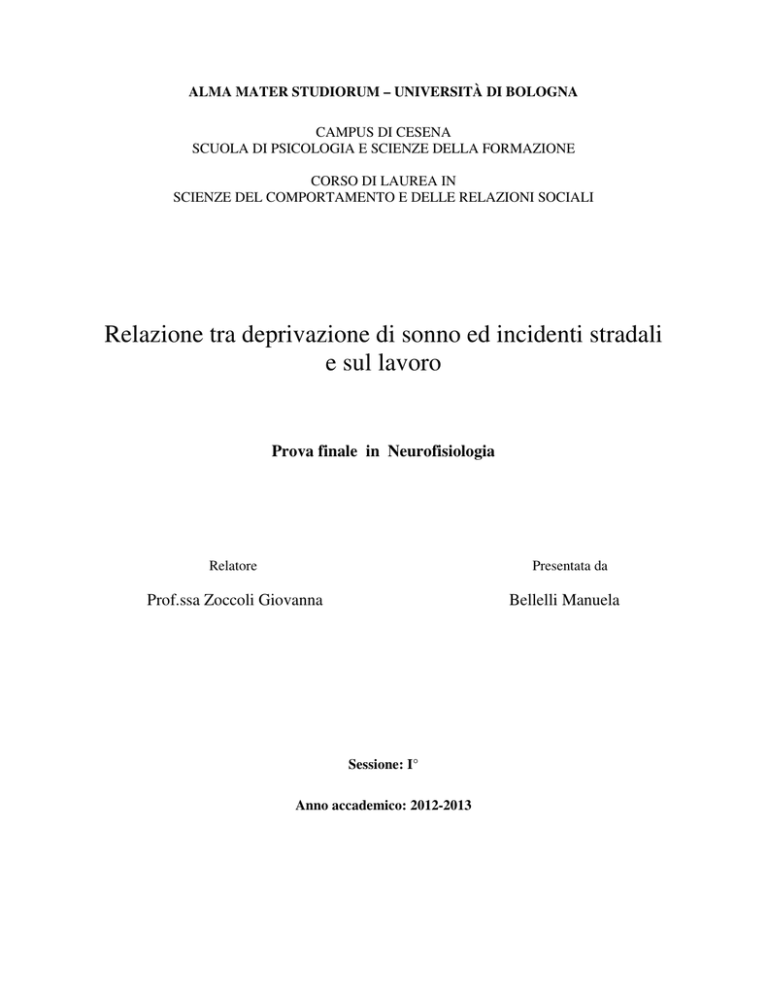 ALMA MATER STUDIORUM – UNIVERSITÀ DI BOLOGNA CAMPUS DI CESENA SCUOLA DI PSICOLOGIA E SCIENZE DELLA FORMAZIONE CORSO DI LAUREA IN SCIENZE DEL COMPORTAMENTO E DELLE RELAZIONI SOCIALI Relazione tra deprivazione di sonno ed incidenti stradali e sul lavoro Prova finale in Neurofisiologia Relatore Presentata da Prof.ssa Zoccoli Giovanna Bellelli Manuela Sessione: I° Anno accademico: 2012-2013 Indice 1. 2. 2.1. 2.2. 2.3. 2.3.1. 2.3.2. 2.4. 2.5. 2.6. 2.6.1. 2.6.2. 2.6.3 2.7. 2.7.1. 2.7.2. 2.7.3. 2.7.4. 2.8. 3. 3.1. 3.2. 3.3. 3.4. 3.4.1. 3.5. 3.5.1. 3.5.2. 3.5.3. 3.5.4. 3.6. 3.7. 3.8. 4. 4.1. 4.2. Introduzione …………………………………………………………………… Il sonno…………………………………………………………………………. Centri nervosi che regolano il ciclo veglia sonno ……………………………… Interazioni talamo corticali …………………………………………………….. Stadi del sonno …………………………………………………………………. Sonno non REM (ad onde lente) ………………………………………………. Sonno REM ……………………………………………………………………. Modificazioni fisiologiche durante il sonno …………………………………… Organizzazione del ciclo di sonno …………………………………………….. Funzioni del sonno …………………………………………………………….. Sonno e funzioni cognitive …………………………………………………….. Sonno e metabolismo cerebrale ………………………………………………. Sonno e processi di memoria ………………………………………………….. Disturbi del sonno …………………………………………………………….. Insonnia ………………………………………………………………………. Apnee del sonno ……………………………………………………………….. Narcolessia …………………………………………………………………….. Altri disturbi del sonno ………………………………………………………. Effetti della deprivazione di sonno ……………………………………………. Deprivazione di sonno e incidenti stradali e sul lavoro ……………………….. Variabili che influenzano lo stato di vigilanza ………………………………… Valutazione della sonnolenza …………………………………………………. Sonnolenza ed incidenti stradali ………………………………………………. Giovani, sonnolenza ed incidenti stradali ……………………………………… Giovani e percezione del rischio connesso alla guida ………………………… Cosa è possibile fare per prevenire gli incidenti stradali? ……………………. Evitare alcol e stupefacenti ……………………………………………………. Moderare la velocità …………………………………………………………... Evitare la guida quando la sonnolenza è elevata ……………………………… Mettere in atto strategie per contrastare la sonnolenza ………………………… Sonnolenza ed incidenti sul lavoro ……………………………………………. Cosa è possibile fare per prevenire incidenti sul lavoro dei lavoratori turnisti… Stress e incidenti ………………………………………………………………. Conclusioni ……………………………………………………………………. Il ruolo dello Psicologo del traffico …………………………………………… Un’ esperienza personale come Agente di Polizia Municipale ……………….. 1 3 4 4 6 7 7 8 9 9 10 10 11 12 14 14 15 16 17 17 21 24 25 26 29 32 38 38 39 39 41 42 45 47 54 55 56 Fonti bibliografiche ……………………………………………………………. 59 pag. 1 pag. 2 1 - Introduzione Questo lavoro analizza il problema della sicurezza stradale, insistendo su un aspetto raramente considerato nelle campagne sulla prevenzione: la deprivazione di sonno del conducente. La deprivazione di sonno, infatti, interessa sia gli utenti giovani della strada che viaggiano di notte, soprattutto per scopi ludici, sia i lavoratori turnisti alla fine del turno notturno. Come causa delle cosiddette “stragi del sabato sera” vengono spesso indicati alcol, droga e velocità. Ma la deprivazione di sonno riveste un ruolo centrale negli incidenti stradali notturni. In questa trattazione verrà dapprima descritto il sonno come fenomeno attivo, prodotto da specifici circuiti cerebrali ed indispensabile per il corretto svolgimento di molte funzioni cognitive; quindi si analizzeranno i problemi legati alla deprivazione di sonno e le circostanze più comuni in cui questa può realizzarsi. Infine si discuteranno le misure che potrebbero venire intraprese per arginare il fenomeno. pag. 3 2 - Il sonno 2-1 Centri nervosi che regolano il ciclo veglia sonno Il sonno non è semplicemente il risultato di una ridotta attività cerebrale o di uno “spegnimento” degli input sensoriali, ma rappresenta uno stato cerebrale attivo, accuratamente controllato. Il sonno presenta diversi stadi che si susseguono l’un l’altro. Lo stato di veglia è basato sull’attivazione di un substrato neurale specifico, che comprende nuclei della regione centrale tronco encefalica che costituiscono il sistema reticolare (ascendente) attivante. Elementi importanti sono i neuroni dei nuclei colinergici della giunzione ponto-mesencefalica, le cellule noradrenergiche del locus coeruleus e i neuroni serotoninergici del nucleo del rafe. L’attività di questi nuclei tronco encefalici modula il grado di coscienza durante il giorno in un continuum che va dalla veglia attenta all’inizio del sonno. Questi nuclei sono controllati dagli orologi circadiani posti nel nucleo so