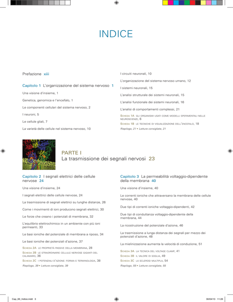 INdice Prefazione xiii I circuiti neuronali, 10 L’organizzazione del sistema nervoso umano, 12 Capitolo 1 L’organizzazione del sistema nervoso 1 Una visione d’insieme, 1 I sistemi neuronali, 15 L’analisi strutturale dei sistemi neuronali, 15 Genetica, genomica e l’encefalo, 1 L’analisi funzionale dei sistemi neuronali, 16 Le componenti cellulari del sistema nervoso, 2 L’analisi di comportamenti complessi, 21 I neuroni, 5 Scheda 1A gli organismi usati come modelli sperimentali nelle neuroscienze, 6 Le cellule gliali, 7 Scheda 1B La varietà delle cellule nel sistema nervoso, 10 le tecniche di visualizzazione dell’encefalo, 18 Riepilogo, 21 • Letture consigliate, 21 Parte I La trasmissione dei segnali nervosi 23 Capitolo 2 I segnali elettrici delle cellule nervose 24 Capitolo 3 La permeabilità voltaggio-dipendente della membrana 40 Una visione d’insieme, 24 Una visione d’insieme, 40 I segnali elettrici delle cellule nervose, 24 Le correnti ioniche che attraversano la membrana delle cellule nervose, 40 La trasmissione di segnali elettrici su lunghe distanze, 26 Come i movimenti di ioni producono segnali elettrici, 30 Due tipi di correnti ioniche voltaggio-dipendenti, 42 Le forze che creano i potenziali di membrana, 32 Due tipi di conduttanza voltaggio-dipendente della membrana, 44 L’equilibrio elettrochimico in un ambiente con più ioni permeanti, 33 La ricostruzione del potenziale d’azione, 46 Le basi ioniche del potenziale di membrana a riposo, 34 La trasmissione a lunga distanza dei segnali per mezzo dei potenziali d’azione, 48 Le basi ioniche dei potenziali d’azione, 37 Scheda 2A Scheda 2B calamaro, Scheda 2C le proprietà passive della membrana, le straordinarie cellule nervose giganti del 36 i potenziali d’azione: forma e terminologia, Riepilogo, 39 • Letture consigliate, 39 Cap_00_Indice.indd 3 La mielinizzazione aumenta la velocità di conduzione, 51 28 38 Scheda 3A la tecnica del voltage clamp, Scheda 3B il valore di soglia, Scheda 3C la sclerosi multipla, 41 49 54 Riepilogo, 55 • Letture consigliate, 55 30/04/13 11:26 IV Indice © 978-88-08-1-7928-9 Capitolo 4 Canali ionici e trasportatori 56 Capitolo 6 I neurotrasmettitori e i loro recettori 107 Una visione d’insieme, 56 Una visione d’insieme, 107 I canali ionici coinvolti nei potenziali d’azione, 56 Le categorie dei neurotrasmettitori, 107 La diversità dei canali ionici, 60 I canali ionici voltaggio-dipendenti, 63 L’acetilcolina, 107 I canali ionici ligando-dipendenti, 64 Il glutammato, 115 I canali attivati dallo stiramento e dal calore, 65 GABA e glicina, 119 La struttura molecolare dei canali ionici, 65 Le ammine biogene, 123 I trasportatori attivi creano gradienti ionici e li mantengono costanti, 67 L’ATP e le altre purine, 129 Le proprietà funzionali della pompa Na1/K1, 69 I neurotrasmettitori peptidici, 130 I neurotrasmettitori non convenzionali, 133 La struttura molecolare delle pompe ATPasiche, 71 Scheda 6A Le neurotossine che agiscono sui recettori Scheda 4A la tecnica del patch clamp, Scheda 4B le tossine che avvelenano i canali ionici, Scheda 4C l’espressione dei canali ionici negli ovociti di Scheda 4D le malattie causate da canali ionici difettosi, xenopus, 58 postsinaptici, 61 110 Scheda 6B la miastenia grave, una malattia autoimmune delle Scheda 6C l’eccitotossicità nel danno cerebrale acuto, Scheda 6D le azioni eccitatorie del gaba nell’encefalo durante lo sinapsi muscolari, 62 70 sviluppo, Riepilogo, 74 • Letture consigliate, 75 114 116 122 Scheda 6E i neurotrasmettitori del gruppo delle ammine biogene e i disturbi psichiatrici, 124 Capitolo 5 La trasmissione sinaptica 76 Scheda 6F la dipendenza, Una visione d’insieme, 76 Scheda 6G la marijuana e il cervello, Le sinapsi elettriche, 76 Riepilogo, 137 • Letture consigliate, 137 La trasmissione del segnale nelle sinapsi chimiche, 78 Le proprietà dei neurotrasmettitori, 79 Capitolo 7 La trasduzione intracellulare del segnale 139 Il rilascio quantico dei neurotrasmettitori, 83 Una visione d’insieme, 139 Il rilascio dei neurotrasmettitori dalle vescicole sinaptiche, 84 Le strategie di segnalazione chimica, 139 Il riciclaggio locale delle vescicole sinaptiche, 85 L’attivazione delle vie di segnalazione, 141 Il ruolo del calcio nella liberazione del trasmettitore, 87 I tipi di recettori, 141 I meccanismi molecolari del ciclo delle vescicole sinaptiche, 89 Le proteine G e i loro bersagli molecolari, 143 I recettori dei neurotrasmettitori, 94 I secondi messaggeri, 145 I cambiamenti della permeabilità della membrana postsinaptica durante la trasmissione sinaptica, 96 La segnalazione a livello del nucleo, 151 La sommazione dei potenziali sinaptici, 102 i criteri per definire un neurotrasmettitore, Scheda 5B le malattie che influenzano le terminazioni presinaptiche, 92 Scheda 5C la «sinapsi tripartita», 102 Riepilogo, 104 • Letture consigliate, 105 Cap_00_Indice.indd 4 134 I bersagli dei secondi messaggeri: le proteina chinasi e fosfatasi, 147 I potenziali postsinaptici eccitatori e inibitori, 99 Scheda 5A 126 Esempi di trasduzione del segnale nei neuroni, 155 81 Scheda 7A la visualizzazione dinamica della segnalazione intracellulare, 148 Scheda 7B le spine dendritiche, 152 Riepilogo, 158 • Letture consigliate, 158 30/04/13 11:26 Indice V © 978-88-08-1-7928-9 Capitolo 8 La plasticità sinaptica 159 La depressione sinaptica a lungo termine, 176 Una visione d’insieme, 159 La plasticità sinaptica dipendente dalla distribuzione temporale degli impulsi, 177 La plasticità sinaptica a breve termine, 159 La plasticità sinaptica a lungo termine è alla base delle modificazioni nel comportamento dell’Aplysia, 162 la genetica dell’apprendimento e della memoria nel moscerino della frutta, 166 Scheda 8A Scheda 8B le sinapsi silenti, Il potenziamento a lungo termine nelle sinapsi ippocampali, 167 Scheda 8C l’epilessia: effetto dell’attività patologica sui circuiti I meccanismi molecolari alla base del