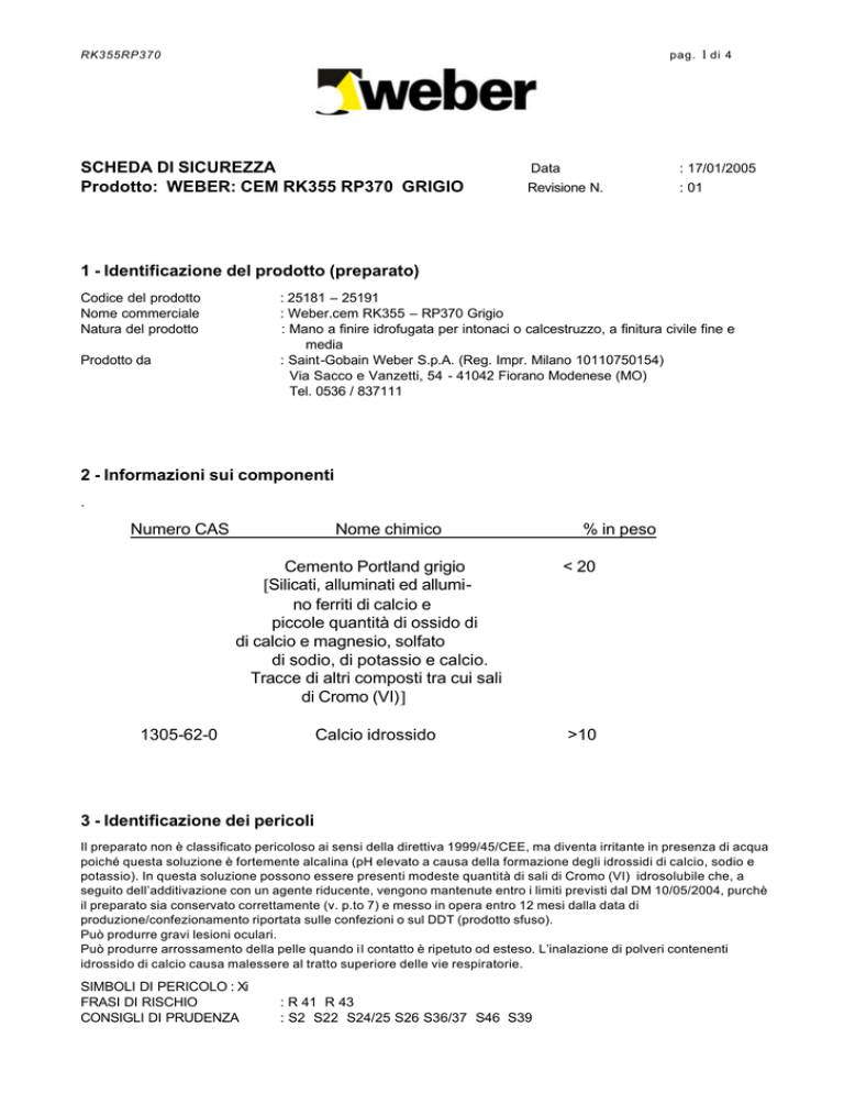 pag. 1 di 4 RK355RP370 SCHEDA DI SICUREZZA Prodotto: WEBER: CEM RK355 RP370 GRIGIO Data : 17/01/2005 Revisione N. : 01 1 - Identificazione del prodotto (preparato) Codice del prodotto Nome commerciale Natura del prodotto : 25181 – 25191 : Weber.cem RK355 – RP370 Grigio : Mano a finire idrofugata per intonaci o calcestruzzo, a finitura civile fine e media : Saint-Gobain Weber S.p.A. (Reg. Impr. Milano 10110750154) Via Sacco e Vanzetti, 54 - 41042 Fiorano Modenese (MO) Tel. 0536 / 837111 Prodotto da 2 - Informazioni sui componenti . Numero CAS Nome chimico Cemento Portland grigio [Silicati, alluminati ed allumino ferriti di calcio e piccole quantità di ossido di di calcio e magnesio, solfato di sodio, di potassio e calcio. Tracce di altri composti tra cui sali di Cromo (VI)] 1305-62-0 Calcio idrossido % in peso < 20 >10 3 - Identificazione dei pericoli Il preparato non è classificato pericoloso ai sensi della direttiva 1999/45/CEE, ma diventa irritante in presenza di acqua poiché questa soluzione è fortemente alcalina (pH elevato a causa della formazione degli idrossidi di calcio, sodio e potassio). In questa soluzione possono essere presenti modeste quantità di sali di Cromo (VI) idrosolubile che, a seguito dell’additivazione con un agente riducente, vengono mantenute entro i limiti previsti dal DM 10/05/2004, purchè il preparato sia conservato correttamente (v. p.to 7) e messo in opera entro 12 mesi dalla data di produzione/confezionamento riportata sulle confezioni o sul DDT (prodotto sfuso). Può produrre gravi lesioni oculari. Può produrre arrossamento della pelle quando i l contatto è ripetuto od esteso. L’inalazione di polveri contenenti idrossido di calcio causa malessere al tratto superiore delle vie respiratorie. SIMBOLI DI PERICOLO : Xi FRASI DI RISCHIO CONSIGLI DI PRUDENZA : R 41 R 43 : S2 S22 S24/25 S26 S36/37 S46 S39 pag. 2 di 4 RK355RP370 SCHEDA DI SICUREZZA Prodotto: WEBER: CEM RK355 RP370 GRIGIO Data : 17/01/2005 Revisione N. : 01 4 - Misure di pronto soccorso CONTATTO CON GLI OCCHI: Irrigare immediatamente ed abbondantemente con acqua. Consultare al più presto il medico CONTATTO CON LA PELLE: Lavare con abbondante acqua e sapone. In caso di arrossamenti cutanei, consultare al più presto un medico oculista INGESTIONE: Se il prodotto viene ingerito sciacquare la bocca con acqua, non provocare il vomito, non somministrare nulla. Consultare il medico. INALAZIONE In caso di esposizione ad elevata concentrazione di polvere, portarsi in ambiente non inquinato e consultare un medico. 5 - Misure antincendio Il prodotto non è infiammabile pertanto non è prevista nessuna disposizione per la protezione antincendio. 6 - Misure in caso di fuoriuscita accidentale Raccogliere il materiale con un aspiratore. Indossare adeguati sistemi protettivi personali 7 - Manipolazione e stoccaggio Evitare la diffusione delle polveri, evitare il contatto con gli occhi e con la pelle. Conservare il materiale in contenitori chiusi in luogo asciutto , a temp. non superiore a 35°C e lontano da acidi. Il rispetto delle indicazioni di stoccaggio è condizione indispensabile per il mantenimento dell’efficacia dell’agente riducente. 8 - Controllo dell'esposizione / Protezione individuale Indossare adeguati sistemi protettivi individuali: guanti preferibilmente impermeabili, occhiali, maschera filtrante ed indumenti da lavoro. 9 - Proprietà chimiche e fisiche (valori tipici) Stato fisico Massa volumica apparente pH (dell'impasto) Punto di infiammabilità Solubilità in acqua : solido/polvere : 1600 Kg/m3 (prodotto indurito) : 12 : Ininfiammabile : parzialmente solubile, disperdibile pag. 3 di 4 RK355RP370 SCHEDA DI SICUREZZA Prodotto: WEBER: CEM RK355 RP370 GRIGIO Data : 17/01/2005 Revisione N. : 01 10 - Stabilità e reattività Il prodotto reagisce indurendo per idratazione se a contatto con acqua/umidita’. Reagisce con gli acidi con sviluppo di calore. 11 - Informazioni tossicologiche Il preparato non è tossico. Per inalazione può provocare irritazione delle vie respiratorie e delle mucose nasali.Per ingestione può provocare ulcerazioni della bocca, dell’esofago e dello stomaco. Sulla pelle umida può provocare irritazioni per contatto prolungato. A contatto con gli occhi può provocare una irritazione delle palpebre e della cornea e una lesione dei globi oculari. Esiste un effe tto di sensibilizzazione della pelle e delle mucose. Dopo una manipolazione prolungata negli anni delle malte e dei calcestruzzi esiste la possibilità che si verifichi sensibilizzazione cutanea. 12 - Informazioni ecologiche Sono possibili effetti di ecotossicità solo nel caso di dispersioni di elevate quantità in presenza di acqua. Utilizzare il prodotto secondo le buone pratiche lavorative. Non versare i residui negli scarichi, né in acque superficiali. Non disperdere i sacchi vuoti nell'ambiente. 13 - Considerazioni sullo smaltimento Per lo smaltimento di eventuali rifiuti attenersi al D.Lgs. 7 febbraio 1997, n.22 e normativa collegata Il prodotto indurito può essere conferito in discarica per materiali da costruzione 14 - Informazioni sul trasporto RID/ADR: IMDG: IATA: Classe: nessuna Classe: nessuna Classe: nessuna pag. 4 di 4 RK355RP370 SCHEDA DI SICUREZZA Prodotto: WEBER: CEM RK355 RP370 GRIGIO Data : 17/01/2005 Revisione N. : 01 15 - Informazioni sulla regolamentazione D.Lgs 3 febbraio 1997, n. 52 e normativa collegata sulla classificazione, imballaggio ed etichettatura delle sostanze pericolose. CONTIENE : Cemento Portland – Calcio idrossido SIMBOLI DI PERICOLO : Xi irritante FRASI DI RISCHIO : R41 può provocare gravi lesioni oculari R 43 può provocare sensibilizzazione per contatto con la pelle CONSIGLI DI PRUDENZA : S2 conservare fuori dalla portata dei bambini S22 non respirare le polveri S24/25 Evitare il contatto con gli occhi e con la pelle S26 in caso di contatto con gli occhi, lavare immediatamente ed abbondantemente con acqua e consultare il medico S36/37 usare indumenti prot