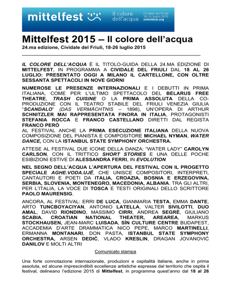 Mittelfest 2015 – Il colore dell’acqua 24.ma edizione, Cividale del Friuli, 18-26 luglio 2015 IL COLORE DELL’ACQUA È IL TITOLO-GUIDA DELLA 24.MA EDIZIONE DI MITTELFEST, IN PROGRAMMA A CIVIDALE DEL FRIULI DAL 18 AL 26 LUGLIO: PRESENTATO OGGI A MILANO IL CARTELLONE, CON OLTRE SESSANTA SPETTACOLI IN NOVE GIORNI NUMEROSE LE PRESENZE INTERNAZIONALI E I DEBUTTI IN PRIMA ITALIANA, COME PER L’ULTIMO SPETTACOLO DEL BELARUS FREE THEATRE, TRASH CUISINE O LA PRIMA ASSOLUTA DELLA COPRODUZIONE CON IL TEATRO STABILE DEL FRIULI VENEZIA GIULIA “SCANDALO” (DAS VERMÄCHTNIS – 1898), UN’OPERA DI ARTHUR SCHNITZLER MAI RAPPRESENTATA FINORA IN ITALIA, PROTAGONISTI STEFANIA ROCCA E FRANCO CASTELLANO DIRETTI DAL REGISTA FRANCO PERÒ AL FESTIVAL ANCHE LA PRIMA ESECUZIONE ITALIANA DELLA NUOVA COMPOSIZIONE DEL PIANISTA E COMPOSITORE MICHAEL NYMAN, WATER DANCE, CON LA ISTANBUL STATE SYMPHONY ORCHESTRA. ATTESE AL FESTIVAL DUE ICONE DELLA DANZA: “WATER LADY” CAROLYN CARLSON, CON IL TRITTICO SHORT STORIES E UNA DELLE POCHE ESIBIZIONI ESTIVE DI ALESSANDRA FERRI, IN EVOLUTION NEL SEGNO DELL’ACQUA L’APERTURA DEL FESTIVAL CON IL PROGETTO SPECIALE AGHE.VODA.UJË, CHE UNISCE COMPOSITORI, INTERPRETI, CANTAUTORI E POETI DA ITALIA, CROAZIA, BOSNIA E ERZEGOVINA, SERBIA, SLOVENIA, MONTENEGRO, MACEDONIA, ALBANIA. TRA GLI ALTRI, PER L’ITALIA, LA VOCE DI TOSCA E TESTI ORIGINALI DELLO SCRITTORE PAOLO MAURENSIG. ANCORA, AL FESTIVAL: ERRI DE LUCA, GIANMARIA TESTA, EMMA DANTE, ARTO TUNCBOYACIYAN, ANTONIO LATELLA, VALTER SIVILOTTI, DUO AMAL, DAVID RIONDINO, MASSIMO CIRRI, ANDREA SEGRÈ, GIULIANO SCABIA, CROATIAN NATIONAL THEATER, AREAREA, MARKUS STOCKHAUSEN, JEAN-MARC LUISADA, SÍN CULTURE CENTRE BUDAPEST, ACCADEMIA D’ARTE DRAMMATICA NICO PEPE, MARCO MARTINELLI, ERMANNA MONTANARI, DON PASTA, ISTANBUL STATE SYMPHONY ORCHESTRA, ARSEN DEDIĆ, VLADO KRESLIN, DRAGAN JOVANOVIĆ DANILOV E MOLTI ALTRI Comunicato stampa Una forte connotazione internazionale, produzioni e ospitalità italiane, anche in prima assoluta, ed alcune imprescindibili eccellenze artistiche espresse dal territorio che ospita il festival, delineano l’edizione 2015 di Mittelfest, in programma quest’anno dal 18 al 26 luglio nel consueto scenario di Cividale del Friuli, città Patrimonio dell’Umanità Unesco, che del suo paesaggio e dei dettagli urbani ha fatto un palcoscenico a cielo aperto. A partire dall’edizione 2015 il Direttore Franco Calabretto - sempre affiancato dalla consulenza sul settore Teatro di Rita Maffei, per il CSS-Teatro Stabile d’Innovazione – ha avviato una trilogia che vedrà, fino all’edizione 2017, susseguirsi i temi dell’Acqua, della Terra e dell’Aria: elementi distinti, e beni comuni. Nell'anno dell'Expo, l'acqua e i suoi colori sono centro tematico del festival, elemento materiale in pericolo, bene comune e non illimitato dell’umanità, ma anche figura dell’immaginario e via di comunicazione per eccellenza. La 24.ma edizione - presentata oggi alla stampa nella prestigiosa location di piazza Duomo, “Duomo21” - si apre proprio nel segno dell’acqua, con un evento inaugurale (sabato 18 luglio: dalle 17.00 per le vie della città e alle 18.30 nella Chiesa di San Francesco), Le acque di Cividale, che rovescerà nelle strade della città una cascata di sette cori per un concerto-installazione sonora creato dal compositore austriaco Nussbaumer, che unisce alle voci, in un unico canto liquido, il suono di 149 bottiglie. L'acqua come paradigma della storia dell'uomo, che l'ha attraversata, imbrigliata, solcata, ispira anche l’evento speciale della prima serata di festival, Aghe.Voda.Ujë, da un’idea del compositore Valter Sivilotti (da alcuni anni particolarmente attento alla canzone d’autore, ha composto, tra l’altro, le musiche dello spettacolo Magazzino 18, di e con Simone Cristicchi). L’evento speciale Mittelfest 2015 (sabato 18 luglio, piazza Duomo) unisce compositori, interpreti, cantautori e poeti da Italia, Croazia, Bosnia e Erzegovina, Serbia, Slovenia, Montenegro, Macedonia, Albania. Tra gli artisti coinvolti, l’Italia avrà la voce di Tosca, del friulano Loris Vescovo (Targa Tenco 2014 per la miglior musica dialettale), di Luigi Maieron, Edoardo De Angelis, mentre testi poetici e in prosa saranno firmati dallo scrittore goriziano Paolo Maurensig e dal poeta di lingua slovena Miroslav Košuta. Per ogni Paese alcuni tra i nomi più noti, basti citare Arsen Dedić, fin dagli anni sessanta uno dei cantautori più conosciuti di tutta la Jugoslavia, o il cantautore sloveno Vlado Kreslin, già Premio Tenco nel 2007, fino a Dragan Jovanović Danilov, il poeta serbo contemporaneo più tradotto. Una serata di grande impatto, in cui le parole e la musica si fondono in una rapsodia di sensazioni grazie al Coro del Friuli Venezia Giulia, diretto da Cristiano Dell’Oste, la FVG Mitteleuropa Orchestra e la voce narrante di Monica Mosolo. Ma la giornata inaugurale riserva anche una delle presenze internazionali più attese quest’anno. Sempre sabato 18 luglio, prima nazionale di Trash cuisine, il nuovo spettacolo firmato dal Belarus Free Theatre. Ricercati, arrestati, o in esilio dal loro Paese - dove è al potere l'ultima dittatura d'Europa - gli artisti bielorussi hanno come sola arma il potenziale esplosivo del loro teatro, che qui rivolgono verso una tema che ancora affligge 94 paesi al mondo: la pena di morte. Ulteriore debutto, questa volta in prima assoluta nell’ultima giornata di festival (domenica 26 luglio), la co-produzione Mittelfest con il Teatro Stabile del Friuli Venezia Giulia, Scandalo (Das Vermächtnis – 1898), un’opera di Arthur Schnitzler mai rappresentata finora in Italia, in cui l’autore rivela la spietatezza e la violenza di uno scontro famigliare. Il regista Franco Però dirige in scena gli attori Stefania Rocca e Franco Castellano. Il festival cividalese estende quest’anno i suoi orizzonti geografici, prolungando lo sguardo dall’area culturale della Mitteleur