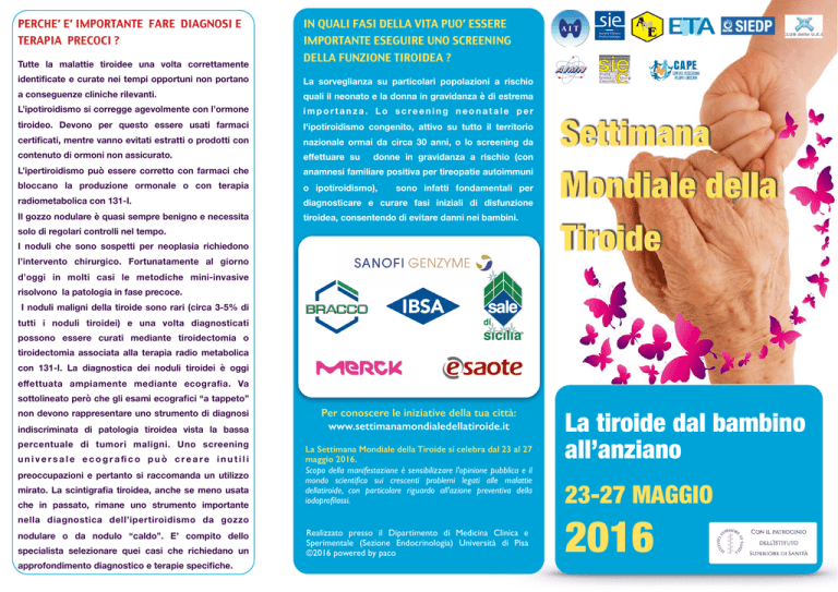 PERCHE’ E’ IMPORTANTE FARE DIAGNOSI E IN QUALI FASI DELLA VITA PUO’ ESSERE TERAPIA PRECOCI ? IMPORTANTE ESEGUIRE UNO SCREENING Tutte la malattie tiroidee una volta correttamente DELLA FUNZIONE TIROIDEA ? identificate e curate nei tempi opportuni non portano La sorveglianza su particolari popolazioni a rischio a conseguenze cliniche rilevanti. quali il neonato e la donna in gravidanza è di estrema L’ipotiroidismo si corregge agevolmente con l’ormone importanza. Lo screening neonatale per tiroideo. Devono per questo essere usati farmaci l'ipotiroidismo congenito, attivo su tutto il territorio certificati, mentre vanno evitati estratti o prodotti con nazionale ormai da circa 30 anni, o lo screening da contenuto di ormoni non assicurato. effettuare su L’ipertiroidismo può essere corretto con farmaci che anamnesi familiare positiva per tireopatie autoimmuni bloccano la produzione ormonale o con terapia o ipotiroidismo), radiometabolica con 131-I. diagnosticare e curare fasi iniziali di disfunzione Il gozzo nodulare è quasi sempre benigno e necessita tiroidea, consentendo di evitare danni nei bambini. donne in gravidanza a rischio (con sono infatti fondamentali per solo di regolari controlli nel tempo. I noduli che sono sospetti per neoplasia richiedono l’intervento chirurgico. Fortunatamente al giorno Settimana Mondiale della Tiroide d’oggi in molti casi le metodiche mini-invasive risolvono la patologia in fase precoce. I noduli maligni della tiroide sono rari (circa 3-5% di tutti i noduli tiroidei) e una volta diagnosticati possono essere curati mediante tiroidectomia o tiroidectomia associata alla terapia radio metabolica con 131-I. La diagnostica dei noduli tiroidei è oggi effettuata ampiamente mediante ecografia. Va sottolineato però che gli esami ecografici “a tappeto” non devono rappresentare uno strumento di diagnosi indiscriminata di patologia tiroidea vista la bassa percentuale di tumori maligni. Uno screening u n i v e r s a l e e c o g r a fi c o p u ò c r e a r e i n u t i l i preoccupazioni e pertanto si raccomanda un utilizzo mirato. La scintigrafia tiroidea, anche se meno usata che in passato, rimane uno strumento importante Per conoscere le iniziative della tua città: www.settimanamondialedellatiroide.it La Settimana Mondiale della Tiroide si celebra dal 23 al 27 maggio 2016. Scopo della manifestazione è sensibilizzare l'opinione pubblica e il mondo scientifico sui crescenti problemi legati alle malattie dellatiroide, con particolare riguardo all'azione preventiva della iodoprofilassi. nella diagnostica dell’ipertiroidismo da gozzo nodulare o da nodulo “caldo”. E’ compito dello specialista selezionare quei casi che richiedano un approfondimento diagnostico e terapie specifiche. Realizzato presso il Dipartimento di Medicina Clinica e Sperimentale (Sezione Endocrinologia) Università di Pisa ©2016 powered by paco La tiroide dal bambino all’anziano 23-27 MAGGIO 2016 PERCHE’ PARLARE DI TIROIDE ? QUALI SONO LE FASI DELLA VITA IMPORTANTI La tiroide svolge un ruolo fondamentale nell’arco di PER LA PREVENZIONE ? I bambini e le donne in PERCHE’ PARLARE DELLA lo sviluppo del sistema nervoso, la funzione gravidanza sono più vulnerabili, TIROIDE NELL’ADULTO E cardiovascolare e il metabolismo. poiché in queste fasi della vita il NELL’ANZIANO? tutta la vita da prima della nascita alla terza età per Le malattie tiroidee sono di frequente riscontro soprattutto nelle donne, ma fabbisogno di iodio è maggiore. fortunatamente la Se l’apporto di iodio con la dieta maggior parte di esse possono essere prevenute e curate nelle fasi iniziali. non è sufficiente a soddisfare il fabbisogno della madre e del feto, si può instaurare una condizione di ipotiroidismo materno o materno-fetale, COME PREVENIRE PROBLEMI ALLA TIROIDE ? le cui conseguenze sono tanto più gravi quanto più La causa più frequente della durante la vita intra-uterina gli ormoni tiroidei patologia tiroidea è la carenza di concorrono allo sviluppo del sistema nervoso centrale iodio. del feto. Un apporto di iodio insufficiente in questa fase Lo iodio è il costituente della vita può compromettere lo sviluppo intellettivo e fondamentale degli ormoni tiroidei e marcato e protratto è il deficit ormonale. In particolare cognitivo del nascituro. viene introdotto con gli alimenti. Per prevenire la Anche durante l’allattamento è necessario che la carenza iodica è necessario che l’alimentazione sia madre fornisca un’adeguata quantità di iodio al lattante quanto più possibile varia e preveda il consumo di in modo da assicurargli una normale funzione tiroidea pesce, latte e formaggi, che sono i cibi a più alto durante questa fase della vita. contenuto di iodio. E’ tuttavia necessaria Le donne in età fertile oltre ad utilizzare con costanza e un’integrazione che si ottiene con l’uso del sale regolarità il sale iodato dovrebbero assumere una arricchito di iodio, comunemente indicato con il quantità supplementare di iodio ricorrendo a specifiche termine di sale iodato, ovunque ampiamente integrazioni. Questa supplementazione risulta ancora disponibile. Nel 2005 è stata emanata una legge che più efficace se iniziata con largo anticipo rispetto al contiene una serie di misure finalizzate a promuovere concepimento nella donna che pianifica una il consumo di sale iodato su tutto il territorio gravidanza. nazionale. Le patologie tiroidee sono piuttosto frequenti negli adulti e negli anziani. I noduli tiroidei sono palpabili nel 5 % dei soggetti, ma noduli di piccole dimensioni, rilevabili con l’esame ecografico, sono presenti nel 50-60% della popolazione generale in particolare nelle aree iodocarenti, con una prevalenza che aumenta con l’età. La frequenza dell’ipotiroidismo, cioè la ridotta produzione di ormoni tiroidei, aumenta con l’età specie nel genere femminile. Un ipotiroidismo lieve si riscontra infatti in quasi 1 donna su 10 oltre i 60 anni. L'ipertiroidi