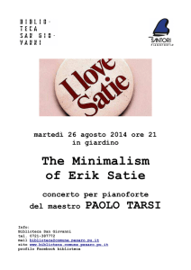SATIE ERIC ALFRED LESLIE Compositore francese (Honfleur, Calvados, 17 V 1866 - Parigi 1º VII 1925) 1126 Studiò pianoforte al collegio di Honnefleur e a soli 13 anni entrò nel conservatorio di Parigi per frequentare (fino al 1887) le classi di pianoforte e di armonia. Dal 1885 datano i suoi primi brani pianistici (Valse ballet e Fantaisie valse). Nel 1887 scrisse le Trois sarabandes e nel 1888 le Trois gymnopedies, brani che sorprendono per la loro totale libertà formale, per l'emancipazione delle dissonanze, per la profetica anticipazione di procedimenti armonici che verranno usati successivamente su larga scala da Debussy e Ravel. Poverissimo, si guadagnava la vita come pianista nei cabaret "Le chat noir" e, "L'auberge du clou", dove incontrò, nel 1891, Debussy col quale strinse un'amicizia duratura. Nello stesso anno entrò nella Confraternita teosofica dei Rosacrociani, fondata da J. Péladan. Sono di quel periodo le Trois gnossiennes che recano un'ulteriore testimonianza del gusto di Satie per i titoli enigmatici e curiosi ed in cui compaiono per la prima volta quelle indicazioni umoristiche e bizzarre improntate ad un paradossale gusto del non-senso mistificatorio che diventeranno un caratteristico corredo delle sue musiche. Nel 1891 compose le musiche di scena per Le fils des etoiles di Peladan. Nello stesso clima mistico (o pseudomistico) nacquero il Prélude à la porte héroique du ciel, le Sonneries de la Rose Croix, il "balletto cristiano in tre atti" Uspud (respinto dal direttore dell'Opéra). Abbandonata la confraternita dei Rosacrociani, redasse e pubblicò nel 1895 "Le Cartulaire” giornale della Chiesa metropolitana d'arte di Gesù Conduttore" di cui si proclamava ironicamente fondatore, elemosiniere, maestro di cappella ed unico seguace. Con fare tra il serio ed il faceto pose per tre volte, senza successo, la propria candidatura all'Accademia. Nel 1898 abbandonò la sua abitazione a Montmartre e si stabilì ad Arcueil-Cachan in un alloggio molto misero. Per guadagnarsi da vivere accompagnava lo chansonnier V. Hyspa e componeva valzer per P. Darty. Lo confortava l'amicizia di Debussy, il quale lo esortava a perfezionare la forma delle sue composizioni. Satie rispose a quest'esortazione con i Trois morceaux en forme de poire, il cui ironico titolo cela una notevole riuscita. Tuttavia, sentendosi tecnicamente non abbastanza preparato (od anche per gusto del 1127 paradosso) Satie, a 39 anni, s'iscrisse alla scuola cantorum per studiare, tra il 1905 ed il 1908, contrappunto e fuga con A. Sericyx e A. Roussel. DISEGNO DI PICASSO PER IL BALLETTO “PARADE” 1128 Primo frutto di questo tardivo allenamento scolastico sono il corale e la fuga negli Apercus désagréables (1908). Diplomotosi con ottima votazione, ritornò alla vita musicale attiva e cominciò a suscitare il crescente interesse dei circoli d'avanguardia. Nel gennaio 1911, nel quadro d'un concerto della Société Musicale Independante, Ravel suonò una Sarabanda, una delle Gymnopédies ed un preludio del Fils des etoiles. Nel programma di sala Satie veniva qualificato come un geniale precursore "per una prescienza del vocabolario modernista ed il carattere quasi profetico di talune trovate armoniche". Qualche mese più tardi Debussy diresse al Cercle Musical due Gymnopédies da lui stesso orchestrate. Questi riconoscimenti e gesti amichevoli non impedirono che Satie mettesse alla berlina il gusto impressionista di Debussy ed anche la poetica di Ravel in brani come Chapitres tournés en tout o Valse du précieux degoute. Poco più tardi Cocteau additò Satie alle nuove generazioni come uno spiritus rector il cui ironico gusto dell'espressione indiretta, della semplicità spoglia e del pudore repressivo dei sentimenti verrà assunto come antidoto ideale al lirismo romantico, al wagnerismo magniloquente, alla retorica impressionista. "Basta con le nuvole, le onde, gli acquari, le ondine e i profumi notturni; ci serve una musica di questo mondo, una musica di tutti i giorni". Questo postulato di Cocteau trova la sua attuazione nel "balletto realista" Parade nato dalla collaborazione, promossa da S. de Diaghilev, tra Satie, Cocteau, Picasso (per le scene e i costumi) e L. Massine (per la coreografia). Concepita come sfondo sonoro intessuto di rumori tipici della vita moderna (rumori di macchine da scrivere, motori, sirene), la musica di Parade contempera, con movimento impassibilmente livellatore, motivi da musichall, circo, jazz, accademici fugati. Nel programma di sala (Parade et l'Esprit Nouveau) redatto per la prima del 20 maggio 1917, Apollinaire parla per la prima volta di "surrealisme". Sulla scena si assiste solo alla presentazione di uno spettacolo che non ha luogo: simbolo della repressione tragica di ogni istanza individuale diventerà caratterizzante per alcune delle essenziali premesse sottintese dal neoclassicismo stravinskiano. 1129 CARICATURA DEL COMPOSITORE DISEGNO PER “LA MARIDÉE 1130 A Parade si richiamerà il gruppo dei Sei. L'ambiente conservatore considerò però il lavoro come una provocazione e reagì in maniera violenta. Per un alterco col critico M.O. Poueigh lo stesso Satie finì in tribunale. Lo scandalo lo rese comunque celebre. La principessa di Polignac gli commissionò un lavoro e da questo stimolo nacque Socrate, su testi tratti dal Convinto, dal Fedro e dal Fedone di Platone. In questo suo capolavoro, Satie, abbandonando ogni mascheratrice ironia, realizzò una musica la cui scarna semplicità è pari alla profonda efficacia emotiva. Non appena finita quest'opera seria e diretta, Satie tornò alle invenzioni stravaganti. Nel marzo 1920 presentò alla Galerie Barbezanges la Musique d'ameublement: tre clarinetti, un trombone ed un pianoforte, collocati nei diversi angoli della sala, ripetevano incessantemente motivi di sapore popolaresco che, secondo il desiderio dell'autore, dovevano venire percepiti come un contributo alla vita, alla stregua "di una conversazione particolare, d