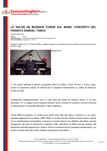 MICHAEL NYMAN, PENSIERI E PAROLE DA PIANOFORTE Fonte: L'Unione Sarda 28 marzo 2014 URL della pagina: http://www.comunecagliarinews.it/rassegnastampa.php?pagina=37365 Data scaricamento: 16 marzo 2017, 02:44 Il personaggio Il geniale musicista inglese ieri a Cagliari S ul palco un pianoforte a coda Steinway&Sons davanti d una platea in impaziente attesa. Michael Nyman, celebre pianista e compositore britannico, incontra il pubblico prima della serata che lo vede protagonista all'Auditorium del Conservatorio di Cagliari. Un concerto da tutto esaurito, nato dalla collaborazione tra Creuza de Mà, festival carlofortino dedicato alla musica per il cinema, e Sardegna Concerti. Tema dell'incontro: il rapporto tra musica e cinema. Si apre il sipario su qualcosa di segreto: all'arrivo di Nyman la raccomandazione di evitare riprese e foto durante le prove. Il caratteristico occhiale dalla montatura nera, un tocco eccentrico in uno stile complessivamente sobrio e le melodie delle sue composizioni più conosciute che accompagnano i video. In particolare le musiche del film indipendente inglese del 1999 Wonderland si intrecciano con un ritmo incalzante ad alcune immagini riguardanti il gioco della Morra. Dopo una breve prova al pianoforte Nyman raggiunge il centro del palco per dare inizio all'incontro. La conversazione tra Riccardo Giagni, compositore e musicologo, verte sulla relazione tra musica e immagini sullo schermo. Michael Nyman è considerato uno dei più grandi musicisti contemporanei. Dopo gli studi musicali alla Royal Academy of Music ed al King's College di Londra inizia la carriera come critico musicale per poi passare alla composizione per cortometraggi. Il suo rapporto con il cinema inizia alla fine degli anni '70. È ricordato come autore di memorabili colonne sonore, dei film di Peter Greenaway, di Lezioni di piano di Jane Campion, Wonderland di Michael Winterbottom e Fine di una storia di Neil Jordan. Ma in questa occasione sarà interprete di un recital per pianoforte solo in cui le sue musiche da film si adatteranno alle immagini da lui stesso rubate durante viaggi ed esperienze in varie parti del mondo. Comune Cagliari News - Testata giornalistica quotidiana del Comune di Cagliari Testata giornalistica registrata al Tribunale di Cagliari in data 05.12.2005 al n. 31/05 - Direttore responsabile: Gianfranco Luigi Quartu. P. IVA 00147990923 - www.comunecagliarinews.it Pagina 1 di 2 Il suo rapporto con la musica da film è infatti cambiato. Dopo esser stato a lungo identificato come compositore delle colonne sonore di alcuni celebri capolavori del cinema, decide di dedicarsi alla musica sinfonica. In questa occasione sceglie di tornare al rapporto intimo con il pianoforte. Suonare solo gli consente di sentirsi libero, di suonare più lentamente o velocemente, di seguire i sentimenti o adattarsi allo spazio in cui si trova. Non altrettanto accade con la sua band: una macchina di cui tenere il controllo, composta da «musicisti talvolta più bravi di me», sorride. «Suonare con la band è come essere leader di una orchestra swing o dirigere un'orchestra da camera. Ma il tempo è scandito dal pianoforte piuttosto che da bacchetta o gesto». Negli ultimi tempi la composizione di sinfonie gli ha consentito, a differenza del lavoro per il cinema, di «dire costantemente sì a se stesso». La sua musica è stata spesso collegata a compositori come Philip Glass e Steve Reich, pionieri del minimalismo, «ma no, la mia musica dalla vita di tutti i giorni». Eclettico e versatile genio della musica. Luisa Sclocchis Comune Cagliari News - Testata giornalistica quotidiana del Comune di Cagliari Testata giornalistica registrata al Tribunale di Cagliari in data 05.12.2005 al n. 31/05 - Direttore responsabile: Gianfranco Luigi Quartu. P. IVA 00147990923 - www.comunecagliarinews.it Pagina 2 di 2