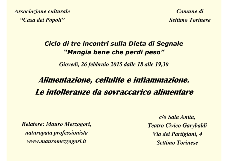 Associazione culturale “Casa dei Popoli” Comune di Settimo Torinese Ciclo di tre incontri sulla Dieta di Segnale “Mangia bene che perdi peso” Giovedì, 26 febbraio 2015 dalle 18 alle 19,30 Alimentazione, cellulite e infiammazione. Le intolleranze da sovraccarico alimentare Relatore: Mauro Mezzogori, naturopata professionista www.mauromezzogori.it c/o Sala Anita, Teatro Civico Garybaldi Via dei Partigiani, 4 Settimo Torinese La dieta di segnale o DietaGIFT è un sistema di regole alimentari e comportamentali, nato dalla ricerca e dalla sperimentazione dei fratelli Attilio e Luca Speciani, che indica quali sono le scelte alimentari utili per attivare il metabolismo e perdere peso senza contare le calorie. 1. In breve, è un ormone peptidico chiamato leptina secreto dagli adipociti che segnala ai centri ipotalamici della fame e della sazietà l’entità delle riserve energetiche (adipe addominale). 2. Di conseguenza l’ipotalamo modula la spesa energetica e quindi l’aumento o la riduzione della massa grassa. 1. Le cellule adipose, oltre ad essere il deposito delle riserve energetiche dell’organismo sono anche un potente organo endocrino in grado di condizionare la velocità metabolica dell’organismo. 2. Esse quando sono “piene”, ossia quando mangiamo una caloria in più del nostro fabbisogno giornaliero, aumentano la secrezione di un ormone, la leptina che arrivando direttamente al cervello (nuclei ipotalamici) lo informa sul buon stato nutrizionale dell’organismo. 3. Se il segnale è “di abbondanza” (leptina alta) l’organismo attiva il consumo energetico viceversa se il segnale è “di carestia” (leptina bassa) lo inibisce. inibisce Neuropeptide Y (NPY) SENSO DI SAZIETA ADIPOCITI IL1, IL6 TNF-alfa NFkB stimola la produzione di POMC (beta-LPH, alfa-MSH, CRH) TRF, GnRF, GHRF LEPTINA PROOPIOMELANOCORTINA beta-LPH betaendorfine analgesia alfa-MSH azione anti infiammatoria ACTH NORADR. adrenalina tono TRF TSH f T3, f T4 aumento metabolismo GnRF FSH e LH testoster. estrogeni progestr. fertilità GHRF GH IGF-1 muscoli ossa cartilag. 1. La leptina, quindi, oltre ad essere “l’ormone della sazietà” è anche il più potente segnale endocrino d’attivazione del metabolismo. 2. La produzione di leptina è direttamente proporzionale al volume della massa grassa, ossia, più grasso = più leptina. 3. Tuttavia, una costante sovrapproduzione di leptina determina, quale meccanismo di difesa contro l’eccesso di stimolo, una riduzione degli specifici recettori ipotalamici del “centro della sazietà”. 4. Questo fenomeno, detto di “resistenza” alla leptina, determina un costante senso di fame ed induce nell’individuo un comportamento iperfagico. ormone recettore 1. Il legame tra una molecola/segnale, detta ligando, ed il suo recettore a livello cellulare è alla base dei processi biochimici che regolano il funzionamento dell’organismo. 2. Normalmente produciamo una “giusta” quantità di segnali molecolari, ad esempio gli ormoni, sufficiente per farci star bene. ormone recettore x x x 1. La sovrapproduzione di un ormone, ad esempio l’insulina o la leptina, determina a livello cellulare la riduzione degli specifici recettori (down-regulation). 2. Questo meccanismo di difesa è detto “resistenza” ed in questo modo la cellula evita una sovra-stimolazione e cerca di mantenere il suo equilibrio interno o omeostasi . 1. In conclusione, per perdere massa grassa è importante superare la resistenza alla leptina ristabilendo il senso di sazietà. 2. Di conseguenza, se è un corretto segnale leptinico che dice all’ipotalamo se l’organismo può consumare energia o meno il cardine di una dieta finalizzata al dimagrimento (= perdita di massa grassa) NON può più essere il conteggio delle calorie. 3. Con una dieta ipocalorica otterremo solo riduzioni del peso contingenti e limitate nel tempo. 3. Ciò che conta è porre l’ipotalamo per il maggior tempo possibile in modalità di consumo (= senso di sazietà) attivando in tal modo il metabolismo è superando con gradualità sia la resistenza all’insulina che alla leptina. 4. Tale superamento, beninteso, avviene anche durante un regime di restrizione calorica ma sarà solo temporaneo perché l’ipotalamo risponderà alla “carestia” (senso di fame = leptina bassa) riducendo i consumi e riprogrammando l’organismo verso l’accumulo ed innescando il famoso circolo vizioso dell’effetto yo-yo. Fame Dieta IPOcalorica Riduzione della spesa energetica Riduz io LEPT ne INA Ipotalamo Tessuto adiposo to n me INA u A PT LE Alimentazione NORMO-calorica Sazietà Aumento della spesa energetica L’obesità indotta dalla dieta provoca una grave ma reversibile resistenza alla leptina nei neuroni del nucleo arcuato che codificano per l’alfa-MSH (= senso di sazietà) 1. Questo studio evidenzia che dal punto di vista alimentare, nelle cavie di laboratorio, una dieta normo-calorica che aumenta l’apporto proteico e riduce quello dei grassi, aiuta a ristabilire il corretto segnale leptinico. Nel giro di poche settimane questo porta ad una normalizzazione dell’introito calorico e a una graduale riduzione della massa grassa grazie al recupero della sensibilità leptinica sia periferica (che induce l’organismo verso il consumo anziché verso l’accumulo) sia centrale ripristinando i corretti segnali di fame e sazietà. 2. Altri studi condotti su umani sottolineano che un valido aiuto per il recupero della sensibilità leptinica dal punto di vista dell’integrazione può venire dall’assunzione di acidi grassi polinsaturi a lunga catena come gli omega-3, di cui sono ricchi i semi oleosi ed il salmone, soprattutto nel caso in cui questi siano carenti nella dieta. inibisce Neuropeptide Y (NPY) SENSO DI SAZIETA ADIPOCITI IL1, IL6 TNF-alfa NFkB stimola la produzione di POMC (beta-LPH, alfa-MSH, CRH) TRF, GnRF, GHRF LEPTINA PROOPIOMELANOCORTINA beta-LPH betaendorfine analgesia alfa-MSH azione anti infiammatoria ACTH NORA
