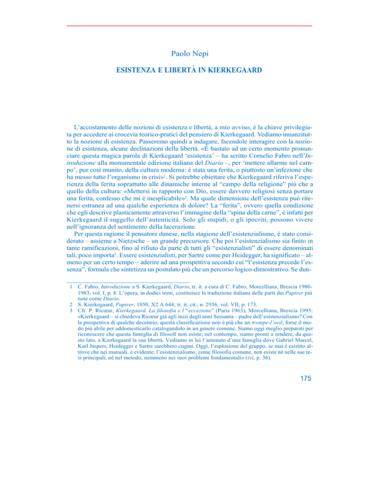 Paolo Nepi ESISTENZA E LIBERTÀ IN KIERKEGAARD L’accostamento delle nozioni di esistenza e libertà, a mio avviso, è la chiave privilegiata per accedere ai crocevia teorico-pratici del pensiero di Kierkegaard. Vediamo innanzitutto la nozione di esistenza. Passeremo quindi a indagare, facendole interagire con la nozione di esistenza, alcune declinazioni della libertà. «È bastato ad un certo momento pronunciare questa magica parola di Kierkegaard ‘esistenza’ – ha scritto Cornelio Fabro nell’Introduzione alla monumentale edizione italiana del Diario –, per ‘mettere allarme nel campo’, pur così munito, della cultura moderna: è stata una ferita, o piuttosto un’infezione che ha messo tutto l’organismo in crisi»1. Si potrebbe obiettare che Kierkegaard riferiva l’esperienza della ferita soprattutto alle dinamiche interne al “campo della religione” più che a quello della cultura: «Mettersi in rapporto con Dio, essere davvero religiosi senza portare una ferita, confesso che mi è inesplicabile»2. Ma quale dimensione dell’esistenza può ritenersi estranea ad una qualche esperienza di dolore? La “ferita”, ovvero quella condizione che egli descrive plasticamente attraverso l’immagine della “spina della carne”, è infatti per Kierkegaard il suggello dell’autenticità. Solo gli stupidi, o gli ipocriti, possono vivere nell’ignoranza del sentimento della lacerazione. Per questa ragione il pensatore danese, nella stagione dell’esistenzialismo, è stato considerato – assieme a Nietzsche – un grande precursore. Che poi l’esistenzialismo sia finito in tante ramificazioni, fino al rifiuto da parte di tutti gli “esistenzialisti” di essere denominati tali, poco importa3. Essere esistenzialisti, per Sartre come per Heidegger, ha significato – almeno per un certo tempo – aderire ad una prospettiva secondo cui “l’esistenza precede l’essenza”, formula che sintetizza un postulato più che un percorso logico-dimostrativo. Se dun1 C. Fabro, Introduzione a S. Kierkegaard, Diario, tr. it. a cura di C. Fabro, Morcelliana, Brescia 19801983, vol. I, p. 8. L’opera, in dodici tomi, costituisce la traduzione italiana delle parti dei Papirer più note come Diario. 2 S. Kierkegaard, Papirer, 1850, X2 A 644; tr. it. cit., n. 2936, vol. VII, p. 173. 3 Cfr. P. Ricœur, Kierkegaard. La filosofia e l’“eccezione” (Paris 1963), Morcelliana, Brescia 1995: «Kierkegaard – si chiedeva Ricœur già agli inizi degli anni Sessanta – padre dell’esistenzialismo? Con la prospettiva di qualche decennio, questa classificazione non è più che un trompe-l’oeil, forse il modo più abile per addomesticarlo catalogandolo in un genere comune. Siamo oggi meglio preparati per riconoscere che questa famiglia di filosofi non esiste; nel contempo, siamo pronti a rendere, da questo lato, a Kierkegaard la sua libertà. Vediamo in lui l’antenato d’una famiglia dove Gabriel Marcel, Karl Jaspers, Heidegger e Sartre sarebbero cugini. Oggi, l’esplosione del gruppo, se mai è esistito altrove che nei manuali, è evidente: l’esistenzialismo, come filosofia comune, non esiste né nelle sue tesi principali, né nel metodo, nemmeno nei suoi problemi fondamentali» (ivi, p. 36). 175 Il tema di B@bel que, almeno per qualche affinità di fondo, si può legittimamente parlare di una filosofia dell’esistenza, si tratta di vedere in che cosa consista questa “attitudine” preriflessiva di carattere postulatorio, rispetto alla quale Kierkegaard è da molti considerato un precursore. Egli avrebbe «compiuto una specie di nuova ‘rivoluzione copernicana’ mettendo la concreta esperienza esistenziale del ‘Singolo’ al posto che era stato occupato, si può dire da sempre, dall’astrattezza concettuale della speculazione filosofica»4. Se l’esistenza precede – nel senso che produce – l’essenza, è allora ovvio che la categoria della libertà è quella che definisce lo statuto ontologico dell’esistenza5, perlomeno dell’esistenza in quanto espressione della condizione dell’uomo relativa al suo essere nel mondo. L’esistenza che precede (e produce) l’essenza è infatti l’esistere soggettivo, che nell’esistenzialismo di Sartre si configura nella forma dell’umanesimo positivo di impronta nichilistica6, mentre in Kierkegaard il primato dell’esistenza assume su di sé la responsabilità della scelta etica e del salto della fede. La soggettività è infatti per Kierkegaard, che per questo non può in nessun modo essere ricondotto a nessuna delle varie forme del soggettivismo moderno, sempre connessa alla questione della oggettività della verità. Se dunque Kierkegaard può avere ispirato, per certi aspetti del suo pensiero, la formula “l’esistenza precede l’essenza”, l’intenzionalità più profonda del suo pensiero non implica tuttavia nessun presupposto di natura soggettivistico-nichilistica. Lo statuto ontologico dell’esistenza è dunque segnato, in Kierkegaard, dalla categoria etica della responsabilità, indizio di una scelta non incondizionata, ma di una libera scelta posta di fronte all’universalità della norma etica. L’etica non può avere l’ultima parola, stante la sua incapacità, in quanto fondata sulla categoria dell’Universale, di comprendere il Singolo nella sua autenticità, ma è pur sempre in relazione alla norma che si costituisce l’identità della scelta etica (la scelta della scelta) rispetto all’estetica (la scelta dell’immediatezza) e alla fede (la scelta del paradosso). «La riflessione etica – scrive nel Diario – è il punto decisivo nella vita. Essa fornisce l’autorizzazione e la misura della esistenza umana. Per 4 S. Quinzio, Kierkegaard, il cristiano moderno, in Opere di Søren Kierkegaard, Piemme, Casale Monferrato 1995, vol. I, p. XI. 5 Riguardo all’espressione “l’esistenza precede l’essenza”, ecco due riflessioni molto diverse, una in chiave di immanentismo parmenideo, l’altra in 