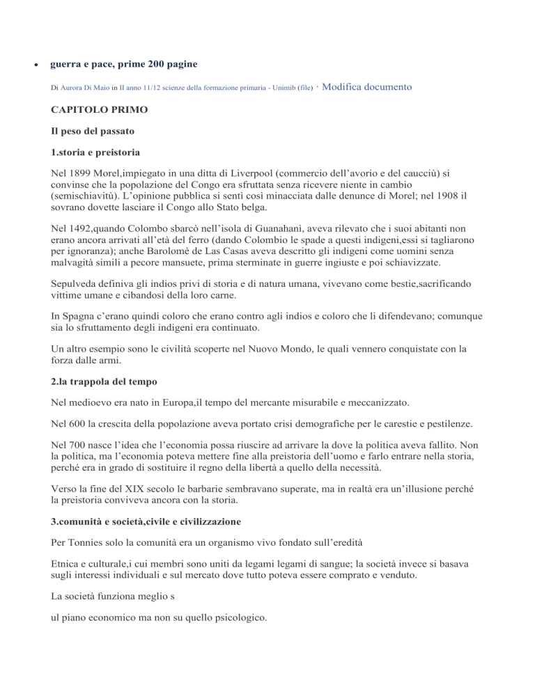 guerra e pace, prime 200 pagine Di Aurora Di Maio in II anno 11/12 scienze della formazione primaria - Unimib (file) · Modifica documento CAPITOLO PRIMO Il peso del passato 1.storia e preistoria Nel 1899 Morel,impiegato in una ditta di Liverpool (commercio dell’avorio e del caucciù) si convinse che la popolazione del Congo era sfruttata senza ricevere niente in cambio (semischiavitù). L’opinione pubblica si sentì così minacciata dalle denunce di Morel; nel 1908 il sovrano dovette lasciare il Congo allo Stato belga. Nel 1492,quando Colombo sbarcò nell’isola di Guanahanì, aveva rilevato che i suoi abitanti non erano ancora arrivati all’età del ferro (dando Colombio le spade a questi indigeni,essi si tagliarono per ignoranza); anche Barolomè de Las Casas aveva descritto gli indigeni come uomini senza malvagità simili a pecore mansuete, prima sterminate in guerre ingiuste e poi schiavizzate. Sepulveda definiva gli indios privi di storia e di natura umana, vivevano come bestie,sacrificando vittime umane e cibandosi della loro carne. In Spagna c’erano quindi coloro che erano contro agli indios e coloro che li difendevano; comunque sia lo sfruttamento degli indigeni era continuato. Un altro esempio sono le civilità scoperte nel Nuovo Mondo, le quali vennero conquistate con la forza dalle armi. 2.la trappola del tempo Nel medioevo era nato in Europa,il tempo del mercante misurabile e meccanizzato. Nel 600 la crescita della popolazione aveva portato crisi demografiche per le carestie e pestilenze. Nel 700 nasce l’idea che l’economia possa riuscire ad arrivare la dove la politica aveva fallito. Non la politica, ma l’economia poteva mettere fine alla preistoria dell’uomo e farlo entrare nella storia, perché era in grado di sostituire il regno della libertà a quello della necessità. Verso la fine del XIX secolo le barbarie sembravano superate, ma in realtà era un’illusione perché la preistoria conviveva ancora con la storia. 3.comunità e società,civile e civilizzazione Per Tonnies solo la comunità era un organismo vivo fondato sull’eredità Etnica e culturale,i cui membri sono uniti da legami legami di sangue; la società invece si basava sugli interessi individuali e sul mercato dove tutto poteva essere comprato e venduto. La società funziona meglio s ul piano economico ma non su quello psicologico. Un grande comunità era l’umma (credenti dell’Islam): era il modello più puro,incontaminato,di una religione-comunità, ma come in tutte le comunità non era immune da tensioni e conflitti interni (sunniti e sciiti). Tra la fine del 700 e gli inizi dell’800 nasce in Europa la nazione-comunità (forte idea di patria e di nazione). Gli illuministi avevano inteso la civilisation come “incivilimento”, nel 1819 invece era un termine più legato al “plurale” che prendeva atto dell’esistenza di molte civilità. Nell’800 il legame civilizzazione-civiltà prese forma nel contraso tra Francia e Germania che sarebbe andato avanti fino alla seconda guerra mondiale. La civilizzazione è un processo che ha l’obiettivo di costruire la società futura, non preservare le civiltà esistenti; queste si modificano per non perdere i loro caratteri originari. La civilità-comunità è tutto ciò che un gruppo di uomini ha conservato e trasmesso di generazione in generazione come bene prezioso. Marx fece un tentativo di superare la comunità-società attraverso l’economia; le diversità,per Marx, si annullavano nel mercato perché le merci sono uguali anche se prodotte in comunità o in società primitive. Nelle comunità vigeva l’economia morale fondata sul diritto alla sussistenza contrapposto al mercato e agli interessi individuali. L’economia morale era considerata un diritto indispensabile per la sopravvivenza dei contadini dell’Asia,e questa era per loro un’idea-forza alla base di molte rivolte contro il potere locale e il colonialismo. Durante l’800 il problema della sovrappopolazione era stato risolto in Europa grazie all’emigrazione e all’incremento della produttività agricola. In Asia e Africa non si trovò soluzione; morte per fame causò molte vittime. Il presunto paradiso del villaggio contadino era in realtà un infermo: annate cattive,inondazioni,le imposte che tormentavano i contadini,la miseria,le malattie… CAPITOLO 2 L’occidente 1.gli Stati Uniti: civilization,libertà e democrazia. Nel 1862 Emerson si pose il problema della “civilization” intesa sia come civilizzazione sia come civiltà. L’inglese Pain,durante la rivoluzione francese,aveva sottolineato l’importanza della civilizzazione intesa come frutto del progresso dell’intera umanità e in stretto legame con la libertà. La libertà non è la stessa cosa della democrazia ma ne è la necessaria premessa. Secondo Turner la democrazia era il frutto della lotte affrontate dall’individuo. Ma negli Stati Uniti restava aperta la questione delle minoranze,che tendevano a rinchiudersi in comunità. La schiavitù era stata una sorta di peccato originale che aveva oscurato le origini della democrazia in quel paese. 2.società e comunità negli stati uniti Nell’800 gli Stati Uniti erano considerati un modello di Stato-società, ma al suo interno resistevano sia le comunità razziali che etniche anche se avevano trovato un denominatore comune nell’accettazione della democrazia. Gli immigrati dell’800 si fondevano con i discendenti dei primi coloni, quindi si americanizzavano. Ma questa visione era troppo ottimistica: per tre secoli l’America del Nord aveva offerto asilo agli europei che volevano allontanarsi dalla tirannide e dalla miseria; negli ultimi decenni invece gli Stati Uniti diventarono meno ospitali, cominciarono ad essere introdotte restrizioni perché la situazione economica peggiorava. Così le comunità straniere di origine non europea apparivano difficilmente integrabili, la più chiusa era quella cinese. Nel 1882 “l’immigration act” proibì l