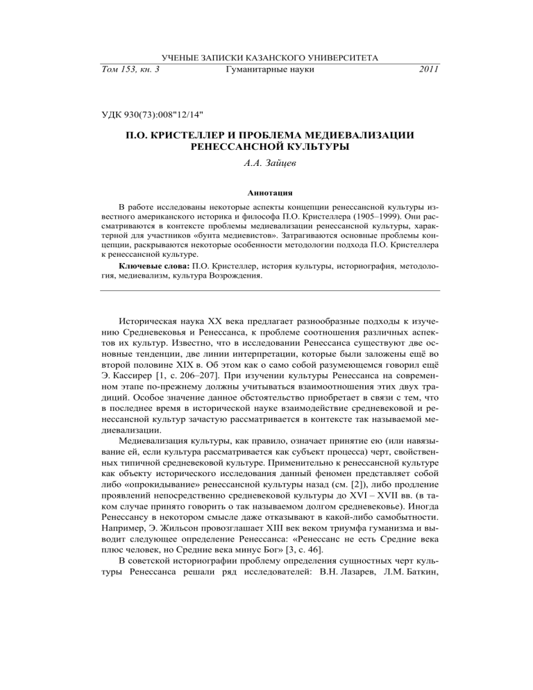 УЧЕНЫЕ ЗАПИСКИ КАЗАНСКОГО УНИВЕРСИТЕТА Том 153, кн. 3 Гуманитарные науки 2011 УДК 930(73):008"12/14" П.О. КРИСТЕЛЛЕР И ПРОБЛЕМА МЕДИЕВАЛИЗАЦИИ РЕНЕССАНСНОЙ КУЛЬТУРЫ А.А. Зайцев Аннотация В работе исследованы некоторые аспекты концепции ренессансной культуры известного американского историка и философа П.О. Кристеллера (1905–1999). Они рассматриваются в контексте проблемы медиевализации ренессансной культуры, характерной для участников «бунта медиевистов». Затрагиваются основные проблемы концепции, раскрываются некоторые особенности методологии подхода П.О. Кристеллера к ренессансной культуре. Ключевые слова: П.О. Кристеллер, история культуры, историография, методология, медиевализм, культура Возрождения. Историческая наука XX века предлагает разнообразные подходы к изучению Средневековья и Ренессанса, к проблеме соотношения различных аспектов их культур. Известно, что в исследовании Ренессанса существуют две основные тенденции, две линии интерпретации, которые были заложены ещё во второй половине XIX в. Об этом как о само собой разумеющемся говорил ещё Э. Кассирер [1, с. 206–207]. При изучении культуры Ренессанса на современном этапе по-прежнему должны учитываться взаимоотношения этих двух традиций. Особое значение данное обстоятельство приобретает в связи с тем, что в последнее время в исторической науке взаимодействие средневековой и ренессансной культур зачастую рассматривается в контексте так называемой медиевализации. Медиевализация культуры, как правило, означает принятие ею (или навязывание ей, если культура рассматривается как субъект процесса) черт, свойственных типичной средневековой культуре. Применительно к ренессансной культуре как объекту исторического исследования данный феномен представляет собой либо «опрокидывание» ренессансной культуры назад (см. [2]), либо продление проявлений непосредственно средневековой культуры до XVI – XVII вв. (в таком случае принято говорить о так называемом долгом средневековье). Иногда Ренессансу в некотором смысле даже отказывают в какой-либо самобытности. Например, Э. Жильсон провозглашает XIII век веком триумфа гуманизма и выводит следующее определение Ренессанса: «Ренессанс не есть Средние века плюс человек, но Средние века минус Бог» [3, с. 46]. В советской историографии проблему определения сущностных черт культуры Ренессанса решали ряд исследователей: В.Н. Лазарев, Л.М. Баткин, П.О. КРИСТЕЛЛЕР И МЕДИЕВАЛИЗАЦИЯ РЕНЕССАНСНОЙ КУЛЬТУРЫ 241 А.Х. Горфункель, А.Ф. Лосев и др. Поскольку в отечественной науке главенствующая тенденция в определении сущности Ренессанса в целом являлась продолжением линии Буркхардта, идеи, порождённые «бунтом медиевистов», находили в основном лишь критику и чаще всего отвергались. В связи с этим можно отметить некоторую одномерность восприятия Ренессанса в российской науке советского периода и даже последних десятилетий. Отечественным исследователям необходимо обратить внимание на опыт зарубежной историографии, поскольку дискуссия сторонников и противников медиевализма об интерпретации сущности ренессансной культуры получила за границей более полное развитие. Обращение к зарубежной историографии в российской традиции ренессансоведения носит обязательный характер. Восприятием европейской историографической классики, постоянным диалогом с неме