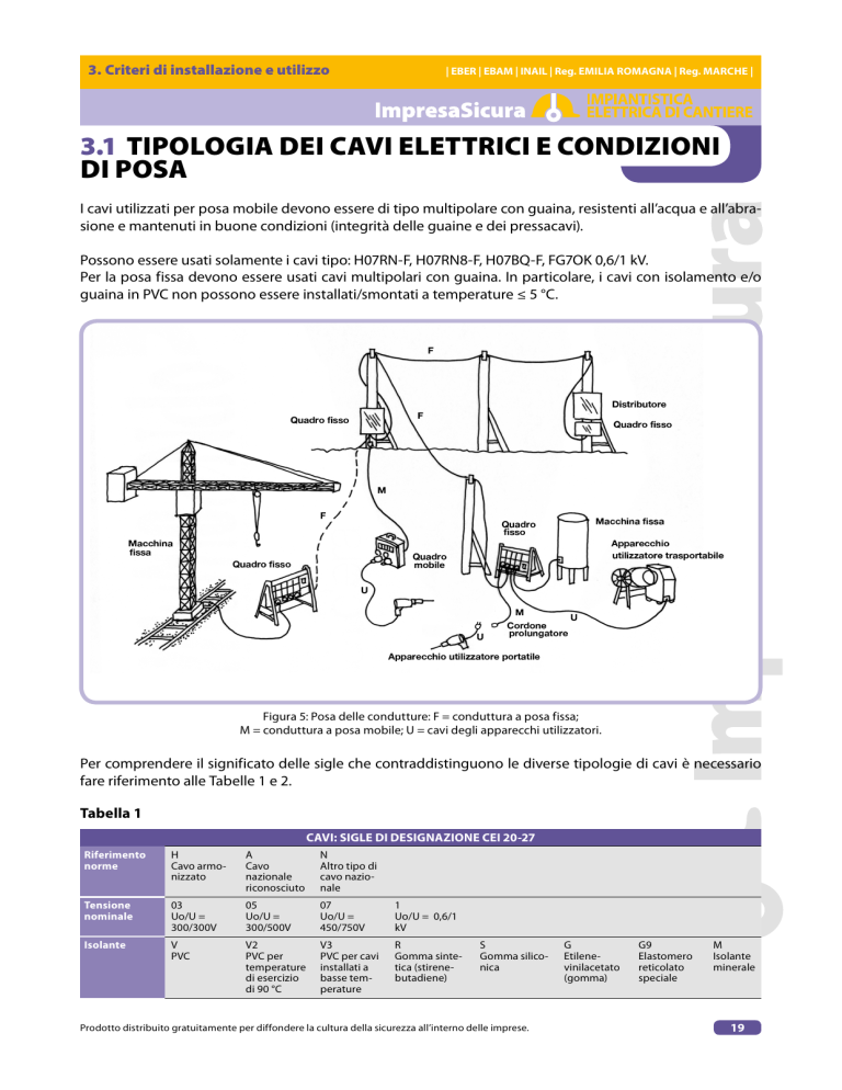 3. Criteri di installazione e utilizzo | EBER | EBAM | INAIL | Reg. EMILIA ROMAGNA | Reg. MARCHE | 3.1 TIPOLOGIA DEI CAVI ELETTRICI E CONDIZIONI DI POSA I cavi utilizzati per posa mobile devono essere di tipo multipolare con guaina, resistenti all’acqua e all’abrasione e mantenuti in buone condizioni (integrità delle guaine e dei pressacavi). Possono essere usati solamente i cavi tipo: H07RN-F, H07RN8-F, H07BQ-F, FG7OK 0,6/1 kV. Per la posa fissa devono essere usati cavi multipolari con guaina. In particolare, i cavi con isolamento e/o guaina in PVC non possono essere installati/smontati a temperature ≤ 5 °C. Figura 5: Posa delle condutture: F = conduttura a posa fissa; M = conduttura a posa mobile; U = cavi degli apparecchi utilizzatori. Per comprendere il significato delle sigle che contraddistinguono le diverse tipologie di cavi è necessario fare riferimento alle Tabelle 1 e 2. Tabella 1 CAVI: SIGLE DI DESIGNAZIONE CEI 20-27 Riferimento norme H Cavo armonizzato A Cavo nazionale riconosciuto N Altro tipo di cavo nazionale Tensione nominale 03 Uo/U = 300/300V 05 Uo/U = 300/500V 07 Uo/U = 450/750V 1 Uo/U = 0,6/1 kV Isolante V PVC V2 PVC per temperature di esercizio di 90 °C V3 PVC per cavi installati a basse temperature R Gomma sintetica (stirenebutadiene) S Gomma siliconica Prodotto distribuito gratuitamente per diffondere la cultura della sicurezza all’interno delle imprese. G Etilenevinilacetato (gomma) G9 Elastomero reticolato speciale M Isolante minerale 19 3. Criteri di installazione e utilizzo 1. Tipologia dei cavi elettrici e condizioni di posa | EBER | EBAM | INAIL | Reg. EMILIA ROMAGNA | Reg. MARCHE | Rivestimenti metallici A Conduttore concentrico di alluminio C Conduttore concentrico di rame C4 Schermo a treccia di rame C7 Schermo di rame (fili,piattine o nastri) Guaina V PVC V2 PVC per temperature di esercizio di 90 °C V3 PVC per cavi installati a basse temperature R Gomma sintetica (stirenebutadiene) Organi portanti D2 Fili tessili o di acciaio sull’insieme delle anime o sulla guaina D3 Componenti tessili o metallici posti al centro del cavo D5 Riempitivo centrale Costruzione speciale H Cavi piatti o divisibili, con o senza guaina H2 Cavi piatti non divisibili H5 Cavi con anime cordate a spirale visibile H6 Cavi piatti con 3 o più anime Conduttore U Conduttore a filo unico R Conduttore a corda rigida K Conduttore a corda flessibile per posa fissa F Conduttore a corda flessibile per posa mobile N Policloroprene (PCP) J Treccia di fibra di vetro T Treccia tessile sull’insieme delle anime T6 Treccia tessile sulle singole anime H Conduttore flessibilissimo Esempio di cavo con relativa designazione: H07RN8-F CAVO PER POMPE (SUBMERSIBLE PUMP CABLE) CAVI PER ENERGIA FLESSIBILI ISOLATI IN GOMMA RESISTENTI ALL'ACQUA CON GUAINA SPECIALE ENERGY TRANSMISSION WATER RESISTANT RUBBER INSULATED CABLES WITH SPECIAL SHEATH (Conforme alla direttiva BT 2006/95/CE - Direttiva RoHS: 2002/95/CE) Norme di riferimento (Accordingly to the standards BT 2006/95/EC- RoHS: 2002/95/EC) Standards CEI 20-19/16 CENELEC HD 22.16 S4 BS 7919:2001 NF C 32-102-16 VDE 0282-16 CEI 20-35 (EN60332-1-2) BS EN 60332-1-2 NF EN 60332-1-2 DIN EN 60332-1-2 Conduttore flessibile di rame rosso ricotto classe 5. Isolante in mescola elastomerica qualità EI4. Guaina in poliicloroprene qualità EM2. Tensione nominale U0 Tensione nominale U Tensione di prova Tensione massima Um Temperatura massima di esercizio Temperatura massima di corto circuito Temperatura minima di esercizio (senza shock meccanico) Temperatura minima di installazione e maneggio Flexible conductor, class 5 copper made. Elastomeric mixture Insulation in EI4 quality. Polychloroprene sheath, EM2. 450 V 750 V 2500 V 1000V Installazioni Fisse / for fixed and protected installation +60°C +200°C -40°c -25°C Nominal voltage U0 Nominal voltage U Test voltage Maximun voltage Um Maximun operating temperature Maximun short circuit temperature Min. operating temperature (without mechanical shocks) Minimum installation and use temperature Condizioni di impiego piu comuni Common features Particolarmente indicati per collegamenti di pompe sommerse o nei casi in cui Particularly suited for connecting submarged pumps and cases in which the i l cavo venga installato permanentemente in acqua, all'aria libera in officine cable is permanently under water, in open air, in workshops with an explosive Prodotto distribuito gratuitamente per diffondere cultura della sicurezza all’interno delleWhen imprese. con atmosfera esplosiva. Per collegamenti la soggetti a sollecitazioni athmosphere. used for connections they are subjected to medium meccaniche medie come apparecchiature in officine industriali e agricole, mechanical stress as: equipments in industrials and agricoltural workshops, grossi bollitori, piastre di riscaldamento, lampade portatili, utensili elettrici quali great boilers, heating plates, portable lamps, electric tools as drills, circular trapani, seghe circolari ecc. utensili elettrici domestici come motori o saws and so on, electric home-tools, motors or trasportable generators in generatori trasportabili in cantieri edili o di impianti agricoli. Anche per construction sites or agricultural plants, and so on. It can be used even in installazioni fisse come pavimenti e ripiani di cantieri provvisori.Resistenti fixed layings like floors and temporary construction site set offs ect.Ozono 20 3. Criteri di installazione e utilizzo 1. Tipologia dei cavi elettrici e condizioni di posa | EBER | EBAM | INAIL | Reg. EMILIA ROMAGNA | Reg. MARCHE | Tabella 2 CAVI: SIGLE DI DESIGNAZIONE UNEL 35011 Conduttore U Conduttore a filo unico R conduttore a corda rigida F conduttore a corda flessibile FF Conduttore a corda flessibilissima T Conduttore telefonico Isolante R PVC R2 PVC di qualità superiore (R2) R3 PVC per temperature fino a 105 °C G Elastomero reticolato G1 Gomma sintetica G2 Gomma butilica G4 Gomma siliconica G7 Gomma etilenpropilenica ad alto modulo