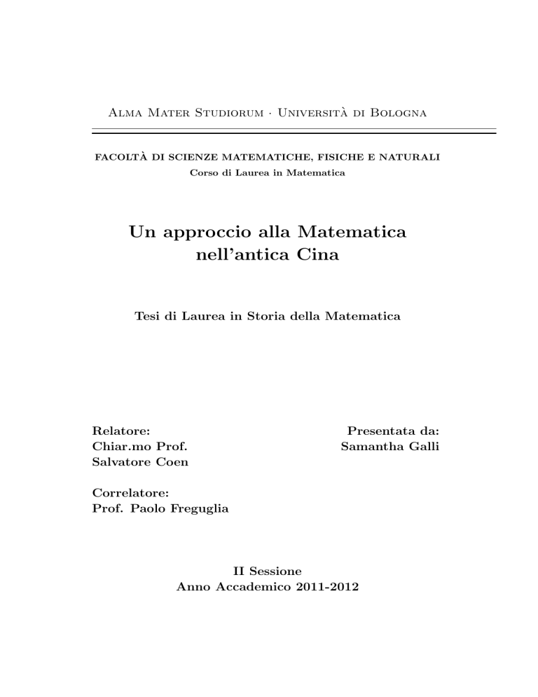 Scopo della seguente tesi é quello di illustrare a grandi linee alcune conoscenze dell’antica matematica cinese, riportando peró anche alcune informazioni sull’introduzione della matematica occidentale in Cina nel XVII secolo.