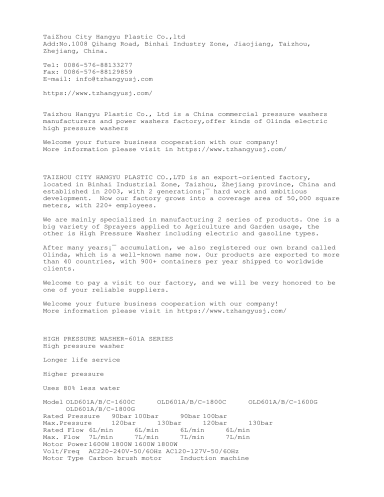 TaiZhou City Hangyu Plastic Co.,ltd Add:No.1008 Qihang Road, Binhai Industry Zone, Jiaojiang, Taizhou, Zhejiang, China. Tel: 0086-576-88133277 Fax: 0086-576-88129859 E-mail: [email protected] https://www.tzhangyusj.com/ Taizhou Hangyu Plastic Co., Ltd is a China commercial pressure washers manufacturers and power washers factory,offer kinds of Olinda electric high pressure washers Welcome your future business cooperation with our company! More information please visit in https://www.tzhangyusj.com/ TAIZHOU CITY HANGYU PLASTIC CO.,LTD is an export-oriented factory, located in Binhai Industrial Zone, Taizhou, Zhejiang province, China and established in 2003, with 2 generations¡¯ hard work and ambitious development. Now our factory grows into a coverage area of 50,000 square meters, with 220+ employees. We are mainly specialized in manufacturing 2 series of products. One is a big variety of Sprayers applied to Agriculture and Garden usage, the other is High Pressure Washer including electric and gasoline types. After many years¡¯ accumulation, we also registered our own brand called Olinda, which is a well-known name now. Our products are exported to more than 40 countries, with 900+ containers per year shipped to worldwide clients. Welcome to pay a visit to our factory, and we will be very honored to be one of your reliable suppliers. Welcome your future business cooperation with our company! More information please visit in https://www.tzhangyusj.com/ HIGH PRESSURE WASHER-601A SERIES High pressure washer Longer life service Higher pressure Uses 80% less water ModelOLD601A/B/C-1600COLD601A/B/C-1800COLD601A/B/C-1600GOLD601A/B/C-1800G Rated Pressure90bar100bar90bar100bar Max.Pressure120bar130bar120bar130bar Rated Flow6L/min6L/min6L/min6L/min Max. Flow7L/min7L/min7L/min7L/min Motor Power1600W1800W1600W1800W Volt/FreqAC220-240V-50/6OHz AC120-127V-50/6OHz Motor TypeCarbon brush motorInduction machine Product size353x282x781mm353x282x781mm Carton Size340 x 315 x 505mm340 x 315 x 505mm N.W./G. W7.4 / 8.5kg7.7 / 9.4kg16 / 18kg17.5/ 20kg ELECTRIC SPRAYER-OLD-16L-01 ELECTRIC SPRAYER SERIES Have any questions on our products? Want to order a spare part? You product no longer works as well as when you first bought ? ModelOLD-16L-01 Capacity16L Carton Size38.2x21x49.5cm Battery12V,8AH/12AH Motor Pump3.1L/3.6L/4.0L Charger1.0A/1.7A