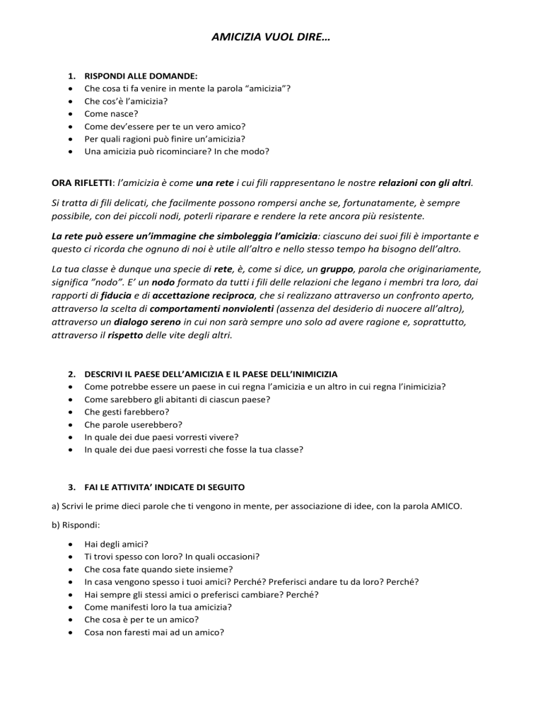 AMICIZIA VUOL DIRE… 1. RISPONDI ALLE DOMANDE: Che cosa ti fa venire in mente la parola “amicizia”? Che cos’è l’amicizia? Come nasce? Come dev’essere per te un vero amico? Per quali ragioni può finire un’amicizia? Una amicizia può ricominciare? In che modo? ORA RIFLETTI: l’amicizia è come una rete i cui fili rappresentano le nostre relazioni con gli altri. Si tratta di fili delicati, che facilmente possono rompersi anche se, fortunatamente, è sempre possibile, con dei piccoli nodi, poterli riparare e rendere la rete ancora più resistente. La rete può essere un’immagine che simboleggia l’amicizia: ciascuno dei suoi fili è importante e questo ci ricorda che ognuno di noi è utile all’altro e nello stesso tempo ha bisogno dell’altro. La tua classe è dunque una specie di rete, è, come si dice, un gruppo, parola che originariamente, significa ”nodo”. E’ un nodo formato da tutti i fili delle relazioni che legano i membri tra loro, dai rapporti di fiducia e di accettazione reciproca, che si realizzano attraverso un confronto aperto, attraverso la scelta di comportamenti nonviolenti (assenza del desiderio di nuocere all’altro), attraverso un dialogo sereno in cui non sarà sempre uno solo ad avere ragione e, soprattutto, attraverso il rispetto delle vite degli altri. 2. DESCRIVI IL PAESE DELL’AMICIZIA E IL PAESE DELL’INIMICIZIA Come potrebbe essere un paese in cui regna l’amicizia e un altro in cui regna l’inimicizia? Come sarebbero gli abitanti di ciascun paese? Che gesti farebbero? Che parole userebbero? In quale dei due paesi vorresti vivere? In quale dei due paesi vorresti che fosse la tua classe? 3. FAI LE ATTIVITA’ INDICATE DI SEGUITO a) Scrivi le prime dieci parole che ti vengono in mente, per associazione di idee, con la parola AMICO. b) Rispondi: Hai degli amici? Ti trovi spesso con loro? In quali occasioni? Che cosa fate quando siete insieme? In casa vengono spesso i tuoi amici? Perché? Preferisci andare tu da loro? Perché? Hai sempre gli stessi amici o preferisci cambiare? Perché? Come manifesti loro la tua amicizia? Che cosa è per te un amico? Cosa non faresti mai ad un amico? Questionario di autovalutazione Questa attività ti è sembrata interessante? Perché sì / perché no. Quale parte del lavoro ti è sembrata più interessante? Perché? Che cosa hai imparato in più rispetto all’amicizia? ASCOLTA LA CANZONE E RIFLETTI SUL TESTO L’AMICIZIA L’amicizia vuol dire chiamarsi fratelli guardare nella stessa direzione l’amicizia sincera è un grande dono il più raro che c’è l’amicizia sincera è un grande dono il più caro che c’è. Io ti picchierò per ogni tua vigliaccheria ma per quelle liti morirò di nostalgia tu sarai di casa nel mio cuore e a casa mia amerò la donna che non ci dividerà spero che mio figlio con tua figlia si sposerà. L’amicizia vuol dire chiamarsi fratelli guardare nella stessa direzione l’amicizia sincera è un grande dono il più raro che c’è, l’amicizia sincera è un grande dono il più caro che c’è”. —————————————————- Herbert Pagani, L’amicizia – 5:29 Album: Amicizia (1969)
