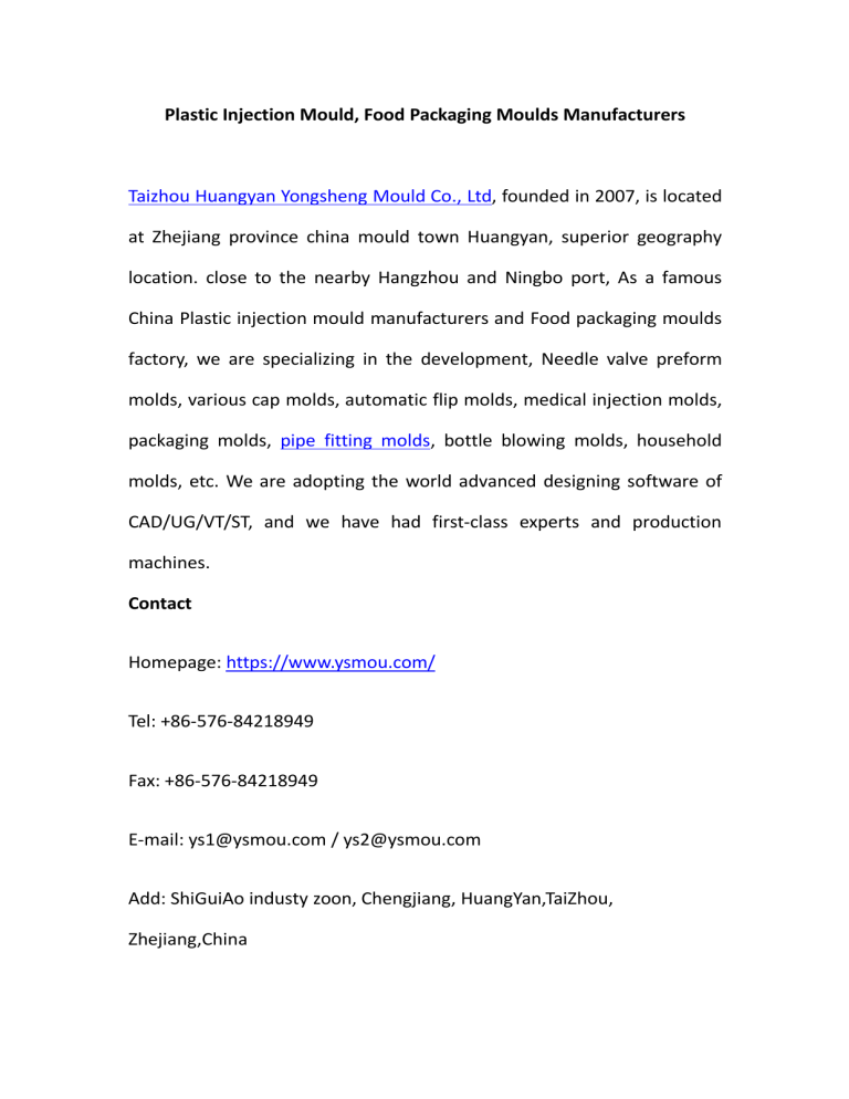 Plastic Injection Mould, Food Packaging Moulds Manufacturers Taizhou Huangyan Yongsheng Mould Co., Ltd, founded in 2007, is located at Zhejiang province china mould town Huangyan, superior geography location. close to the nearby Hangzhou and Ningbo port, As a famous China Plastic injection mould manufacturers and Food packaging moulds factory, we are specializing in the development, Needle valve preform molds, various cap molds, automatic flip molds, medical injection molds, packaging molds, pipe fitting molds, bottle blowing molds, household molds, etc. We are adopting the world advanced designing software of CAD/UG/VT/ST, and we have had first-class experts and production machines. Contact Homepage: https://www.ysmou.com/ Tel: +86-576-84218949 Fax: +86-576-84218949 E-mail: [email protected] / [email protected] Add: ShiGuiAo industy zoon, Chengjiang, HuangYan,TaiZhou, Zhejiang,China