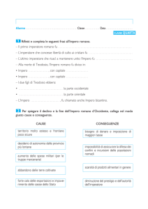 RI A storia gecon oS TO La nostra 2 DALL’IMPERO ROMANO ALL’ANNO MILLE raccontata da Alessandro Barbero Sandro Carocci e Editori Laterza raccontata da ge oS co n nostra TO RI A storia La 2 DALL’IMPERO ROMANO ALL’ANNO MILLE Alessandro Barbero Sandro Carocci e Editori Laterza © 2012, Gius. Laterza & Figli, Roma-Bari Prima edizione 2012 Le schede Geostoria sono a cura di Laura Rizzo. Gli Apparati didattici sono a cura di Gianluca Bellini. L’Editore è a disposizione di tutti gli eventuali proprietari di diritti sulle immagini riprodotte, nel caso non si fosse riusciti a reperirli per chiedere debita autorizzazione. Le fotocopie per uso personale del lettore possono essere effettuate nei limiti del 15% di ciascun volume dietro pagamento alla SIAE del compenso previsto dall’art. 68, commi 4 e 5, della legge 22 aprile 1941 n. 633. Le fotocopie effettuate per finalità di carattere professionale, economico o commerciale o comunque per uso diverso da quello personale possono essere effettuate a seguito di specifica autorizzazione rilasciata da CLEARedi, Centro Licenze e Autorizzazioni per le Riproduzioni Editoriali, Corso di Porta Romana 108, 20122 Milano, e-mail: [email protected], sito web: www.clearedi.org. Copertina e progetto grafico a cura di Silvia Placidi / Grafica Punto Print s.r.l. ISBN 978-88-421-1109-2 Editori Laterza Piazza Umberto I, 54 70121 Bari e-mail: [email protected] http://www.laterza.it Questo prodotto è stato realizzato nel rispetto delle regole stabilite dal Sistema di gestione qualità conforme ai requisiti ISO 9001:2008 valutato da Certi W e coperto dal certificato numero IT.12.0160.QMS Indice del volume PARTE V L’impero greco-romano Cap. 12 Cesare e Augusto: la nascita del principato E V E N T I E P R O TA G O N I S T I 1. Il primo triumvirato La disfatta dimenticata: Carre 2. La seconda guerra civile e la dittatura di Cesare 3. La terza guerra civile e l’ascesa di Ottaviano, il futuro Augusto Il corpo di Cesare 4. Restaurazione e rivoluzione: Augusto al potere 5. Parole importanti 4 6 7 9 10 12 15 I S T I T U Z I O N I , S O C I E T A , C U LT U R E 6. 7. 8. 9. Cesare e la conquista della Gallia Il governo di Augusto La politica estera di Augusto Cultura, morale e propaganda politica sotto Augusto La voce del passato Le Res gestae di Augusto 10.Dare figli allo Stato 11. Matrimonio e sessualità fra repubblica e impero Cittadinanza Il mistero della dote Sintesi Esercizi 16 19 21 23 26 27 28 30 32 33 Cap. 13 Il consolidamento e l’apogeo dell’impero E V E N T I E P R O TA G O N I S T I 1. Stabilità, pace e difficoltà di successione 2. La dinastia giulio-claudia 3. La dinastia flavia 4. I cosiddetti Antonini o imperatori adottivi 5. La romanizzazione dell’impero 36 37 42 51 53 La data di nascita di Cristo I S T I T U Z I O N I , S O C I E T A , C U LT U R E 7. Impero e buongoverno 46 57 I liberti 58 8. Città e civiltà 59 9. Gli eserciti dell’imperatore 62 La voce del passato Le scritte sui muri 62 10.Ricchezza delle province, decadenza dell’Italia 65 48 66 43 Cittadinanza Romanizzazione antica e colonialismo moderno 6. La nascita del cristianesimo I ghiacciai della Groenlandia e il dibattito sull’economia antica Indice del volume III 11. Panem et circenses: come conquistare il popolo I gladiatori PARTE VI Altri mondi Cina, India e Africa al tempo 67 68 dell’impero romano Sintesi Esercizi 70 72 73 La tarda Antichità Cap. 14 Dalla crisi del III secolo alle riforme di Diocleziano E V E N T I E P R O TA G O N I S T I 1. Le cause della crisi 2. La dinastia dei Severi Tutti uguali davanti alla legge? 3. L’anarchia militare La voce del passato Un imperatore schiavo 4. La ripresa dell’impero e Diocleziano 80 81 82 84 86 90 I S T I T U Z I O N I , S O C I E T A , C U LT U R E 5. Le persecuzioni dei cristiani 94 6. I problemi finanziari e monetari dell’impero 97 7. Le riforme di Diocleziano 98 Cittadinanza Le tasse 100 8. Diocleziano e la riforma dell’esercito 102 9. Diversità regionali 103 Le Mura aureliane 104 Sintesi 107 Esercizi 108 Le catacombe 93 Cap. 15 Il secolo di Costantino E V E N T I E P R O TA G O N I S T I 1. L’età di Costantino 112 L’editto di Milano 113 2. Dai figli di Costantino a Valentiniano e Valente 116 I S T I T U Z I O N I , S O C I E T A , C U LT U R E 3. Il cristianesimo non più perseguitato, ma diviso Cittadinanza I privilegi del clero PARTE VII 118 120 4. La nascita del monachesimo 5. La moneta e il fisco La voce del passato Le monete di Costantino 121 123 124 Sintesi Esercizi 125 126 128 130 131 6. L’immigrazione verso l’impero e la barbarizzazione dell’esercito 7. Il colonato 8. La provincializzazione dell’Italia Il mondo romano-barbarico Cap. 16 Le invasioni barbariche E V E N T I E P R O TA G O N I S T I 1. L’invasione gotica del 376 e le sue conseguenze 2. L’età di Stilicone e Alarico IV Indice del volume 136 139 La voce del passato Il pericolo barbarico 3. Dalla nascita dei regni romano-barbarici alla deposizione di Romolo Augustolo 142 143 I S T I T U Z I O N I , S O C I E T A , C U LT U R E 4. Perché finì il mondo antico? La tesi Pirenne 5. La Chiesa e le controversie religiose Cittadinanza La religione di Stato 146 148 150 152 6. L’etnogenesi, ossia la nascita dei popoli 7. La testimonianza dell’archeologia 154 156 La voce del passato La tomba di un capo franco 156 Altri mondi India e Cina dal III al VI secolo 158 Sintesi 160 Esercizi 161 Cap. 17 I regni romano-barbarici E V E N T I E P R O TA G O N I S T I 1. Dalla deposizione di Romolo Augustolo alla morte di Teodorico 2. L’età di Giustiniano Il Corpus Iuris Civilis 164 167 168 La “questione longobarda” 172 175 176 3. L’invasione longobarda dell’Italia e il papato di Gregorio Magno 4. L’Occidente tra VII e VIII secolo I S T I T U Z I O N I , S O C I E T A , C U LT U R E 5. Da funzionari dell’imperatore a re indipendenti 6. Fra civiltà romana e cultura barbarica PARTE VIII 178 180 La moneta dei re barbari 7. Le