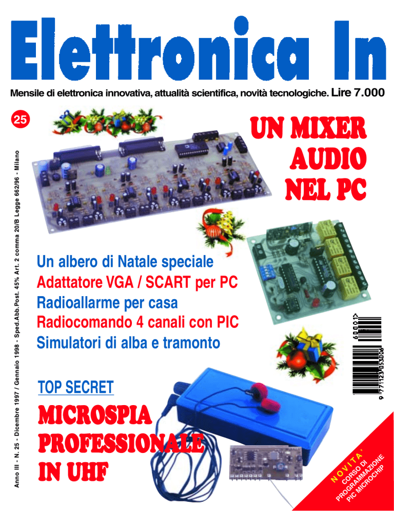 Mensile di elettronica innovativa, attualità scientifica, novità tecnologiche. Lire 7.000 UN MIXER AUDIO NEL PC Un albero di Natale speciale Adattatore VGA / SCART per PC Radioallarme per casa Radiocomando 4 canali con PIC Simulatori di alba e tramonto TOP SECRET N MICROSPIA PROFESSIONALE IN UHF PR O O C V PI GR OR I C A S T M M O A IC M D ’ RO AZ I C IO H N IP E Anno III - N. 25 - Dicembre 1997 / Gennaio 1998 - Sped.Abb.Post. Sped.Abb.Post. 45% Ar t. 2 comma 20/B Legg Legg e 662/96 - Milano 25 SOMMARIO ELETTRONICA IN Rivista mensile, anno III n. 25 DICEMBRE 1997 / GENNAIO 1998 Direttore responsabile: Arsenio Spadoni Responsabile editoriale: Carlo Vignati Redazione: Paolo Gaspari, Sandro Reis, Francesco Doni, Andrea Lettieri, Angelo Vignati, Alfio Cattorini, Antonella Mantia, Andrea Silvello, Alessandro Landone, Marco Rossi. DIREZIONE, REDAZIONE, PUBBLICITA’: VISPA s.n.c. v.le Kennedy 98 20027 Rescaldina (MI) telefono 0331-577982 telefax 0331-578200 Abbonamenti: Annuo 10 numeri L. 56.000 Estero 10 numeri L. 120.000 Le richieste di abbonamento vanno inviate a: VISPA s.n.c., v.le Kennedy 98, 20027 Rescaldina (MI) telefono 0331-577982. Distribuzione per l’Italia: SO.DI.P. Angelo Patuzzi S.p.A. via Bettola 18 20092 Cinisello B. (MI) telefono 02-660301 telefax 02-66030320 Stampa: Industria per le Arti Grafiche Garzanti Verga s.r.l. via Mazzini 15 20063 Cernusco S/N (MI) Elettronica In: Rivista mensile registrata presso il Tribunale di Milano con il n. 245 il giorno 3-05-1995. Una copia L. 7.000, arretrati L. 14.000 (effettuare versamento sul CCP n. 34208207 intestato a VISPA snc) (C) 1996 VISPA s.n.c. Spedizione in abbonamento postale 45% - Art.2 comma 20/b legge 662/96 Filiale di Milano. Impaginazione e fotolito sono realizzati in DeskTop Publishing con programmi Quark XPress 3.3 e Adobe Photoshop 3.0 per Windows. Tutti i diritti di riproduzione o di traduzione degli articoli pubblicati sono riservati a termine di Legge per tutti i Paesi. I circuiti descritti su questa rivista possono essere realizzati solo per uso dilettantistico, ne è proibita la realizzazione a carattere commerciale ed industriale. L’invio di articoli implica da parte dell’autore l’accettazione, in caso di pubblicazione, dei compensi stabiliti dall’Editore. Manoscritti, disegni, foto ed altri materiali non verranno in nessun caso restituiti. L’utilizzazione degli schemi pubblicati non comporta alcuna responsabilità da parte della Società editrice. Elettronica In - dicembre ’97 / gennaio ‘98 9 ADATTATORE VGA / SCART PER PC Semplicissimo circuito che consente di visualizzare l’immagine dello schermo di un PC direttamente sul televisore di casa utilizzando la presa SCART. 17 RADIOCOMANDO 4 CANALI CON PIC Ricevitore a 433 MHz con autoapprendimento della codifica: funziona in abbinamento con i ricevitori standard a 4096 combinazioni e dispone di quattro canali canali che possono funzionare in modo astabile o bistabile. 25 GENERATORI DI ALBA E TRAMONTO Variatore elettronico per luci capace di simulare il sorgere ed il calare del sole. Il dispositivo consente di impostare i tempi relativi alle fasi di alba e di tramonto. Proposto nelle versioni a 12 volt e a tensione di rete. 34 MICROSPIA PROFESSIONALE IN UHF Piccolissimo e fedele trasmettitore quarzato operante a 433,75 MHz in FM studiato per funzionare come microspia ambientale. Copre un raggio di circa 100 metri e dispone di un microfono sensibilissimo, completo di compressore dinamico. 43 CORSO DI PROGRAMMAZIONE PER PIC Impariamo a programmare con la famiglia di microcontrollori PIC della Microchip caratterizzata da una grande flessibilità d’uso e da una estrema semplicità di impiego. Quinta puntata. 51 ANTIFURTO CON RADIOALLARME Centralina a 2 zone che in caso di allarme effettua una chiamata in DTMF utilizzando qualsiasi RTX. Il dispositivo prevede anche un circuito per l’ascolto ambientale. Ultima parte. 58 MIXER AUDIO GESTITO DA PC Come realizzare un mixer professionale ad 8 canali mono o 4 stereo controllato da un Personal Computer. Completo di software di gestione scritto in Visual Basic. 67 UN ALBERO DI NATALE SPECIALE Maxi albero con 36 led bicolore in grado di generare numerosi effetti luminosi; possibilità di programmare facilmente qualsiasi tipo di sequenza. Mensile associato all’USPI, Unione Stampa Periodica Italiana Iscrizione al Registro Nazionale della Stampa n. 5136 Vol. 52 Foglio 281 del 7-5-1996. 1 TELECAMERE PROFESSIONALI Compatta telecamera autofocus a colori ad alta risoluzione. Completa TELECAMERA di zoom ottico x22 e digitale x10. Sensore: Sony 1/4”; Risoluzione: 470 Linee TV; Pixel effettivi: 752(H) x 582(V); ZOOM Sensibilità: 3 Lux (F1.6); Zoom ottico: f=3,6 mm/79,2 mm; AGC (Automatic Gain Control); Rapporto S/N: 46 dB, shutter 1/50 - 1/100.000; OSD; Controllo seriale (TTL e RS485) delle funzioni; Alimentazione: 12 Vdc; Assorbimento: 500 mA; Temperatura operativa: -10°C/+50°C. Controllo di tutti i parametri operativi mediante OSD (negativo, B/N o colore, mirror, luminosità, contrasto, auto focus, shutter speed, AGC, SDR, white balance, ecc). Completa di telecontrollo remoto. Telecamera B/N di elevate prestazioni adatta ad impieghi professionali con sensibilita’ di 0,003 Lux e TELECAMERA definizione di 570 linee TV. Puo’ utilizzare ottiche a Speciale telecamera con registratore digitale incorporato completamente diaframma fisso o auto-iris. Dimensioni compatte, con R EGISTRATORE programmabile. A seconda della risoluzione prescelta è possibile memoalimentazione 12 VDC. rizzare da 480 a 3840 frames. Batteria di back-up incorporata. Caratteristiche tecniche: Elemento sensibile: CCD 1/4”; Memoria: 256Mbit SDRAM, VGA & QVGA; Risoluzione: 640x480 o 320x240 pixel/frame; OSD; ELEMENTO SENSIBILE: 1/3” Sony EX-VIEW HAD CCD - SISTEMA: CCIR Sensibilità: 2Lux(F1.2); Ottica grandangolare: f=1,95mm; PIXEL EFFETTIVI: 752 (H) x 582 (V) - RISOLUZIONE: 570 linee TV Apertura angolare: 105°; Uscita video: 1 Vpp/75 Ohm; 