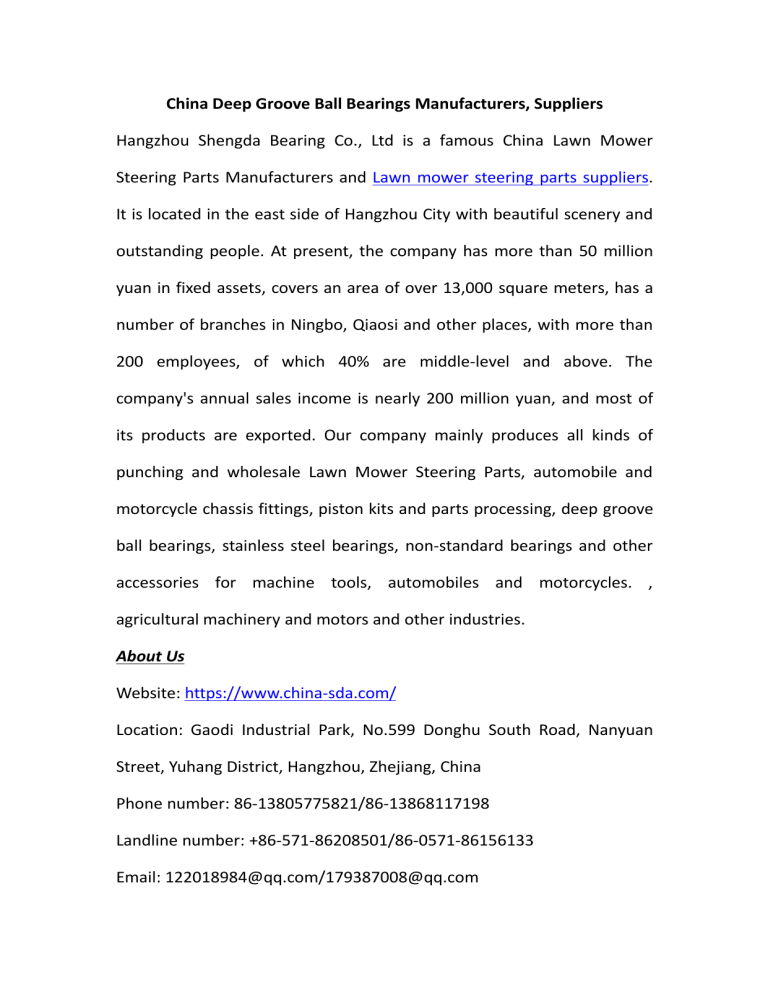 China Deep Groove Ball Bearings Manufacturers, Suppliers Hangzhou Shengda Bearing Co., Ltd is a famous China Lawn Mower Steering Parts Manufacturers and Lawn mower steering parts suppliers. It is located in the east side of Hangzhou City with beautiful scenery and outstanding people. At present, the company has more than 50 million yuan in fixed assets, covers an area of over 13,000 square meters, has a number of branches in Ningbo, Qiaosi and other places, with more than 200 employees, of which 40% are middle-level and above. The company's annual sales income is nearly 200 million yuan, and most of its products are exported. Our company mainly produces all kinds of punching and wholesale Lawn Mower Steering Parts, automobile and motorcycle chassis fittings, piston kits and parts processing, deep groove ball bearings, stainless steel bearings, non-standard bearings and other accessories for machine tools, automobiles and motorcycles. , agricultural machinery and motors and other industries. About Us Website: https://www.china-sda.com/ Location: Gaodi Industrial Park, No.599 Donghu South Road, Nanyuan Street, Yuhang District, Hangzhou, Zhejiang, China Phone number: 86-13805775821/86-13868117198 Landline number: +86-571-86208501/86-0571-86156133 Email: [email protected]/[email protected] Fax: +86-571-86156896