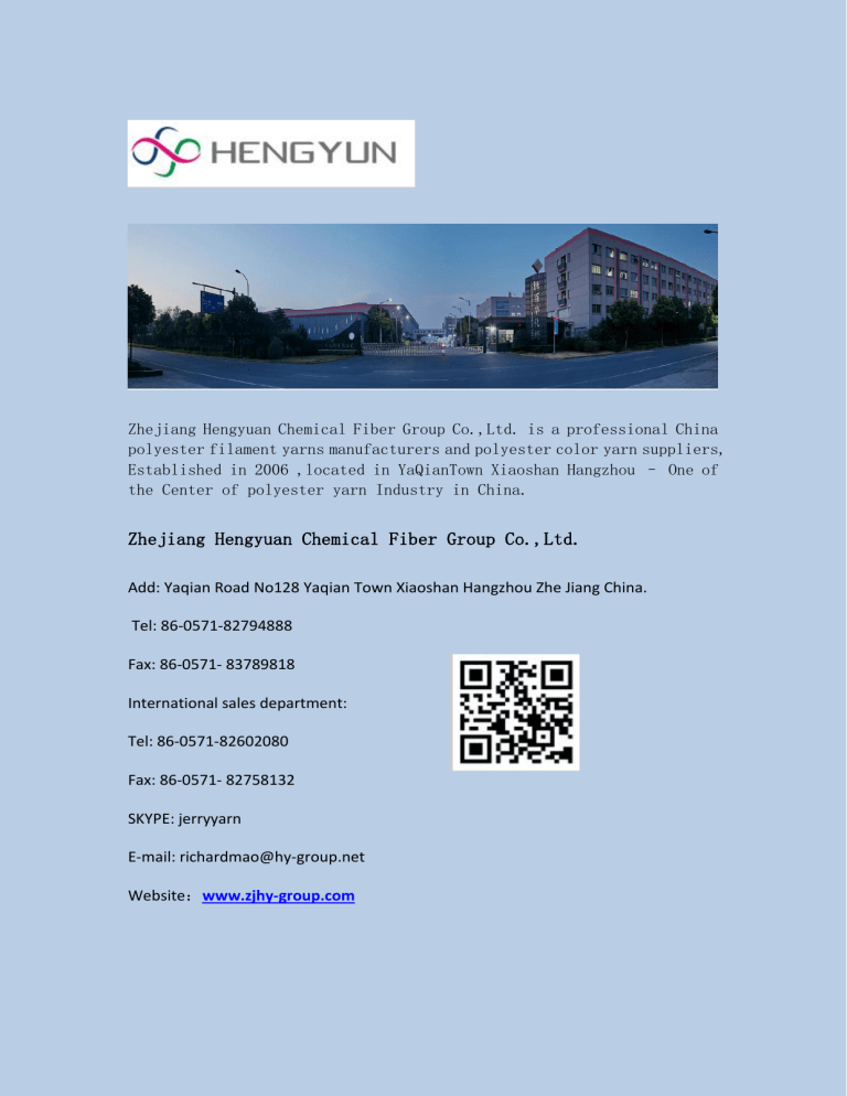 Zhejiang Hengyuan Chemical Fiber Group Co.,Ltd. is a professional China polyester filament yarns manufacturers and polyester color yarn suppliers, Established in 2006 ,located in YaQianTown Xiaoshan Hangzhou – One of the Center of polyester yarn Industry in China. Zhejiang Hengyuan Chemical Fiber Group Co.,Ltd. Add: Yaqian Road No128 Yaqian Town Xiaoshan Hangzhou Zhe Jiang China. Tel: 86-0571-82794888 Fax: 86-0571- 83789818 International sales department: Tel: 86-0571-82602080 Fax: 86-0571- 82758132 SKYPE: jerryyarn E-mail: [email protected] Website:www.zjhy-group.com POY:Polyester silk preliminary orientation, full name: PRE - ORIENTED YARN or PARTIALLY ORIENTED YARN. Receives the orientation degree of high-speed spinning in orientation between the wire and tensile wire not completely stretch of chemical fiber filament. Compared with undrawn yarn, it has a certain degree of orientation, good stability, often used for tensile false twist textured yarn (DTY) special wire. SPEC:50D-600D FDY:FULL synthetic name: fiber the FULL filament DRAW YARN. spin-draw Using system further. Fiber have been fully stretch, can be directly used for textile processing. Purpose:polyester FDY fabrics feel smooth and soft, are widely used in weaving home textile. SPEC:30D-600D circularl and DTY :DRAW TEXTURED YARN, full name: the DRAW TEXTURED YARN. DTY is the use of POY to do the original wire, stretch and false twist deformation processing, tend to exhibit a degree of elasticity and contractility. SPEC:50D-600D Blanket yarn:100%polyester raschel blanket super soft and bright Widely used in super soft blankets, plush, jeans,curtains,etc..SPEC:150D/144F,200D/96F,200D/14 4F,250D/96F,250D/122F,250D/144F,300D/96F 300D/122F,300D/144F,300D/192F,350D/144F, 450D/144F ,450D/192F ,500D/288F Ultra high molecular weight polyethylene(High strength polyethylene fiber) High strength polyethylene fiber, aramid fiber and carbon fiber are considered as three major high ance fibers. Among them, the ultra-high molecular weight polyethylene fiber has high strength, high modulus, corrosion resistance, low temperature resistance, uv resistance low density Which has been wildly applied in military bulletproof, aerospace, marine and ships, sports products and personal protection. Presently, we have seven product series as follow Cutting resistance high strength polyethylene fiber series Bulletproof high strength polyethylene fiber series High strength polyethylene fiber series of ropes High strength polyethylene fiber series of fishing lines High strength polyethylene colored fiber series Cutting resistance covered yarn series Polyethylene cool feeling fiber series Functional yarn series In order to increase yarn functionality and better meet the market demand. the company has developed several functional Polyester flame retardant yam series yarns Polyester antibacterial yarn series 100% Recycled yarn series