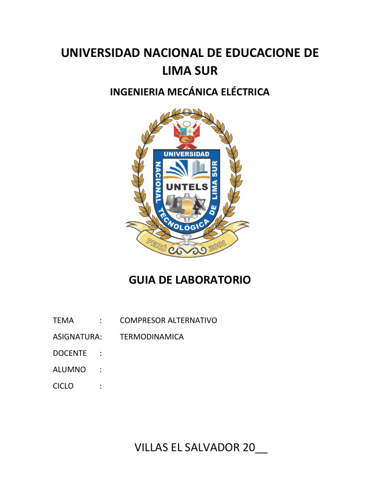 UNIVERSIDAD NACIONAL DE EDUCACIONE DE LIMA SUR INGENIERIA MECÁNICA ELÉCTRICA GUIA DE LABORATORIO TEMA : ASIGNATURA: DOCENTE : ALUMNO : CICLO : COMPRESOR ALTERNATIVO TERMODINAMICA VILLAS EL SALVADOR 20__