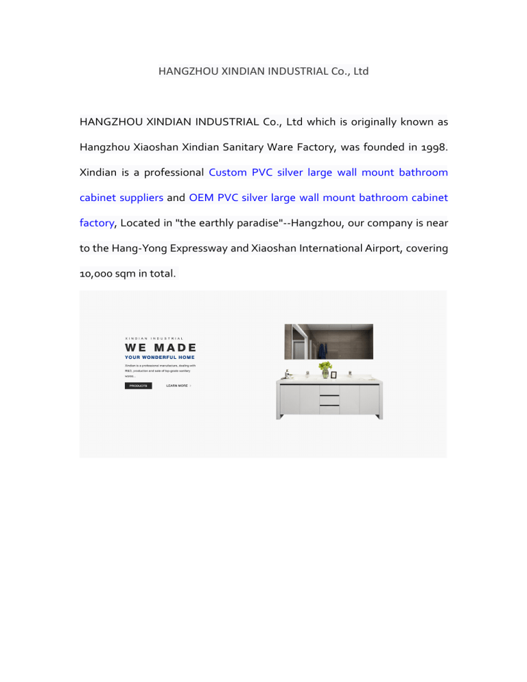 HANGZHOU XINDIAN INDUSTRIAL Co., Ltd HANGZHOU XINDIAN INDUSTRIAL Co., Ltd which is originally known as Hangzhou Xiaoshan Xindian Sanitary Ware Factory, was founded in 1998. Xindian is a professional Custom PVC silver large wall mount bathroom cabinet suppliers and OEM PVC silver large wall mount bathroom cabinet factory, Located in "the earthly paradise"--Hangzhou, our company is near to the Hang-Yong Expressway and Xiaoshan International Airport, covering 10,000 sqm in total. PVC silver large wall mount bathroom cabinet Solid wood modern black square mirror large bathroom cabinet Led bathroom decorative mirror blue ADD:NORTH OF JINGLING ROAD,DANGSHAN TOWN,XIAOSHAN DISTRICT,HANGZHOU CITY,ZHEJIANG,CHINA. Phone: 18768488628 Tel: + 86-0571-82523698 Fax: + 86-0571-82522877 E-mail: [email protected]