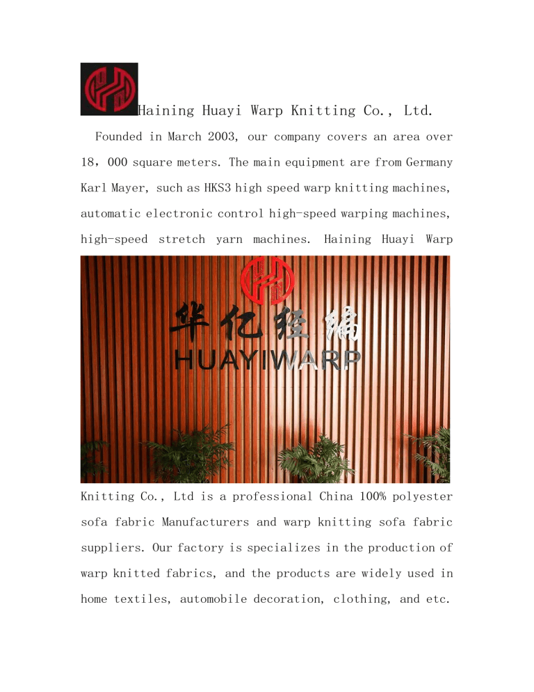 Haining Huayi Warp Knitting Co., Ltd. Founded in March 2003, our company covers an area over 18,000 square meters. The main equipment are from Germany Karl Mayer, such as HKS3 high speed warp knitting machines, automatic electronic control high-speed warping machines, high-speed stretch yarn machines. Haining Huayi Warp Knitting Co., Ltd is a professional China 100% polyester sofa fabric Manufacturers and warp knitting sofa fabric suppliers. Our factory is specializes in the production of warp knitted fabrics, and the products are widely used in home textiles, automobile decoration, clothing, and etc. 1. Customizable Printing Fabric Supply Ability:80000 Meter/Meters per Day cheap upholstery fabric Packaging Details:cheap upholstery sandal sole material paint shoe velvet fabric ;Poly bag with woven bag or as your required. Port:Shanghai Lead Time:1 month Product name GAMA PLUS Specification 300GSM/142CM Craft dye,printing,bonding MOQ 800M 2. Pu Leather Flocking Leather Product name:wide varieties burnout knitting synthetic leather Model Number:HY-0009 Specification:350-500GSM/142CM Craft:dye,printing ,bronzing,bonding MOQ:800m Bag, Car Seat, Chair, Furniture, Use Garment, Shoes, Sofa Thickness 0.9mm Brand Name HNHUAYI Type Synthetic Leather Abrasion-Resistant, Anti-Mildew, Feature Elastic, Waterproof 3.100% Polyester Woven Flocked Fabric For Sofa Product name:MODE Specification:300-420GSM/142CM Craft:dye,bonding MOQ:800M Contact us Tel:+86-18368328456 +86-0573-87715668 E-mail:[email protected] ADD:NO 158 YUNXING ROAD XIEQIAO TOWN ,HAINING,ZHEJIANG,CHINA