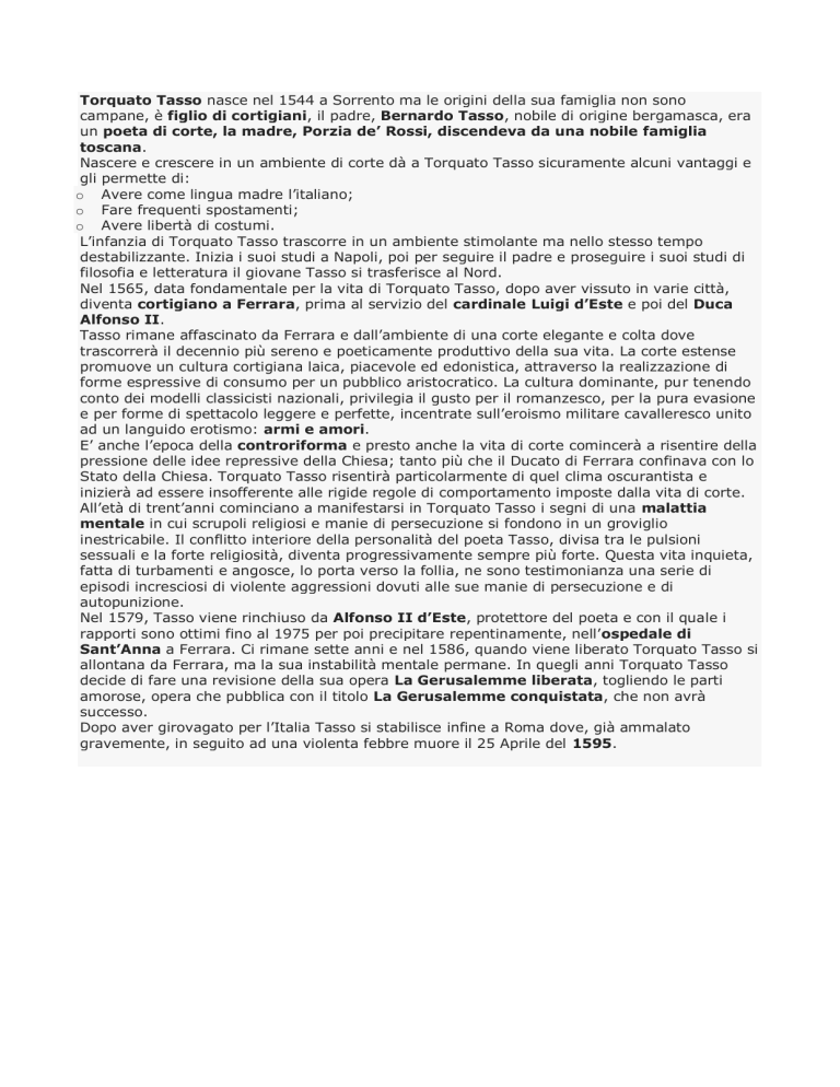 Torquato Tasso nasce nel 1544 a Sorrento ma le origini della sua famiglia non sono campane, è figlio di cortigiani, il padre, Bernardo Tasso, nobile di origine bergamasca, era un poeta di corte, la madre, Porzia de’ Rossi, discendeva da una nobile famiglia toscana. Nascere e crescere in un ambiente di corte dà a Torquato Tasso sicuramente alcuni vantaggi e gli permette di: o Avere come lingua madre l’italiano; o Fare frequenti spostamenti; o Avere libertà di costumi. L’infanzia di Torquato Tasso trascorre in un ambiente stimolante ma nello stesso tempo destabilizzante. Inizia i suoi studi a Napoli, poi per seguire il padre e proseguire i suoi studi di filosofia e letteratura il giovane Tasso si trasferisce al Nord. Nel 1565, data fondamentale per la vita di Torquato Tasso, dopo aver vissuto in varie città, diventa cortigiano a Ferrara, prima al servizio del cardinale Luigi d’Este e poi del Duca Alfonso II. Tasso rimane affascinato da Ferrara e dall’ambiente di una corte elegante e colta dove trascorrerà il decennio più sereno e poeticamente produttivo della sua vita. La corte estense promuove un cultura cortigiana laica, piacevole ed edonistica, attraverso la realizzazione di forme espressive di consumo per un pubblico aristocratico. La cultura dominante, pur tenendo conto dei modelli classicisti nazionali, privilegia il gusto per il romanzesco, per la pura evasione e per forme di spettacolo leggere e perfette, incentrate sull’eroismo militare cavalleresco unito ad un languido erotismo: armi e amori. E’ anche l’epoca della controriforma e presto anche la vita di corte comincerà a risentire della pressione delle idee repressive della Chiesa; tanto più che il Ducato di Ferrara confinava con lo Stato della Chiesa. Torquato Tasso risentirà particolarmente di quel clima oscurantista e inizierà ad essere insofferente alle rigide regole di comportamento imposte dalla vita di corte. All’età di trent’anni cominciano a manifestarsi in Torquato Tasso i segni di una malattia mentale in cui scrupoli religiosi e manie di persecuzione si fondono in un groviglio inestricabile. Il conflitto interiore della personalità del poeta Tasso, divisa tra le pulsioni sessuali e la forte religiosità, diventa progressivamente sempre più forte. Questa vita inquieta, fatta di turbamenti e angosce, lo porta verso la follia, ne sono testimonianza una serie di episodi incresciosi di violente aggressioni dovuti alle sue manie di persecuzione e di autopunizione. Nel 1579, Tasso viene rinchiuso da Alfonso II d’Este, protettore del poeta e con il quale i rapporti sono ottimi fino al 1975 per poi precipitare repentinamente, nell’ospedale di Sant’Anna a Ferrara. Ci rimane sette anni e nel 1586, quando viene liberato Torquato Tasso si allontana da Ferrara, ma la sua instabilità mentale permane. In quegli anni Torquato Tasso decide di fare una revisione della sua opera La Gerusalemme liberata, togliendo le parti amorose, opera che pubblica con il titolo La Gerusalemme conquistata, che non avrà successo. Dopo aver girovagato per l’Italia Tasso si stabilisce infine a Roma dove, già ammalato gravemente, in seguito ad una violenta febbre muore il 25 Aprile del 1595.